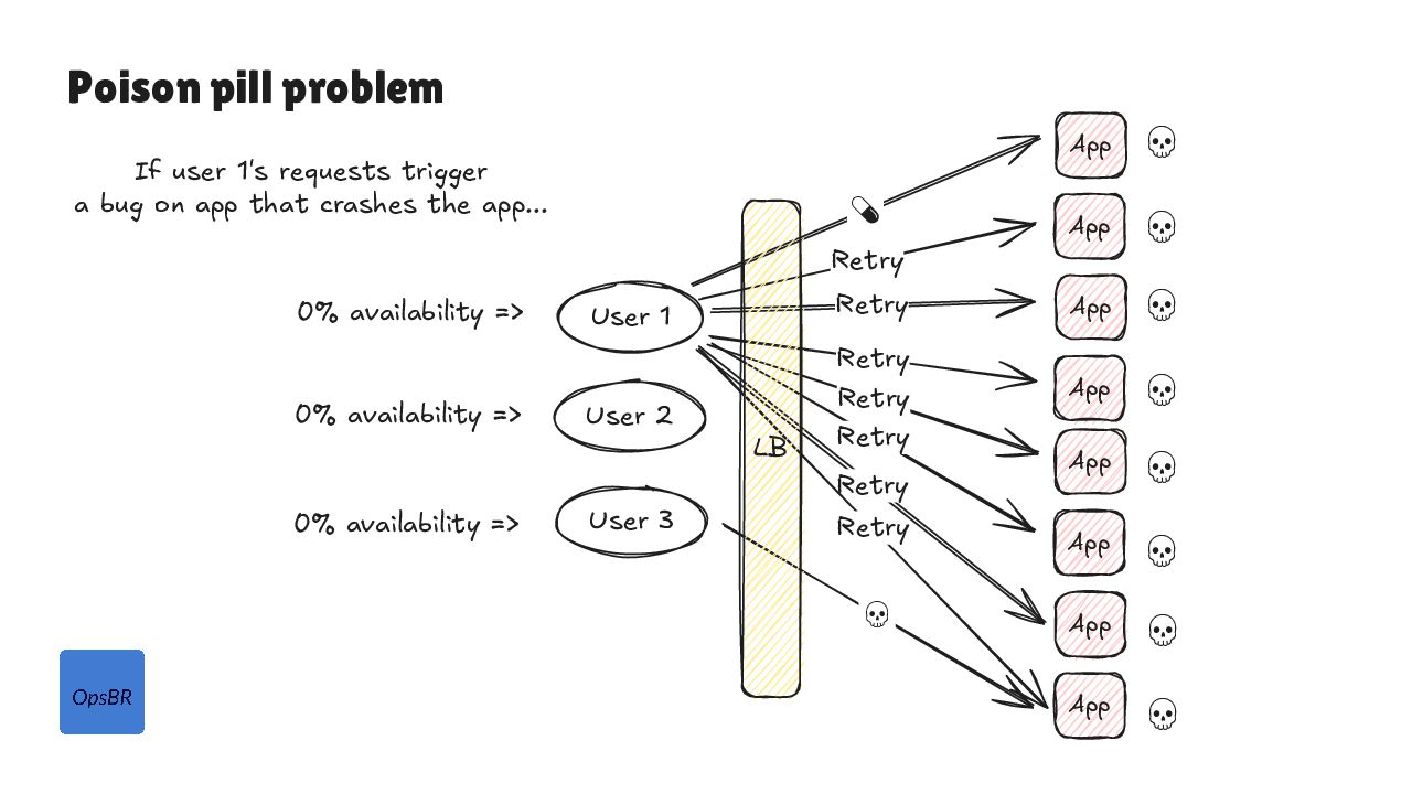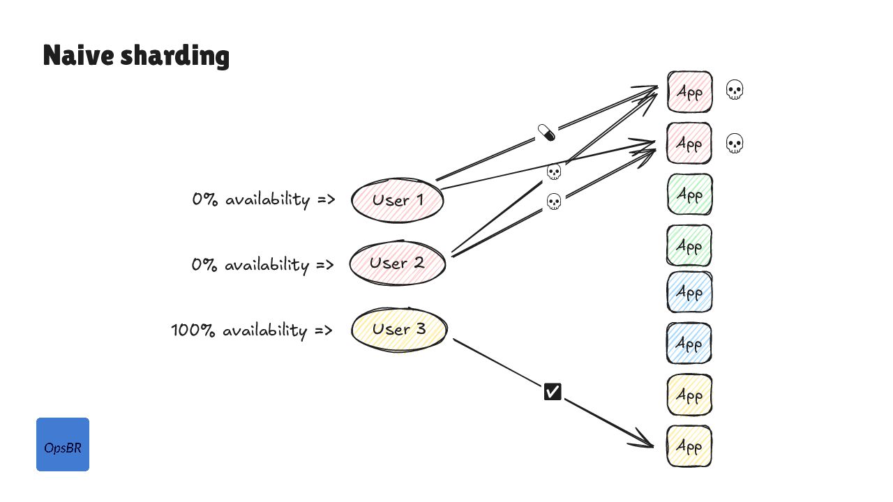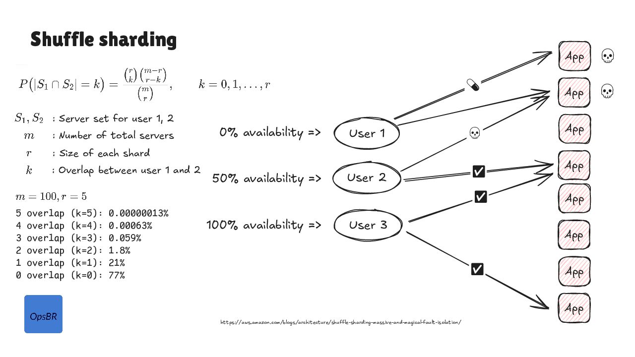 App App App App User 3 💀 Shuffle sharding 💀 ✅ ✅ https://aws.amazon.com/blogs/architecture/shuffle-sharding-massive-and-magical-fault-isolation/ : Server set for user 1, 2 5 overlap (k=5): 0.00000013% 4 overlap (k=4): 0.00063% 3 overlap (k=3): 0.059% 2 overlap (k=2): 1.8% 1 overlap (k=1): 21% 0 overlap (k=0): 77% 💀 50% availability => 100% availability => 0% availability => : Number of total servers : Size of each shard : Overlap between user 1 and 2