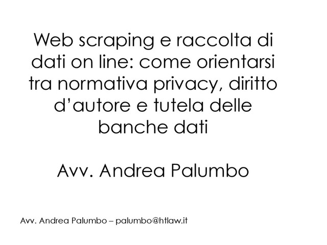 e mi occupo di privacy e diritto delle nuove tecnologie Collaboratore della cattedra di Informatica Giuridica dell’Università di Milano – Bicocca Dottorando presso l’Università di Milano Bicocca con un progetto in tema di riservatezza, privacy e tutela dei dati personali. Avv. Andrea Palumbo