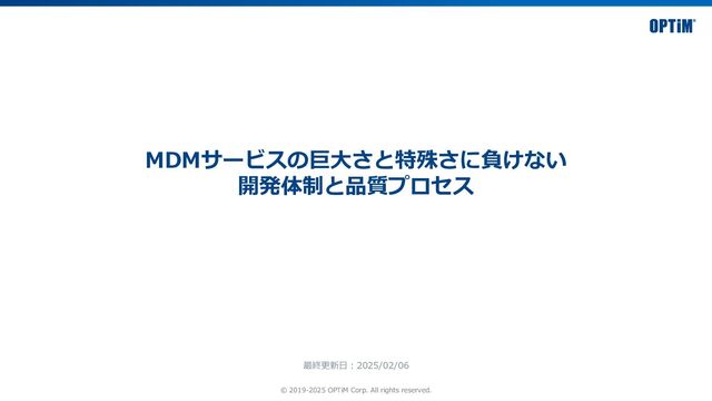 OPTiM Bizは、スマートフォンやタブレットの ビジネス活用における幅広い課題を解決 ー モバイルの可能性を広げるー 180,000社以上 の 圧倒的な導入実績 紛失・盗難・ 情報漏えい対策 資産管理・ 端末監視 セキュリティ設定 端末設定の 効率化 平均解約率 約 0.5% ※3 ※2 PC・モバイル管理SaaSサービス ※1 出典:デロイト トーマツ ミック経済研究所 「クラウドサービス市場の現状と展望 2013年度版」IT資産管理(MDM含む)市場「合計売上高」2011年度~2012年度実績(2013年発刊)、 「コラボレーション/コンテンツ・モバイル管理パッケージソフトの市場展望 2014年度版」MDM市場動向「MDM出荷ID数(SaaS・ASP含む)」2013年度実績(2014年発刊)、 「コラボレーション/コンテンツ・モバイル管理パッケージソ フトの市場展望」MDM市場動向「MDM出荷ID数(SaaS・ASP含む)」2014年度~2017年度実績(2015~2018年発刊)、 「コラボレーション・モバイル管理ソフトの市場展望」MDM市場「MDM出荷ID数(SaaS・ASP含む)」2018年度~ 2023年度実績および2024年度見込(2019年~2024年発刊)より。 ※2 2019年6月25日、当社集計 ※3 主要パートナー実績をもとに当社が算出した月間平均集計期間(2021年4月-2022年3月) ※1
