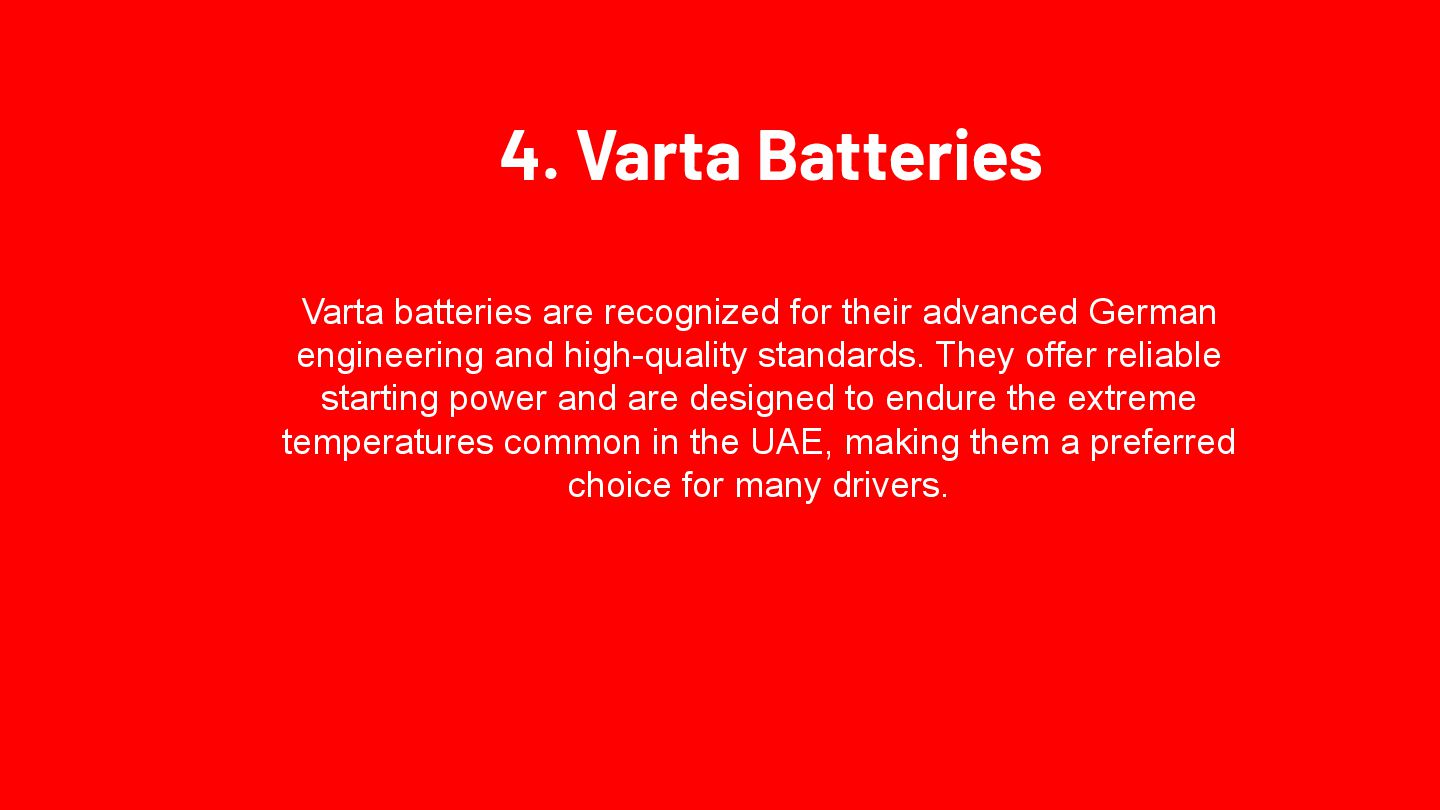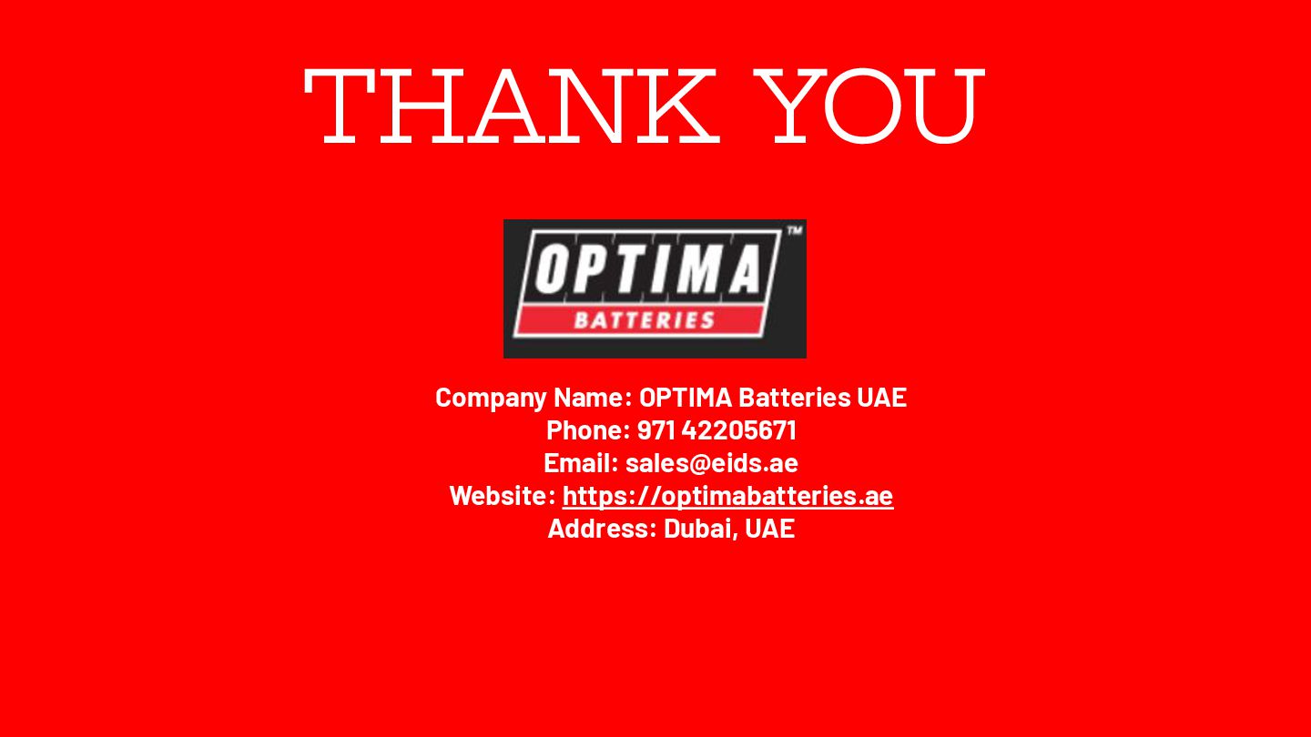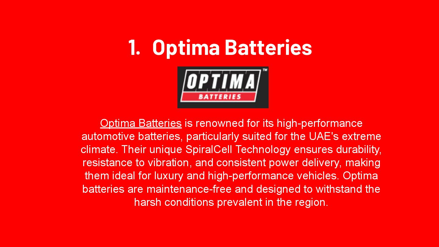 Optima Batteries is renowned for its high-performance automotive batteries, particularly suited for the UAE's extreme climate. Their unique SpiralCell Technology ensures durability, resistance to vibration, and consistent power delivery, making them ideal for luxury and high-performance vehicles. Optima batteries are maintenance-free and designed to withstand the har sh conditions prevalent in the region.