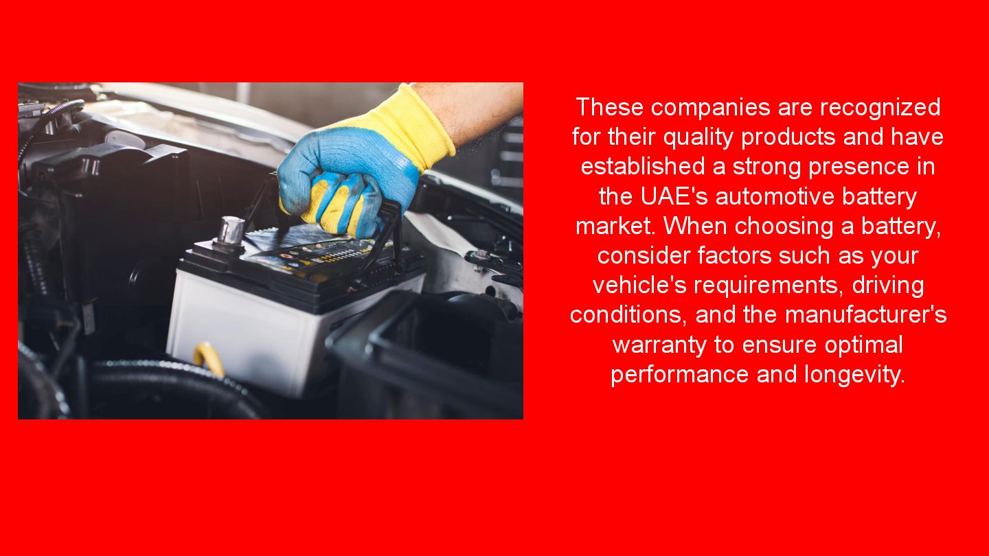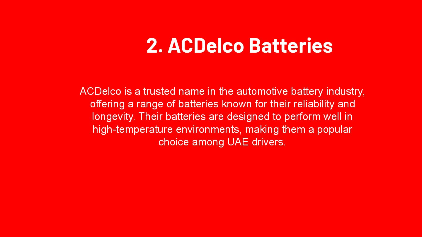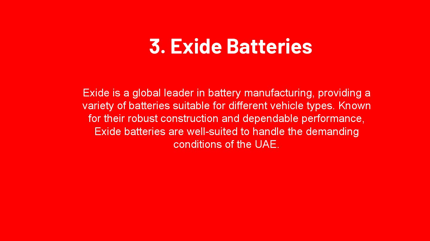 Optima Batteries is renowned for its high-performance automotive batteries, particularly suited for the UAE's extreme climate. Their unique SpiralCell Technology ensures durability, resistance to vibration, and consistent power delivery, making them ideal for luxury and high-performance vehicles. Optima batteries are maintenance-free and designed to withstand the har sh conditions prevalent in the region.