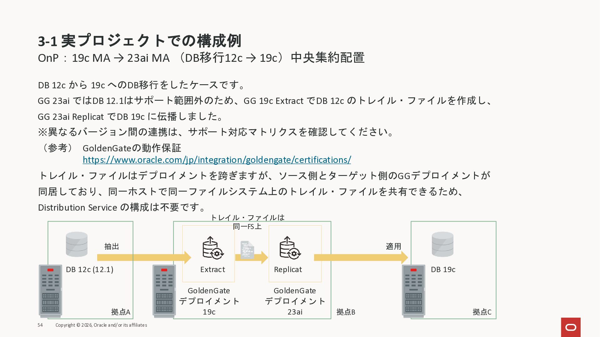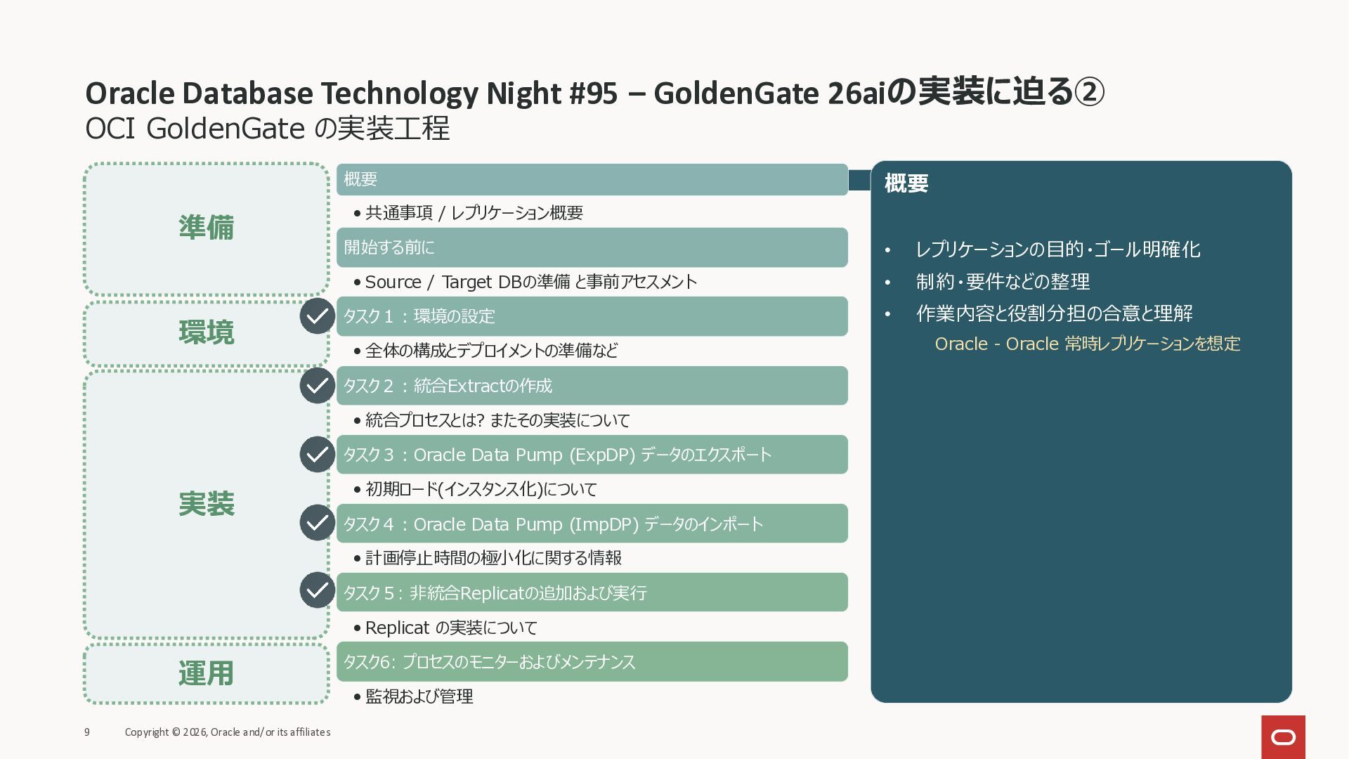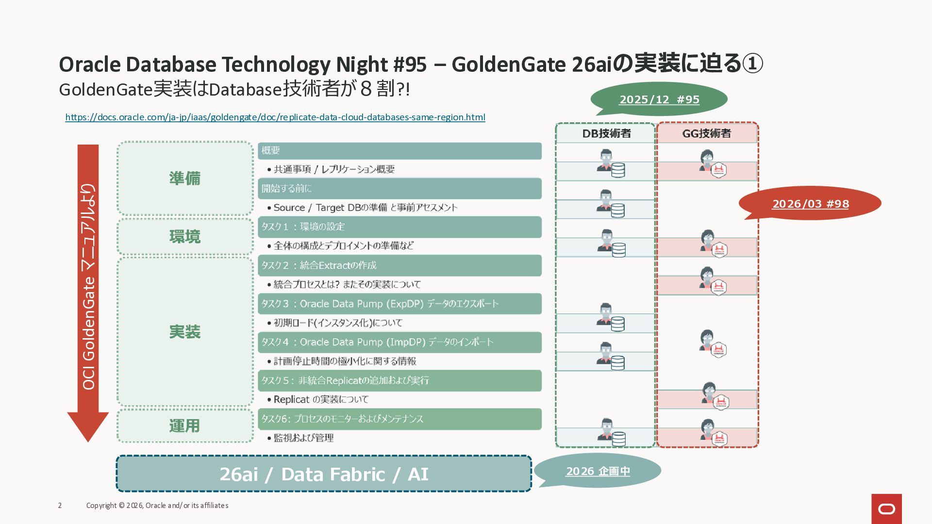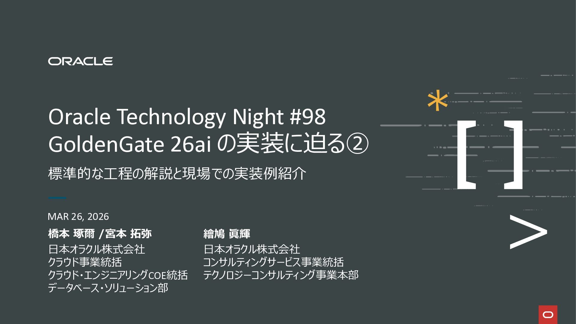 2026年3月26日に実施したOracle Database Technology Night #98 GoldenGate 26ai の実装に迫る② 〜 標準的な工程の解説と現場での実装例紹介で使用した資料です。