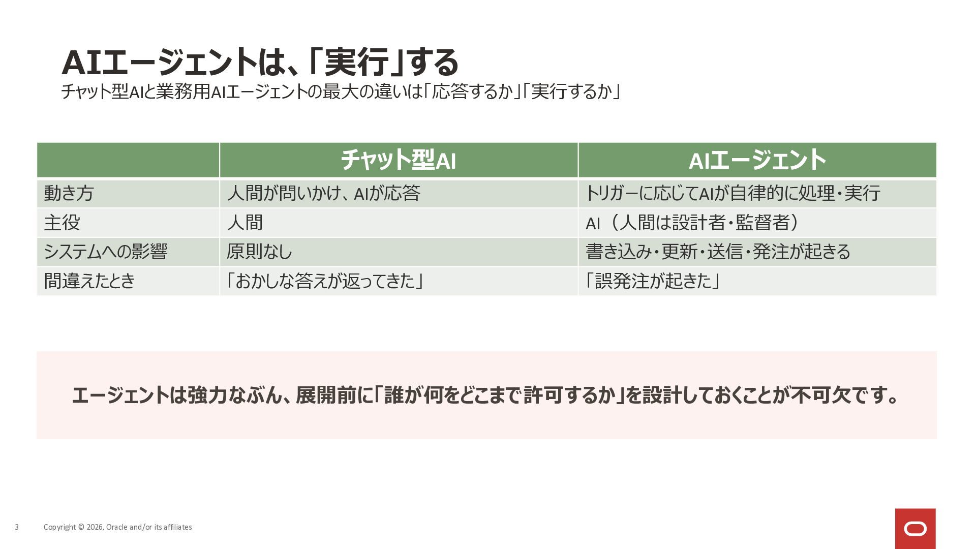 ・チャット型AIとAIエージェントの本質的な違い(応答 vs 実行)