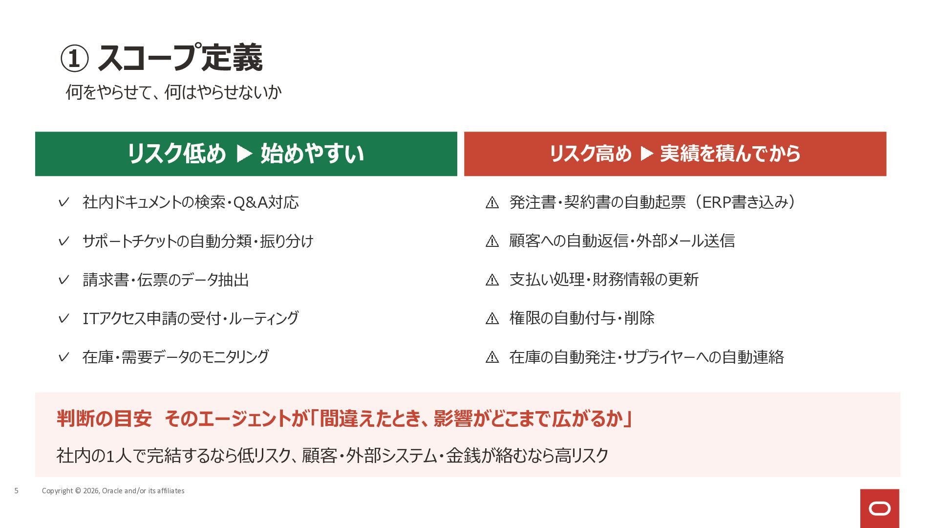 チャット型AIとは異なり、AIエージェントはシステムへの「書き込み・更新・送信・発注」といった実行を伴います。その強力さゆえに、導入前の設計が欠かせません。