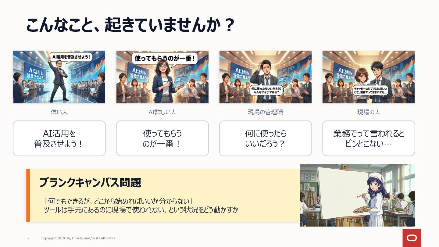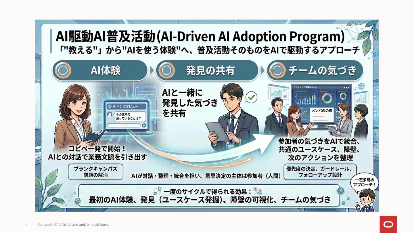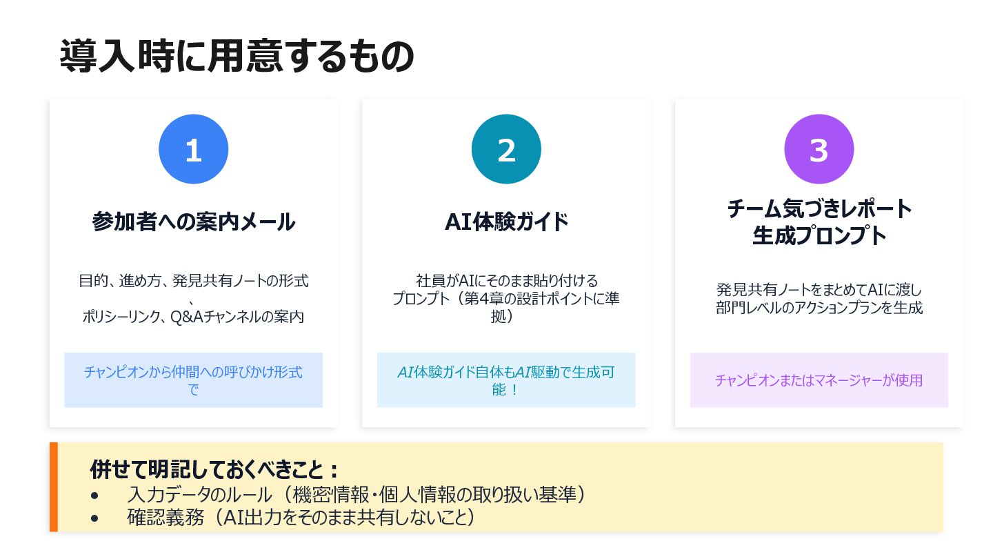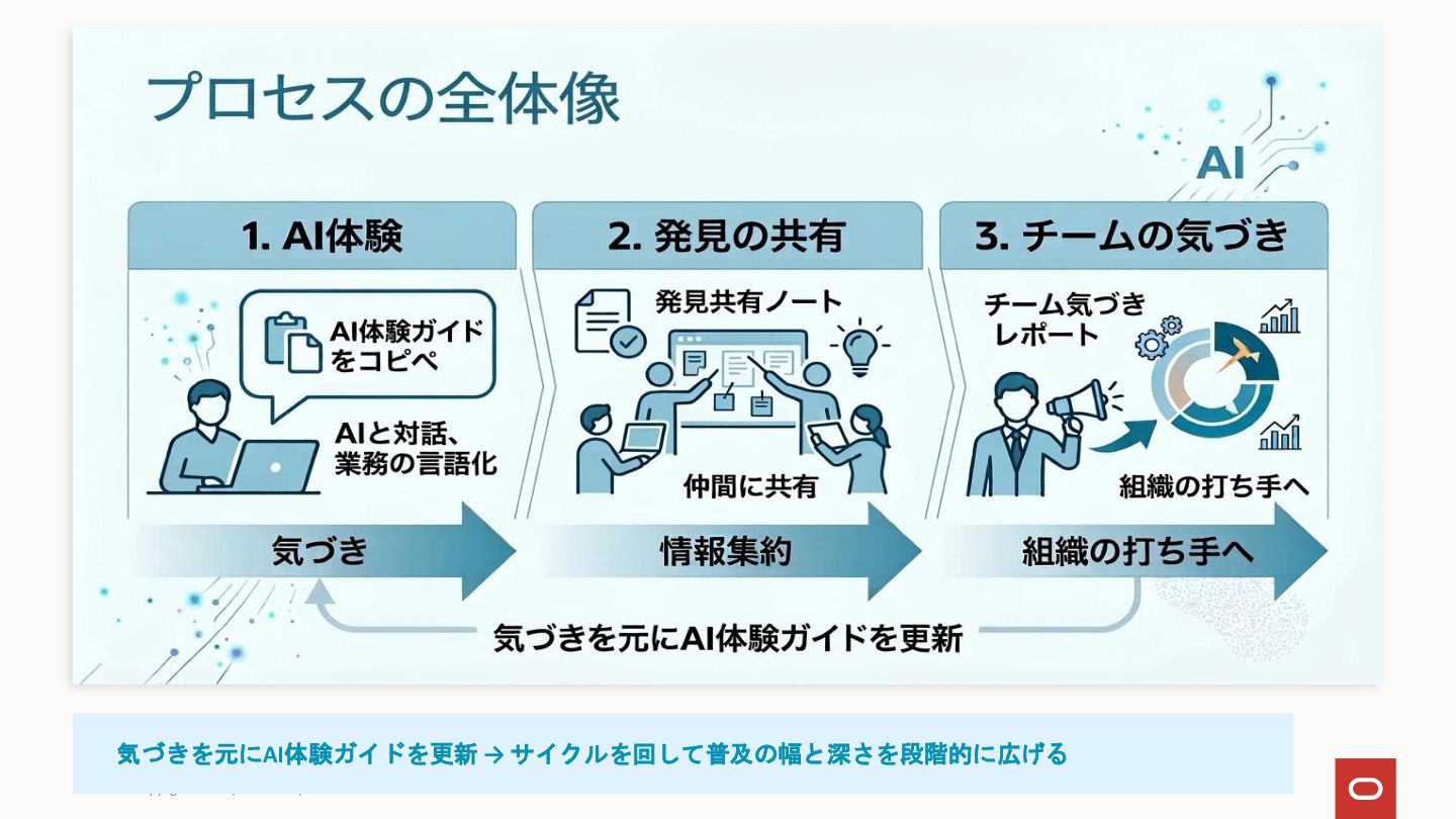 社内にAIツールはあるのに「何に使えばいいか分からない」で止まっている——いわゆる「ブランクキャンバス問題」について、AI自体を普及活動の推進エンジンとして使うアプローチを整理してみました。 社員がプロンプトをコピペするだけでAIが業務のヒアリングを進め、ユースケース候補や障壁が自然と言語化される仕組みです。研修で「教える」のではなく、使う体験そのものを通じて定着を目指しアプローチです。
