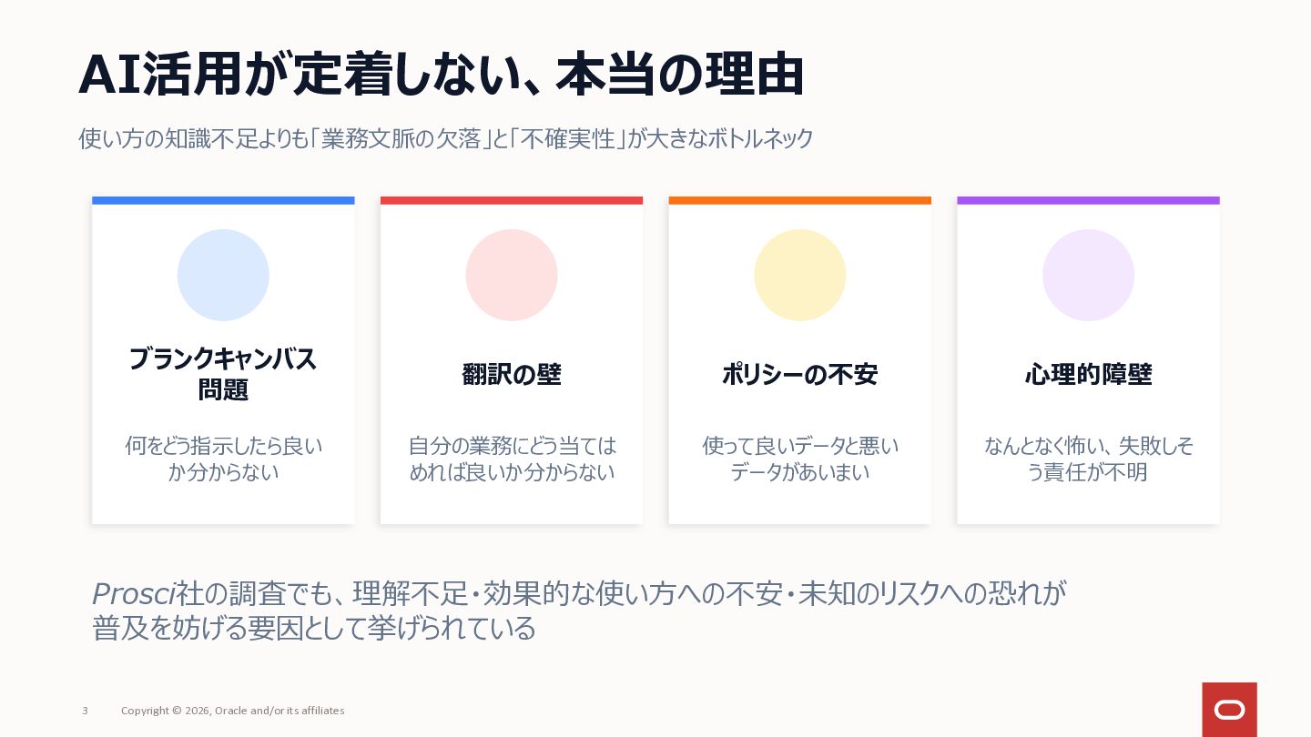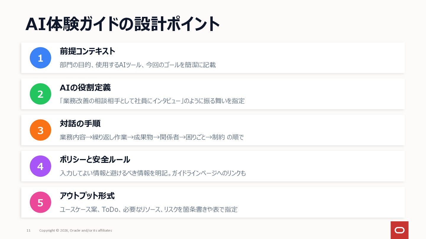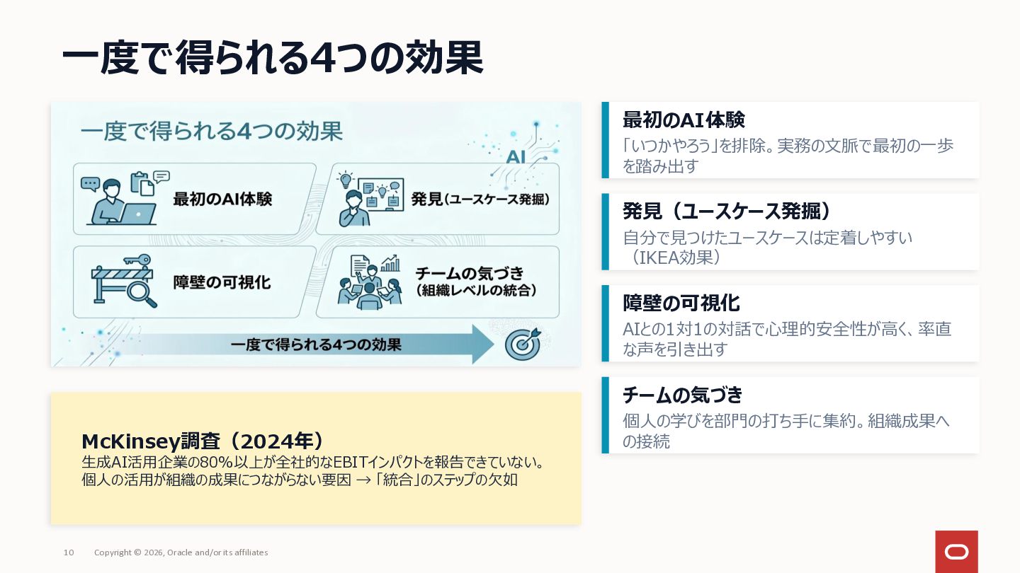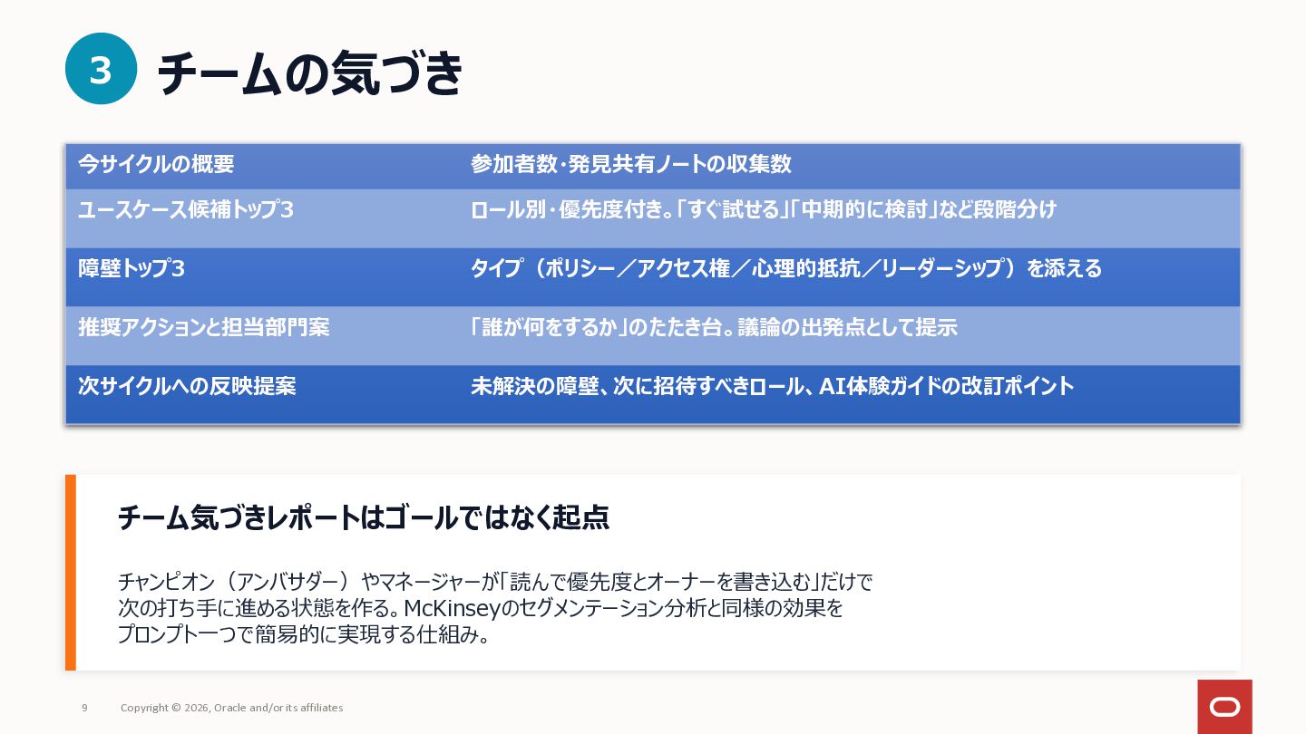 社内にAIツールはあるのに「何に使えばいいか分からない」で止まっている——いわゆる「ブランクキャンバス問題」について、AI自体を普及活動の推進エンジンとして使うアプローチを整理してみました。 社員がプロンプトをコピペするだけでAIが業務のヒアリングを進め、ユースケース候補や障壁が自然と言語化される仕組みです。研修で「教える」のではなく、使う体験そのものを通じて定着を目指しアプローチです。