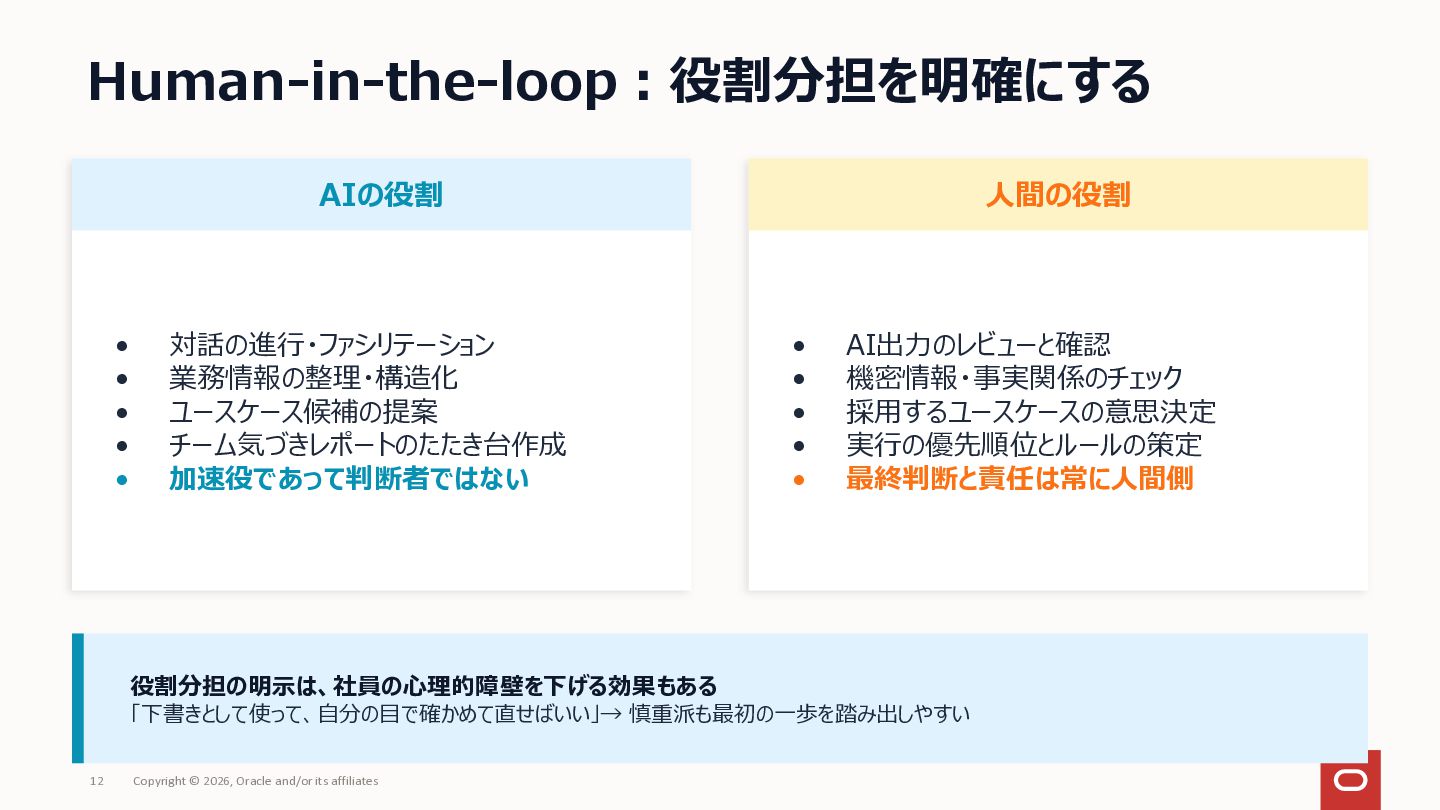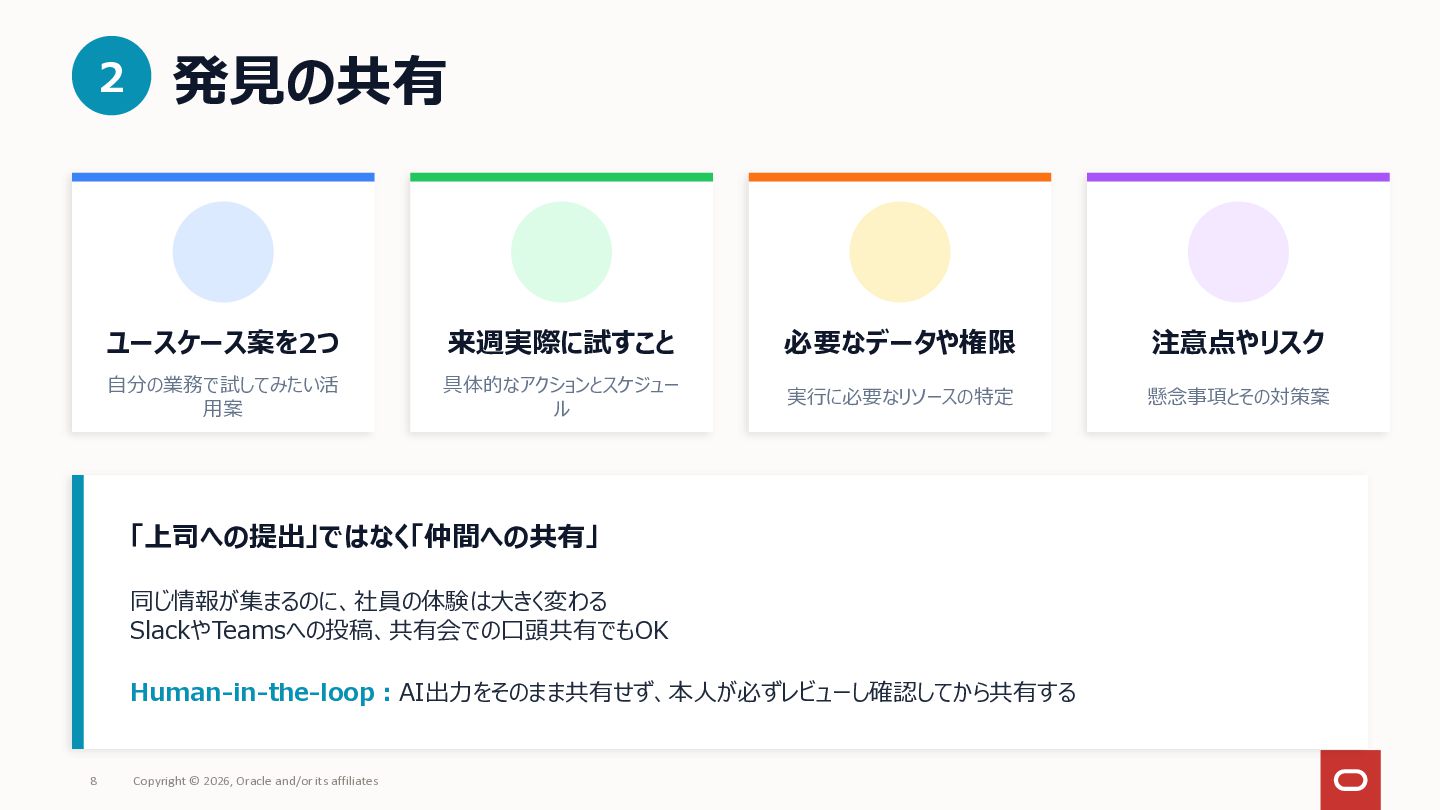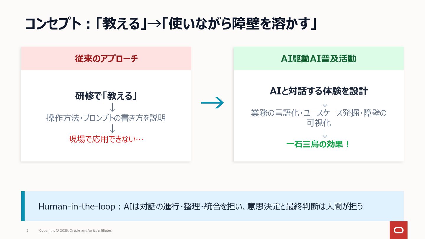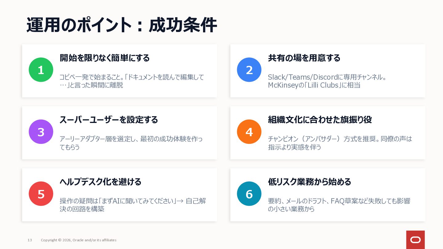 社内にAIツールはあるのに「何に使えばいいか分からない」で止まっている——いわゆる「ブランクキャンバス問題」について、AI自体を普及活動の推進エンジンとして使うアプローチを整理してみました。 社員がプロンプトをコピペするだけでAIが業務のヒアリングを進め、ユースケース候補や障壁が自然と言語化される仕組みです。研修で「教える」のではなく、使う体験そのものを通じて定着を目指しアプローチです。