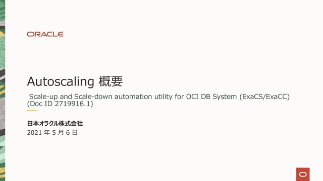 EXPRESSLY PROVIDED OTHERWISE, THE INFORMATION, SOFTWARE,PROVIDED ON AN “AS IS” AND “AS AVAILABLE” BASIS. ORACLE EXPRESSLY DISCLAIMS ALL WARRANTIES OF ANY KIND, WHETHER EXPRESS OR IMPLIED, INCLUDING, BUT NOT LIMITED TO, THE IMPLIED WARRANTIES OF MERCHANTABILITY, FITNESS FOR A PARTICULAR PURPOSE AND NON-INFRINGEMENT. ORACLE MAKES NO WARRANTY THAT: (A) THE RESULTS THAT MAY BE OBTAINED FROM THE USE OF THE SOFTWARE WILL BE ACCURATE OR RELIABLE; OR (B) THE INFORMATION, OR OTHER MATERIAL OBTAINED WILL MEET YOUR EXPECTATIONS. ANY CONTENT, MATERIALS, INFORMATION OR SOFTWARE DOWNLOADED OR OTHERWISE OBTAINED IS DONE AT YOUR OWN DISCRETION AND RISK. ORACLE SHALL HAVE NO RESPONSIBILITY FOR ANY DAMAGE TO YOUR COMPUTER SYSTEM OR LOSS OF DATA THAT RESULTS FROM THE DOWNLOAD OF ANY CONTENT, MATERIALS, INFORMATION OR SOFTWARE. (機械翻訳) 特に明⽰的に提供されている場合を除き、情報、ソフトウェアは「現状有姿」および「利⽤可能な範囲」で提供されます。オラクルは、明⽰的か黙⽰的かを 問わず、いかなる種類の保証も明⽰的に否認します。商品性、特定⽬的への適合性、および⾮侵害の黙⽰の保証に限定されます。オラクルは、次のことを 保証しません。(A)本ソフトウェアの使⽤から得られる可能性のある結果が正確または信頼できるものであること。または(B)情報、または取得したその 他の資料がお客様の期待に応えます。ダウンロードされた、またはその他の⽅法で取得されたコンテンツ、資料、情報、またはソフトウェアは、ユーザー⾃⾝の 裁量とリスクで実⾏されます。オラクルは、コンテンツ、資料、情報、またはソフトウェアのダウンロードに起因するコンピュータシステムの損傷またはデータの損失 について責任を負わないものとします。 Autoscaling Copyright © 2021, Oracle and/or its affiliates | 54