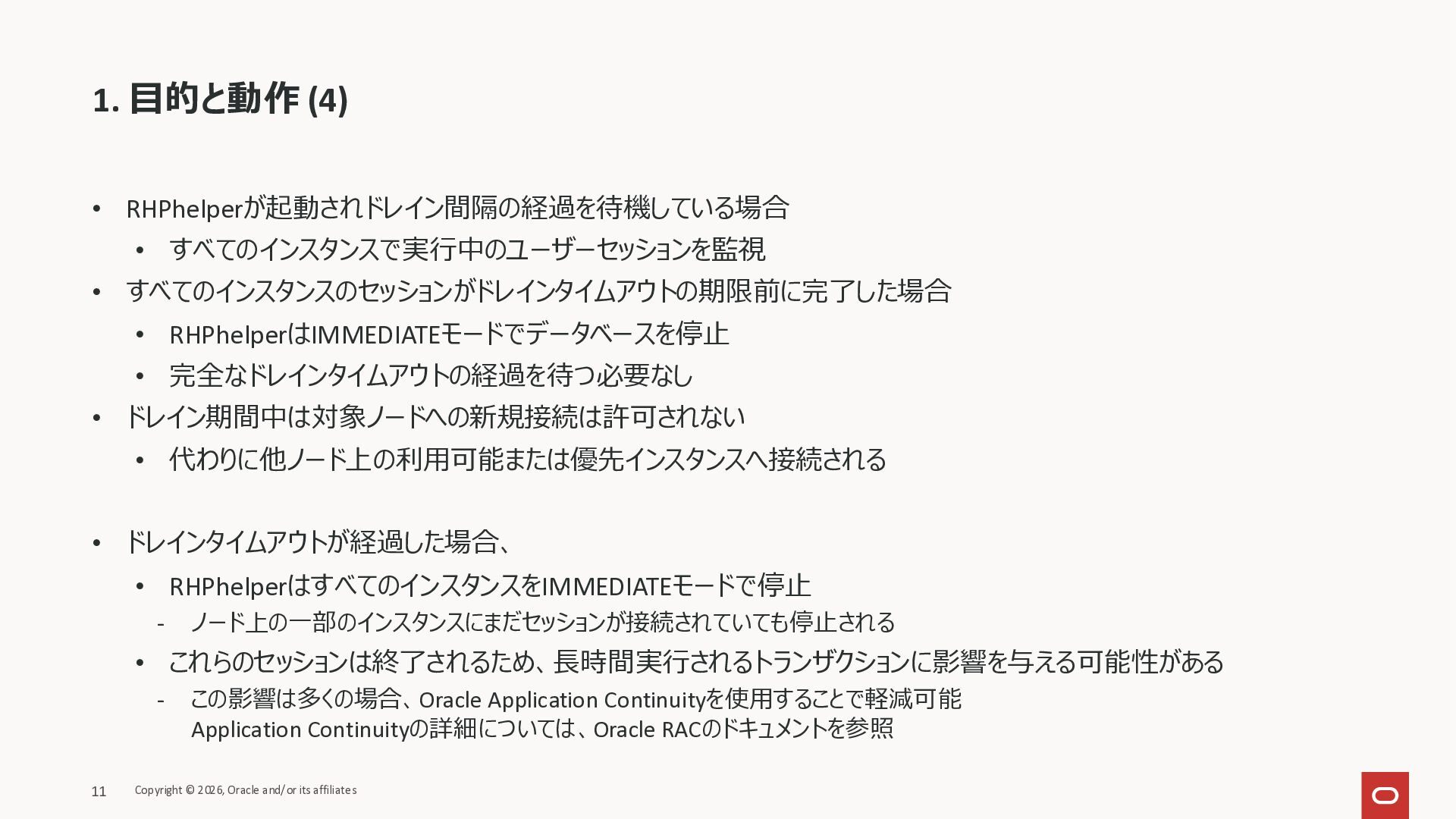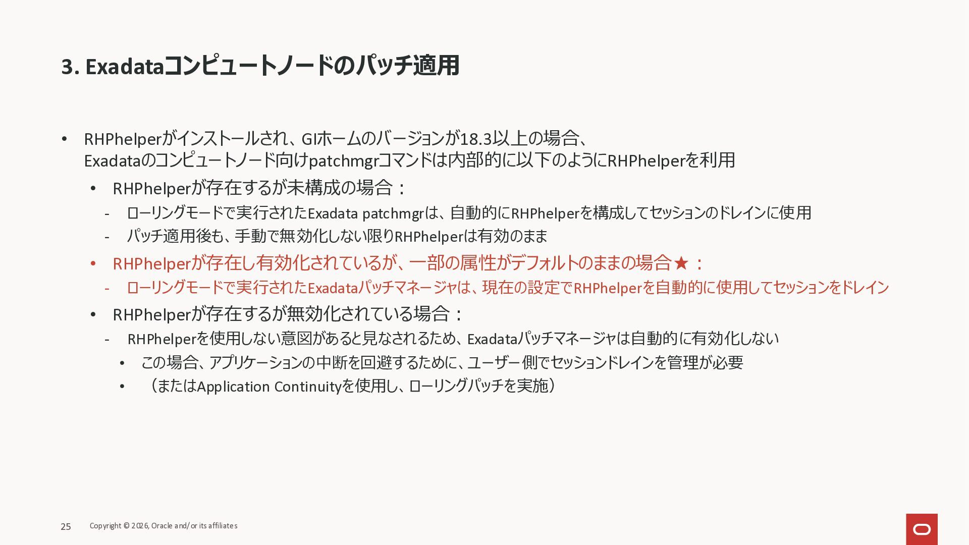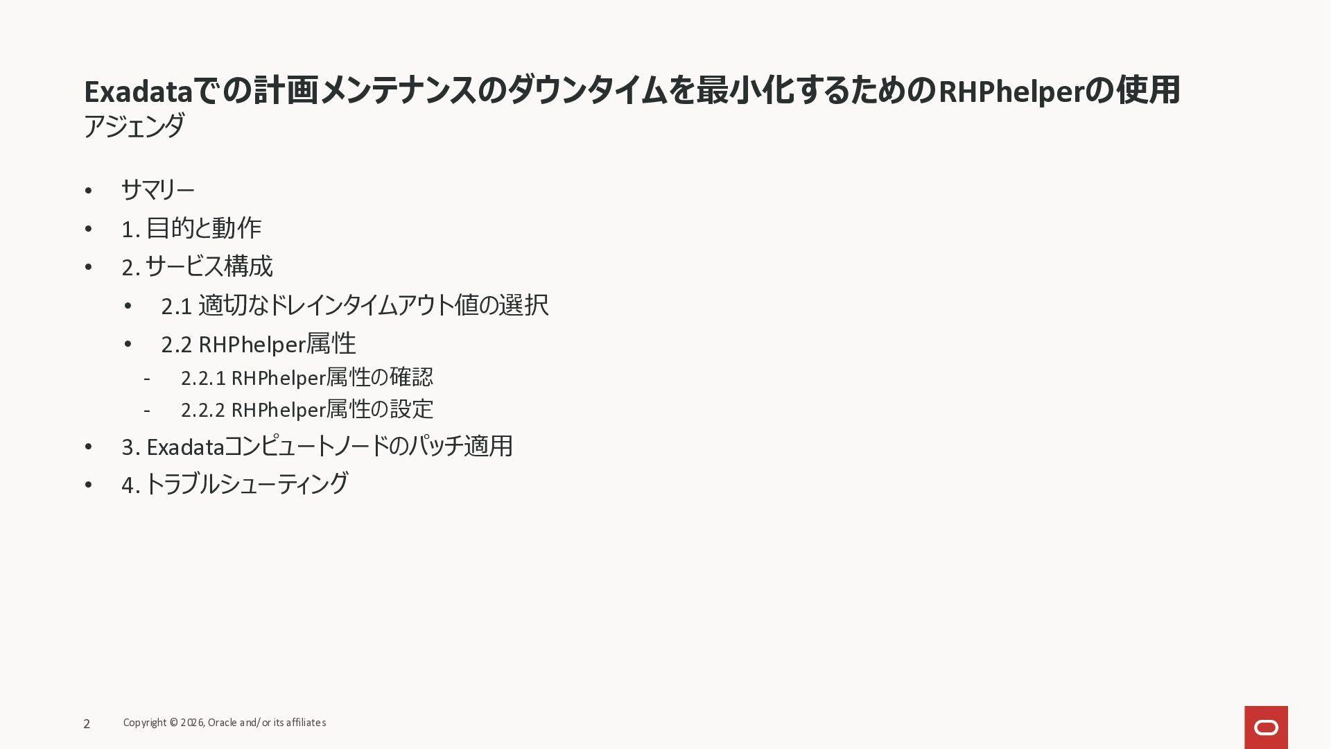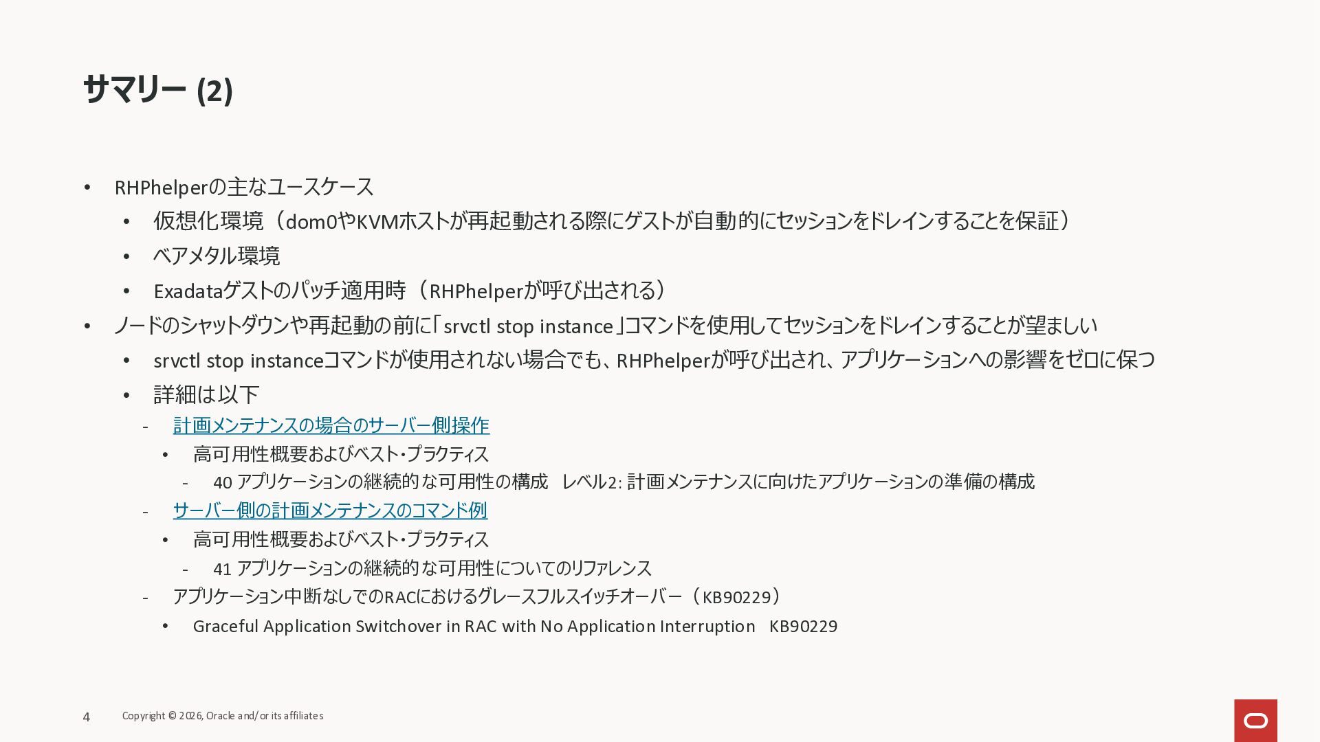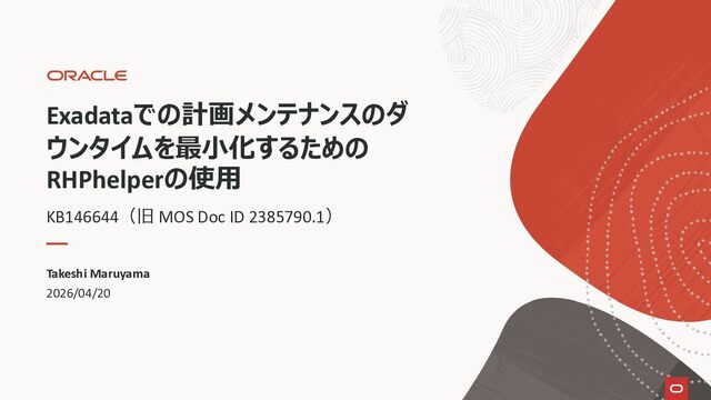 KB146644 Using RHPhelper to Minimize Downtime During Planned Maintenance on Exadata(旧 MOS Doc ID 2385790.1)を確認してまとめた資料です。 ExadataのGuest VM OSパッチ、Exadata Infrastructureメンテナンス適用時に内部で動いているrhphelperの説明をまとめました。