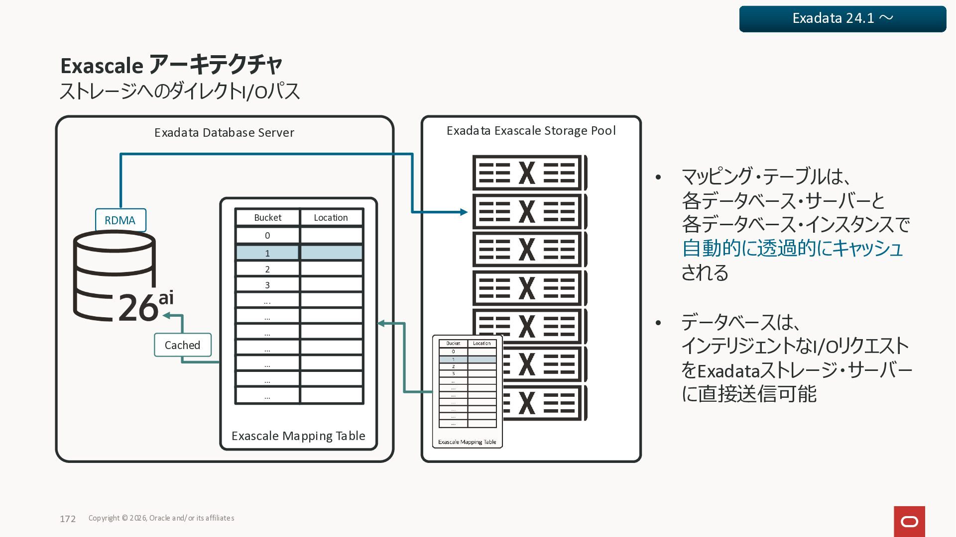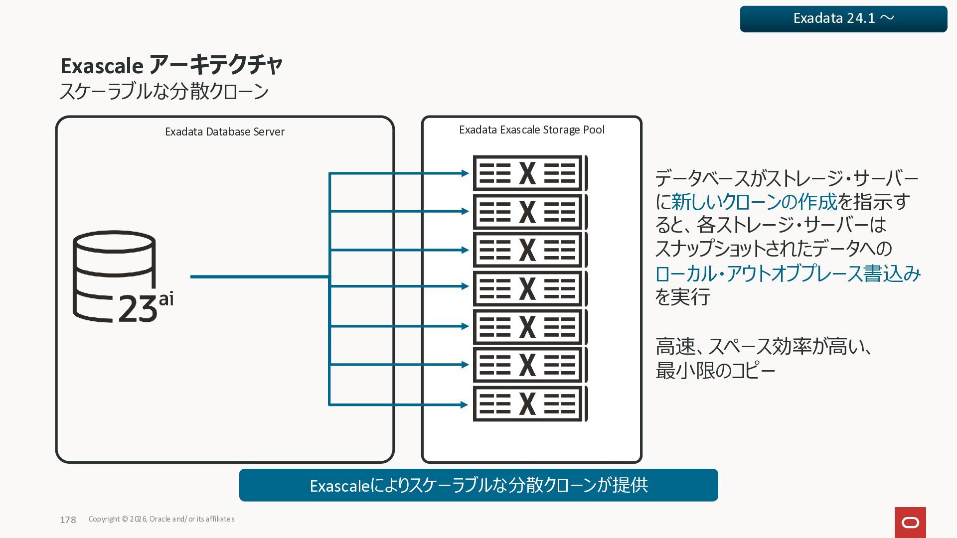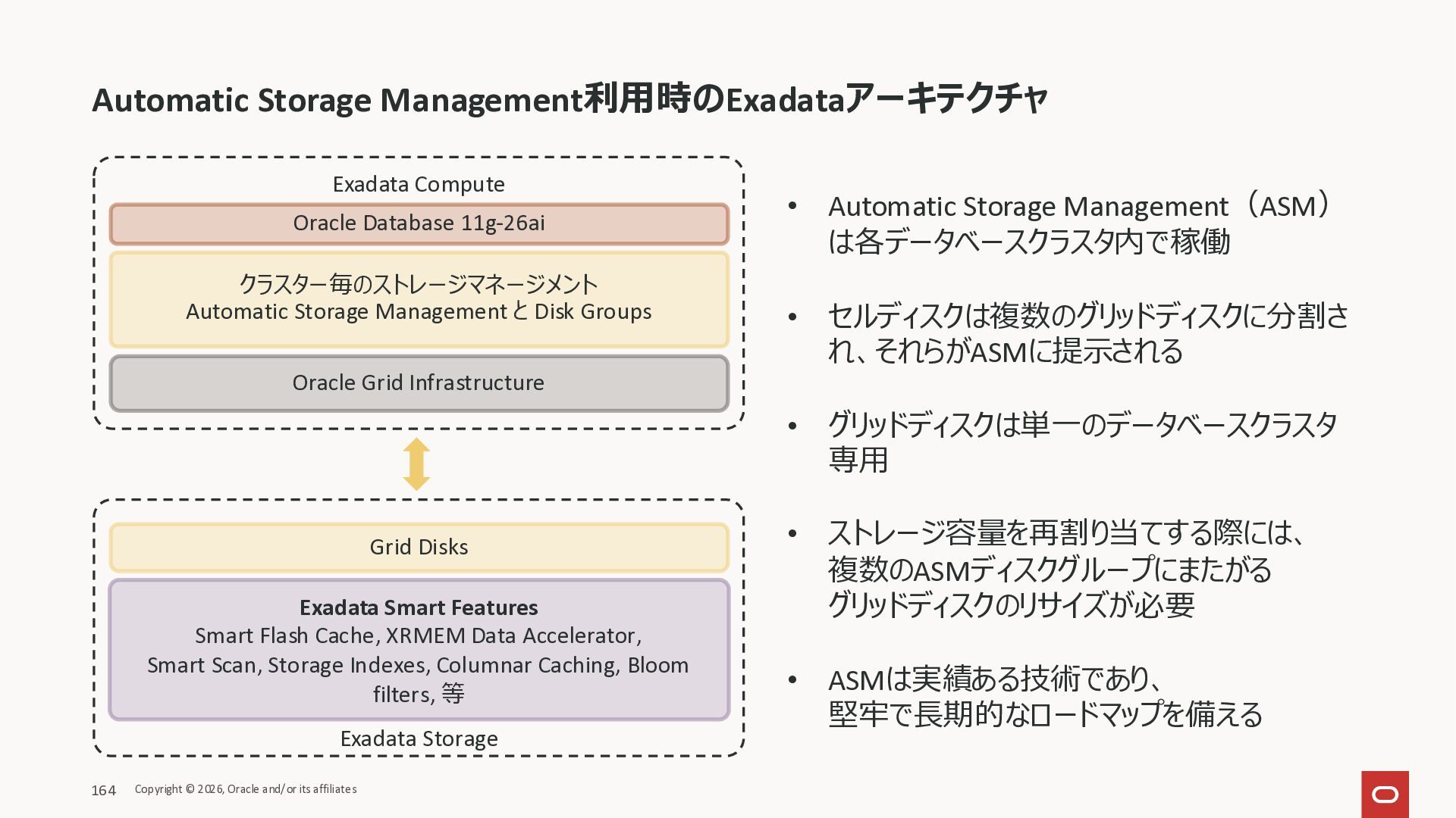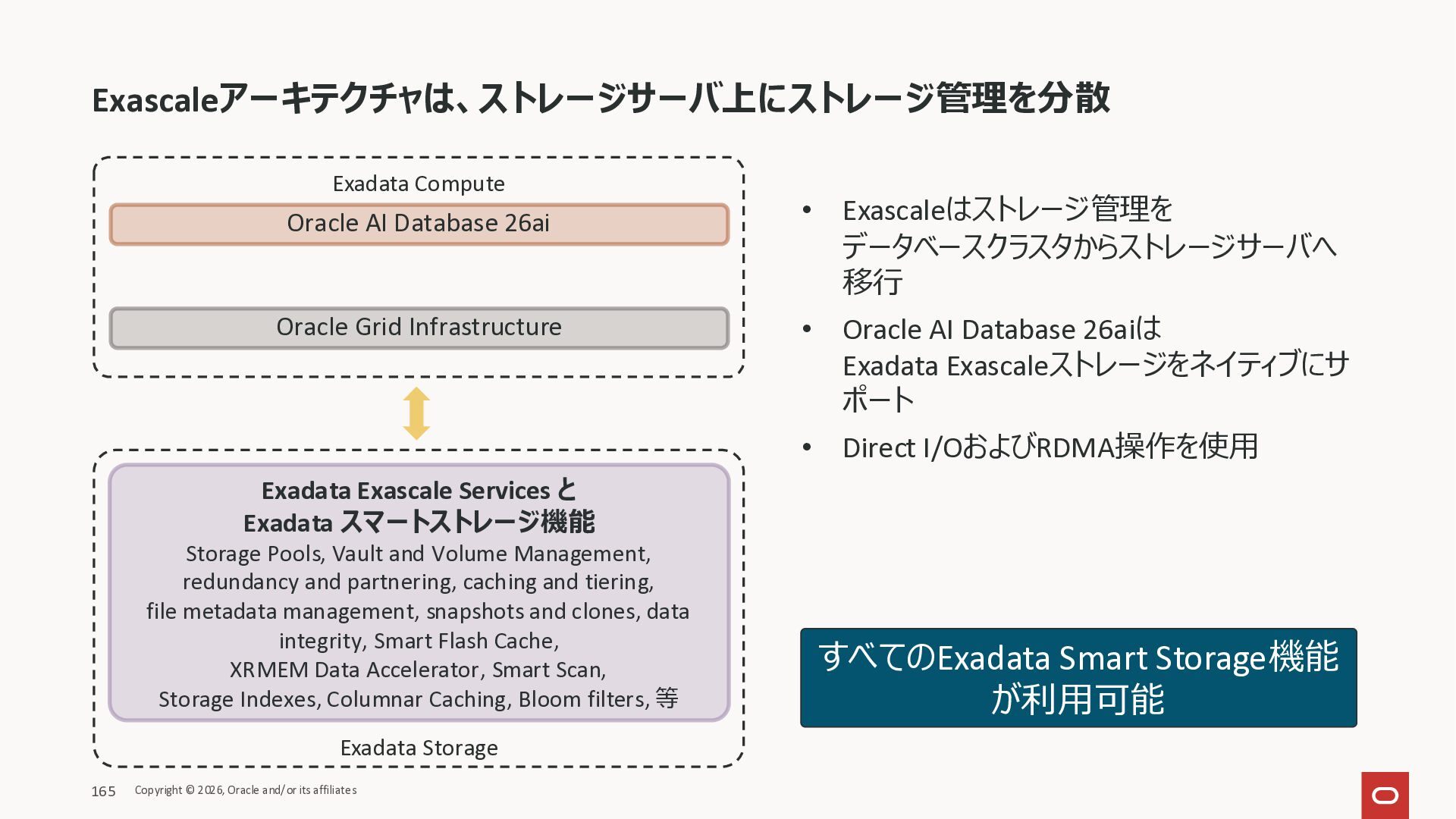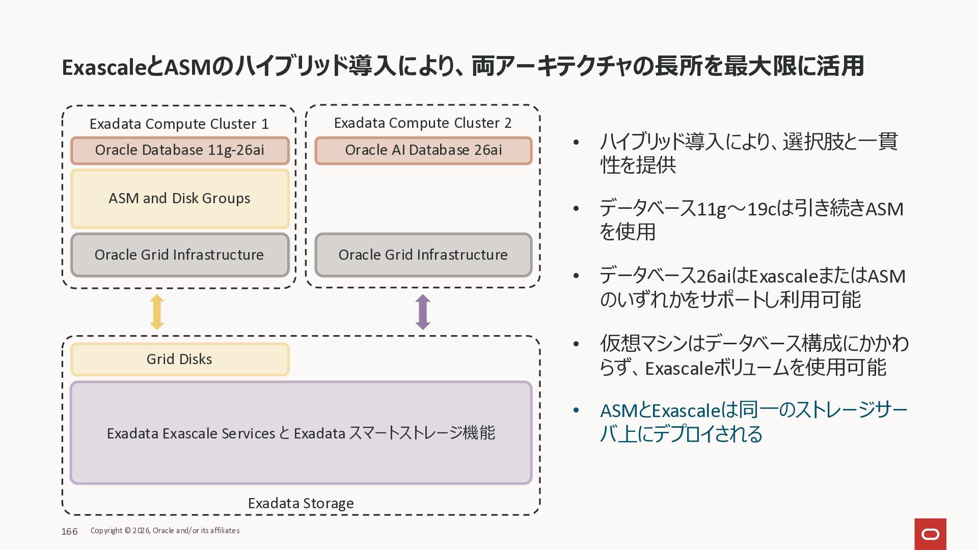 Exadata Exascaleストレージをネイティブにサ ポート • Direct I/OおよびRDMA操作を使用 165 Copyright © 2026, Oracle and/or its affiliates Exadata Storage Exadata Exascale Services と Exadata スマートストレージ機能 Storage Pools, Vault and Volume Management, redundancy and partnering, caching and tiering, file metadata management, snapshots and clones, data integrity, Smart Flash Cache, XRMEM Data Accelerator, Smart Scan, Storage Indexes, Columnar Caching, Bloom filters, 等 Oracle Grid Infrastructure Oracle AI Database 26ai Exadata Compute すべてのExadata Smart Storage機能 が利用可能