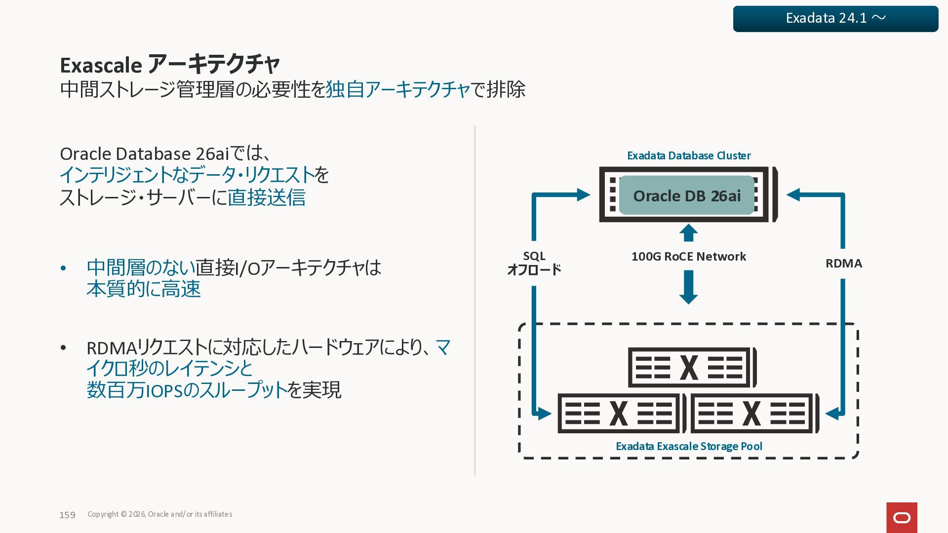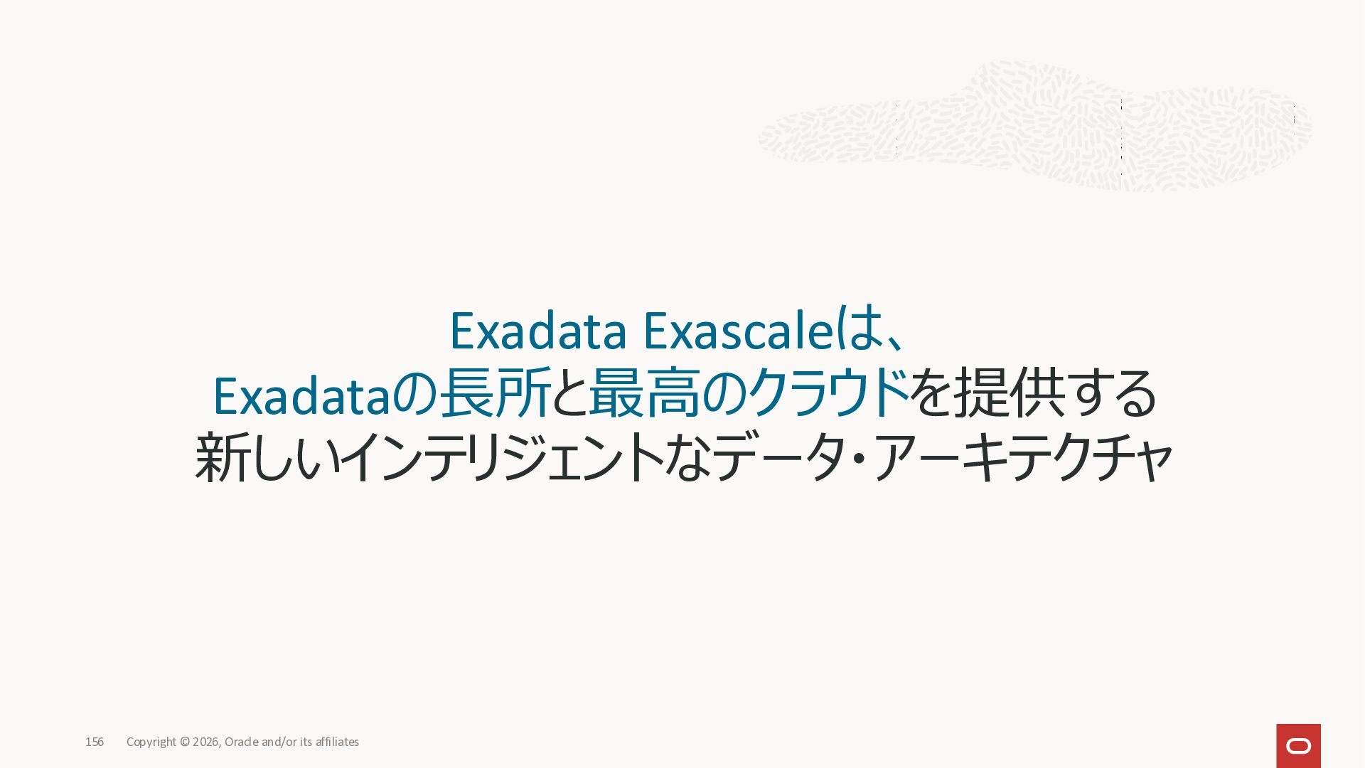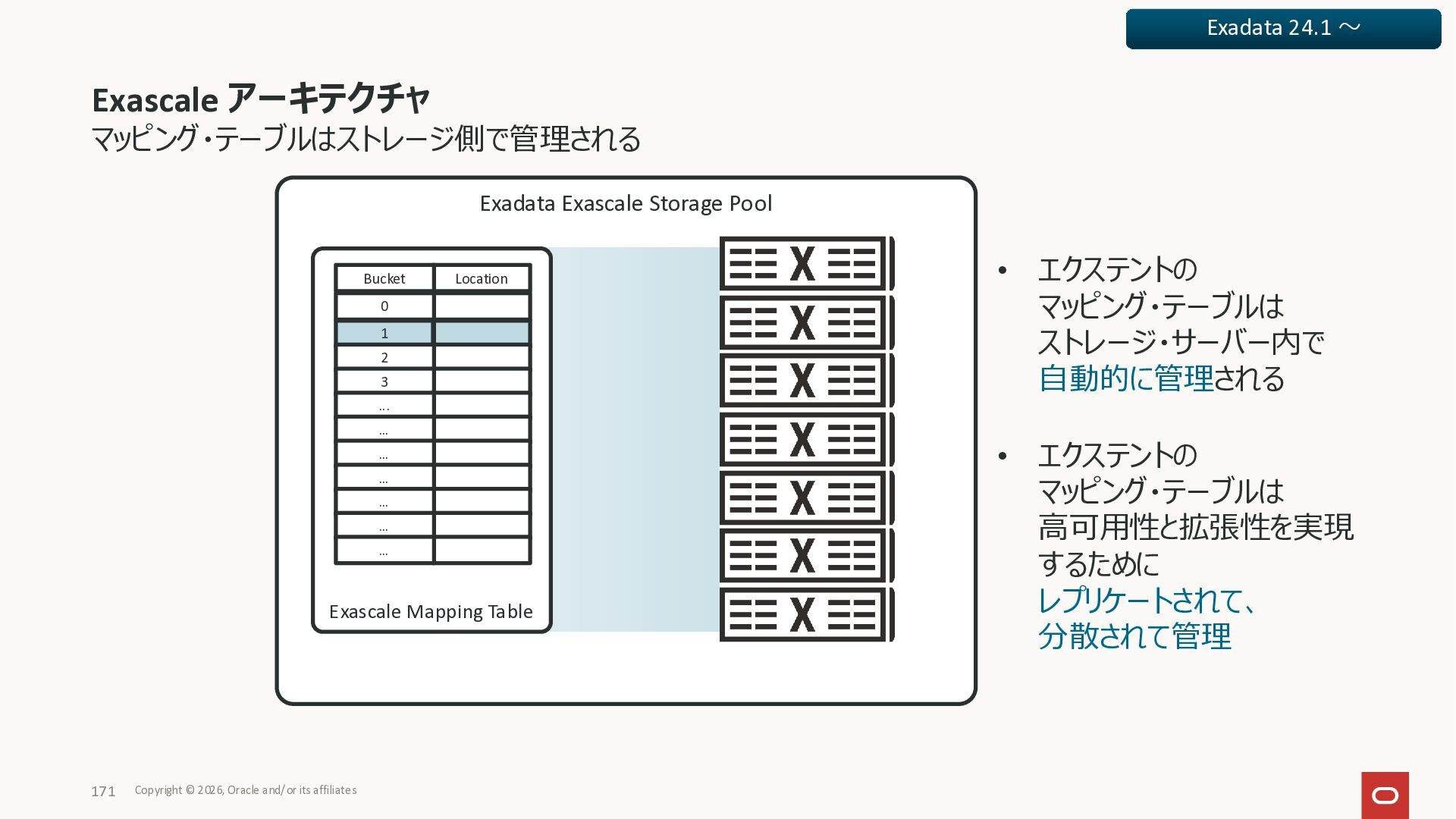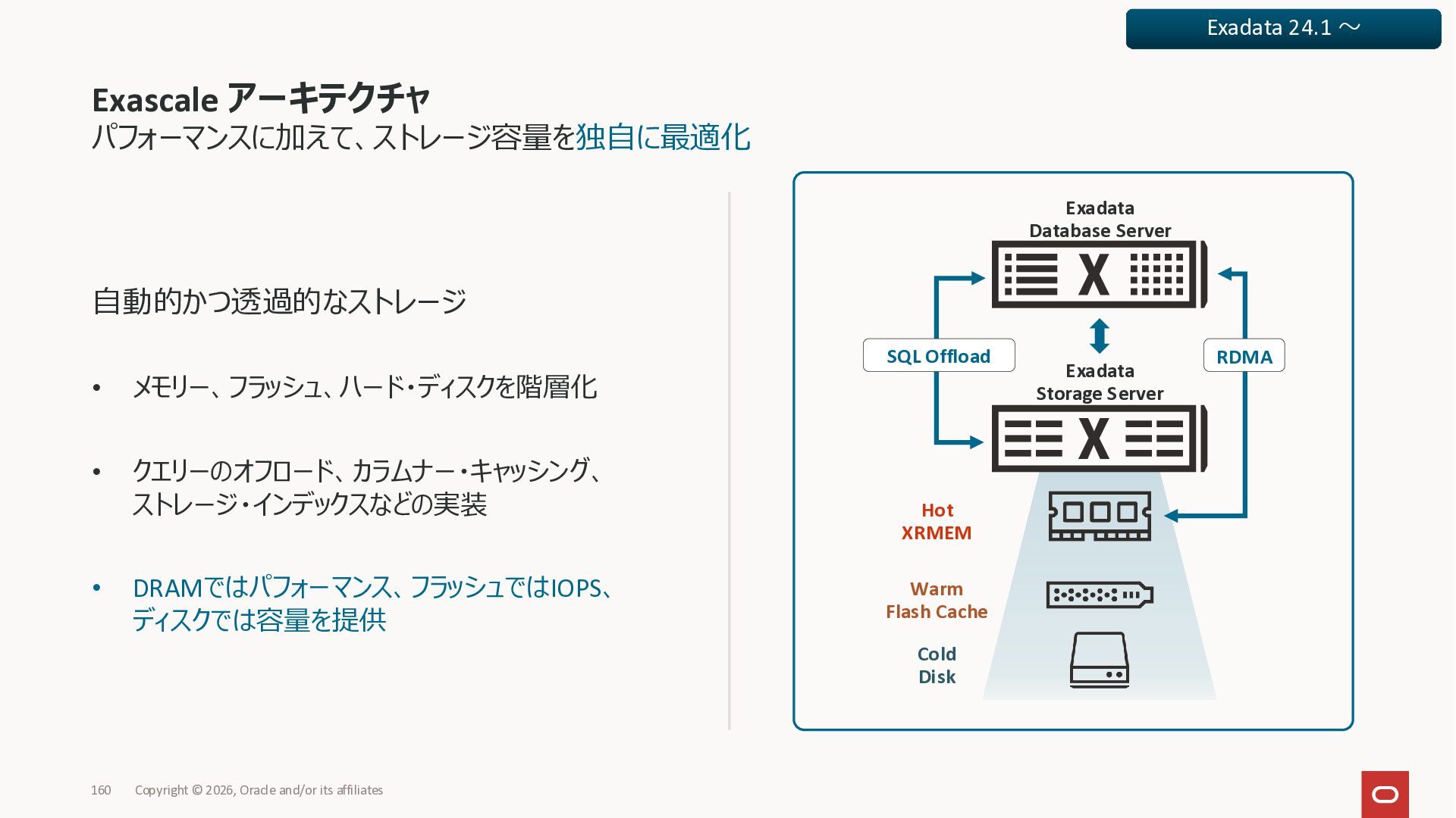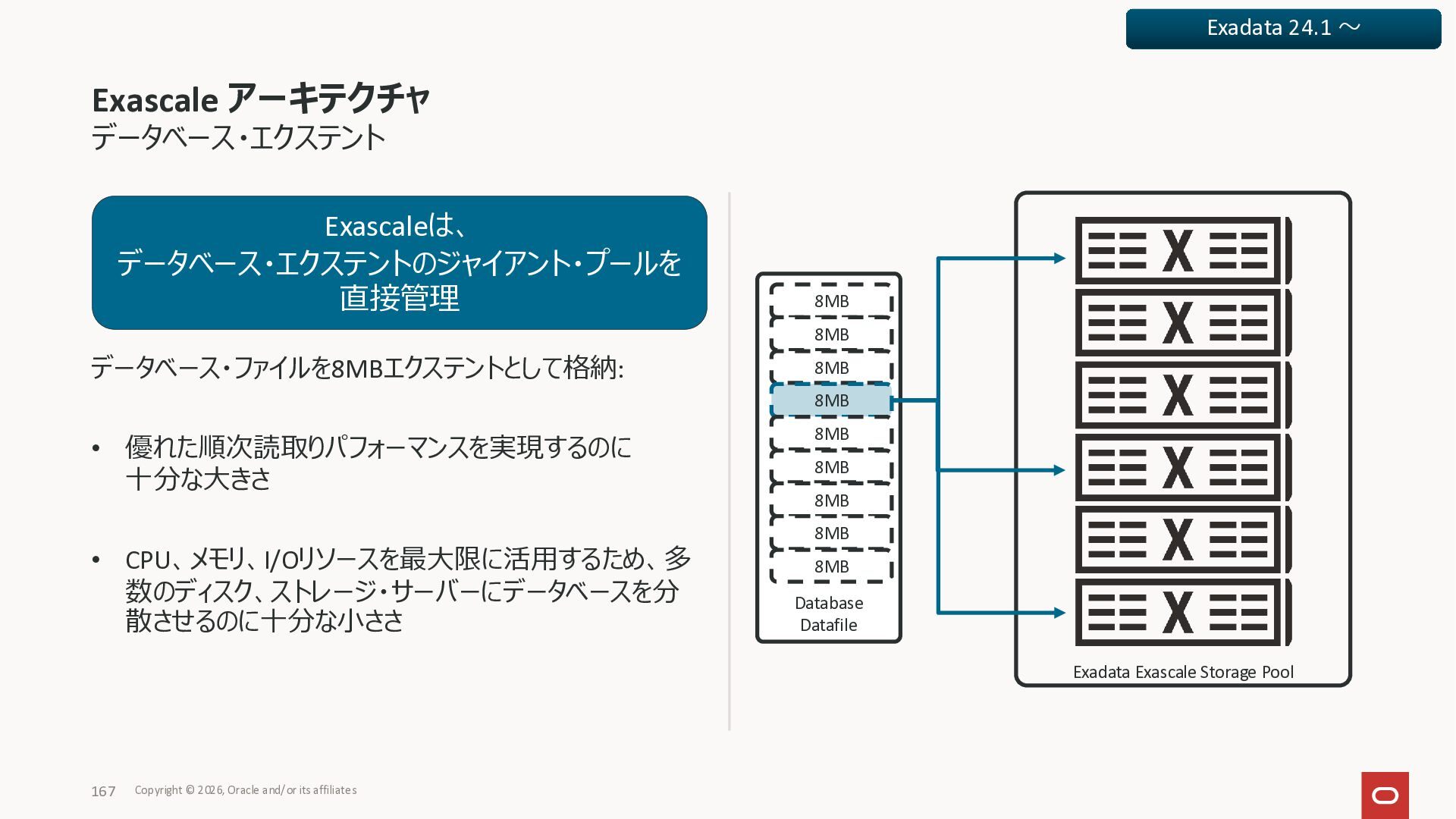 Exadata Exascaleストレージをネイティブにサ ポート • Direct I/OおよびRDMA操作を使用 165 Copyright © 2026, Oracle and/or its affiliates Exadata Storage Exadata Exascale Services と Exadata スマートストレージ機能 Storage Pools, Vault and Volume Management, redundancy and partnering, caching and tiering, file metadata management, snapshots and clones, data integrity, Smart Flash Cache, XRMEM Data Accelerator, Smart Scan, Storage Indexes, Columnar Caching, Bloom filters, 等 Oracle Grid Infrastructure Oracle AI Database 26ai Exadata Compute すべてのExadata Smart Storage機能 が利用可能