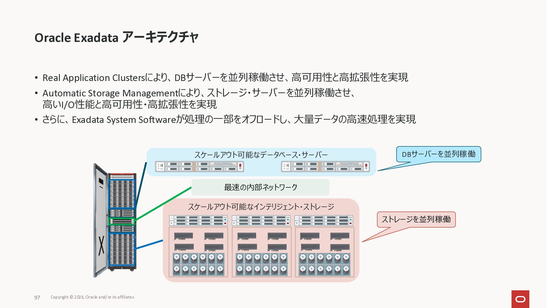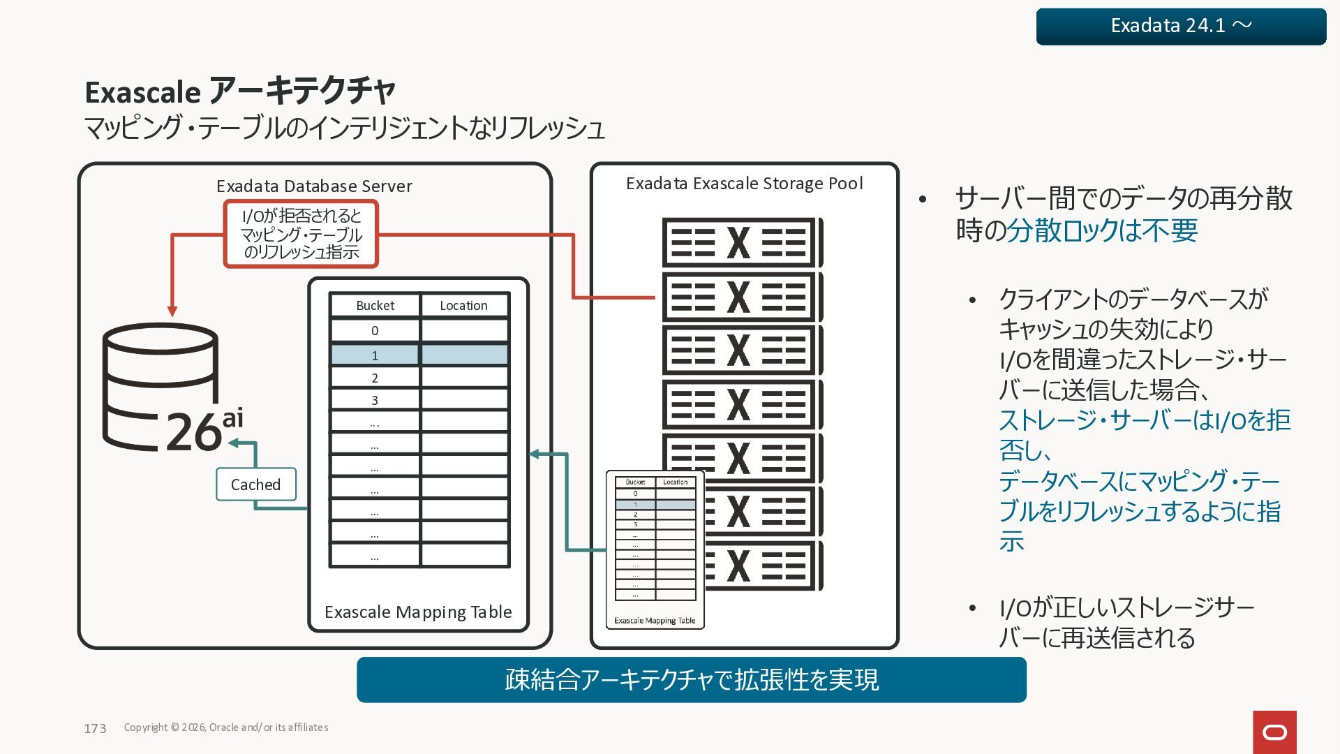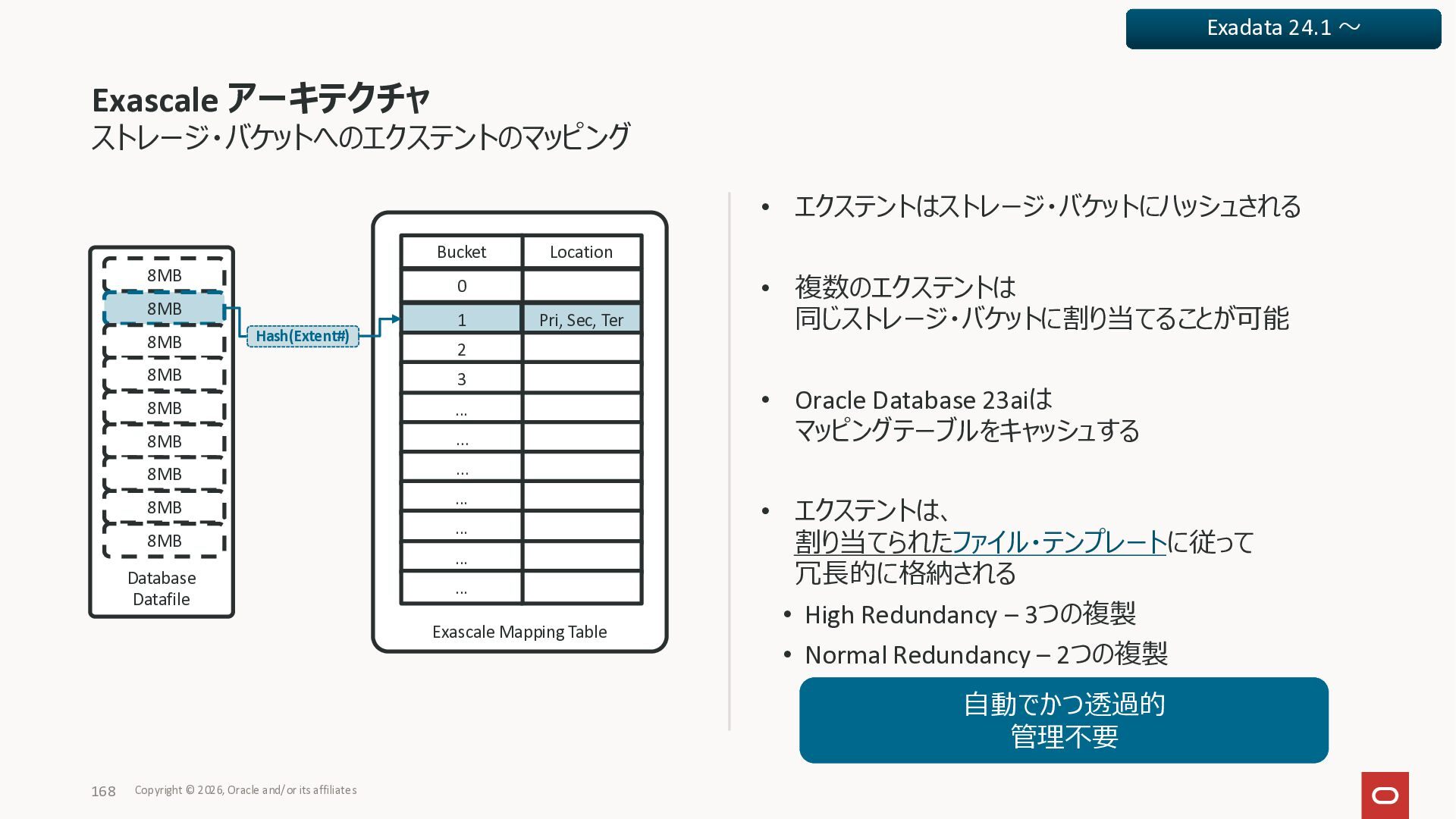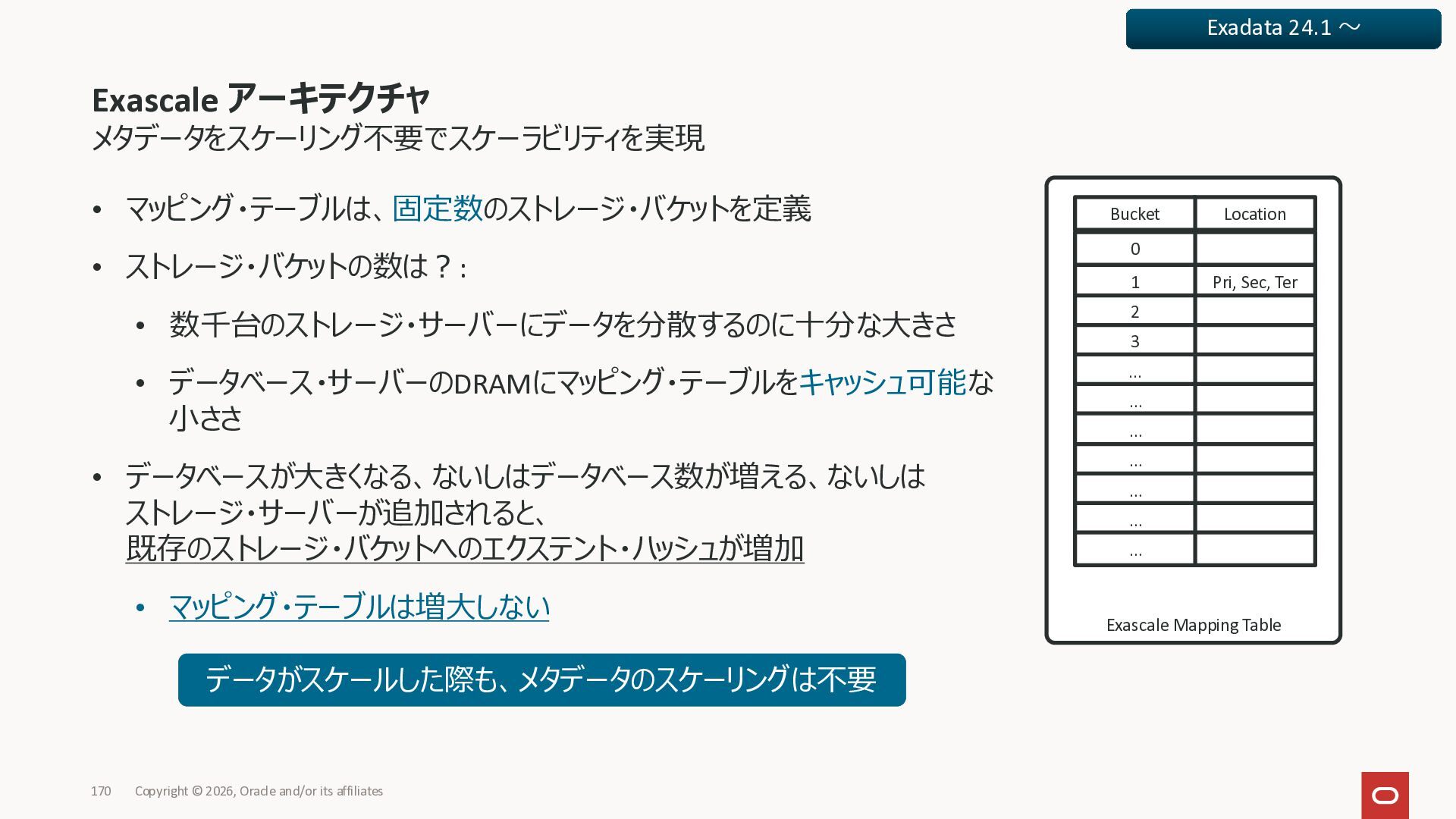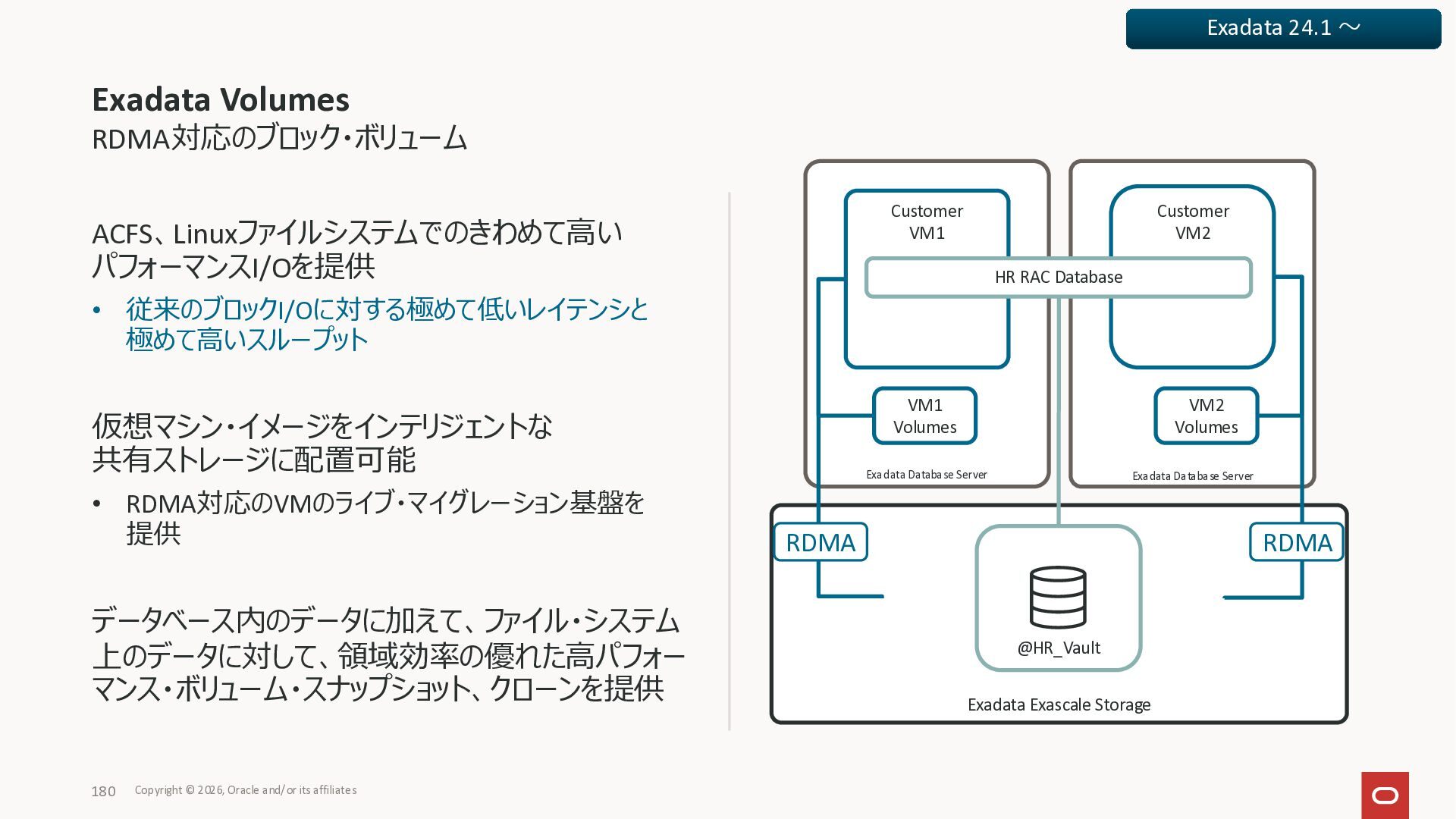 Exadata Exascaleストレージをネイティブにサ ポート • Direct I/OおよびRDMA操作を使用 165 Copyright © 2026, Oracle and/or its affiliates Exadata Storage Exadata Exascale Services と Exadata スマートストレージ機能 Storage Pools, Vault and Volume Management, redundancy and partnering, caching and tiering, file metadata management, snapshots and clones, data integrity, Smart Flash Cache, XRMEM Data Accelerator, Smart Scan, Storage Indexes, Columnar Caching, Bloom filters, 等 Oracle Grid Infrastructure Oracle AI Database 26ai Exadata Compute すべてのExadata Smart Storage機能 が利用可能