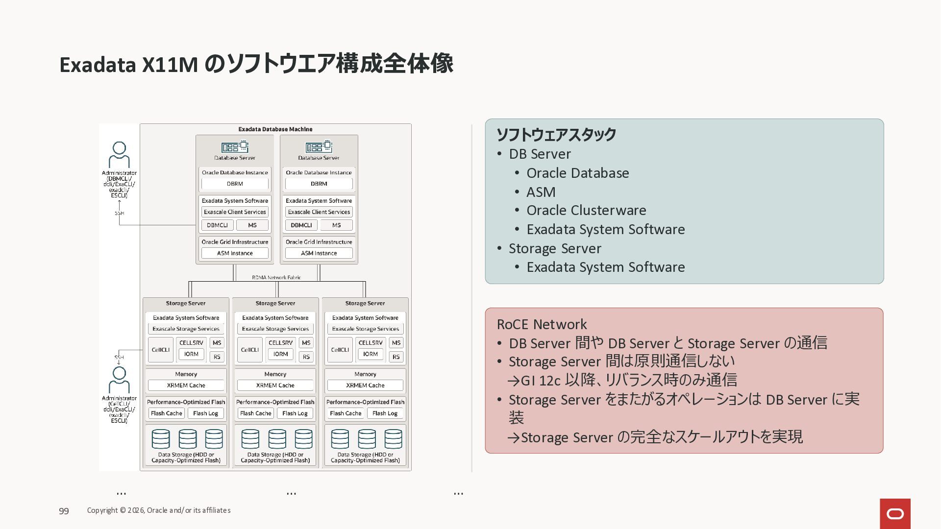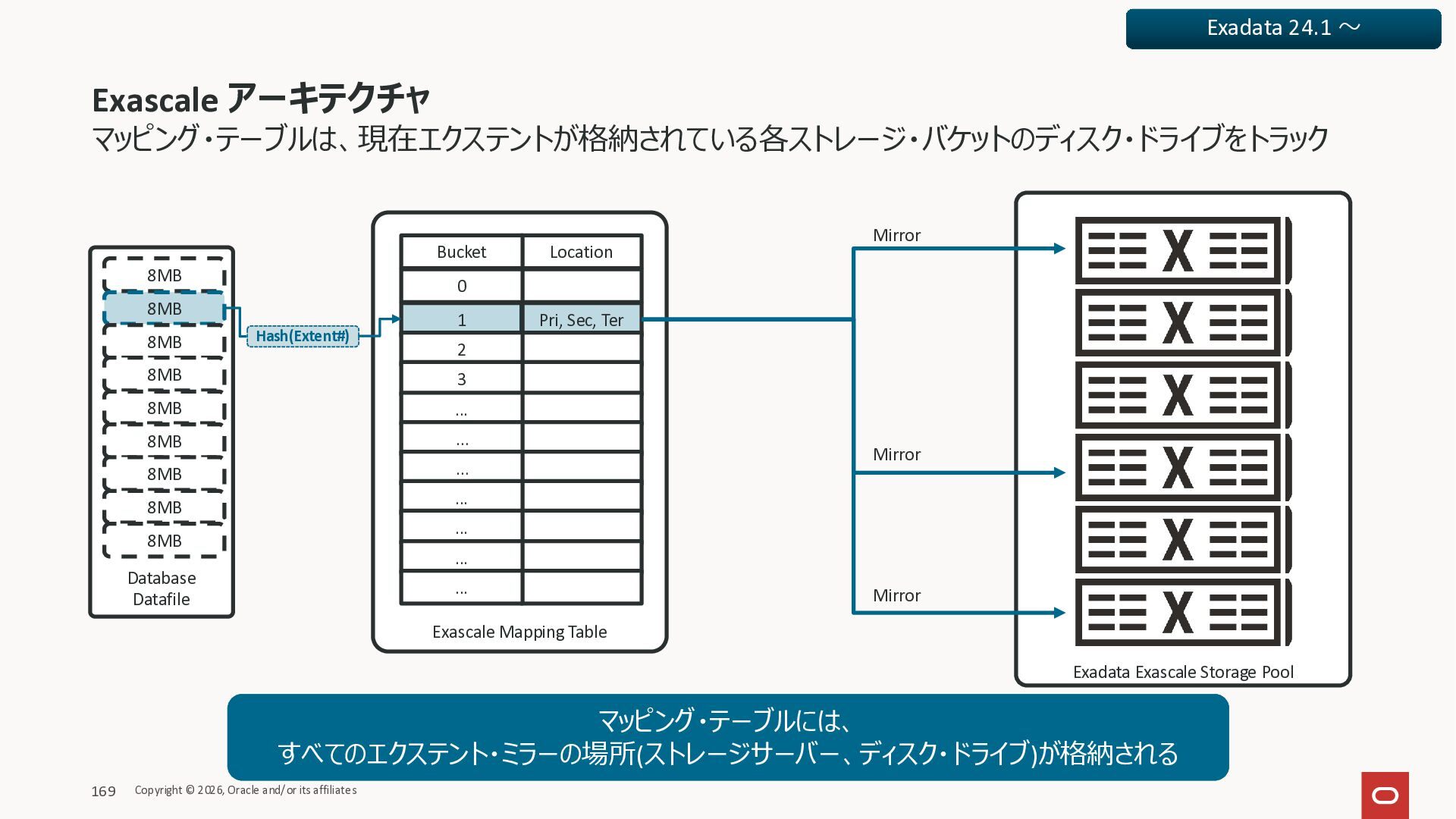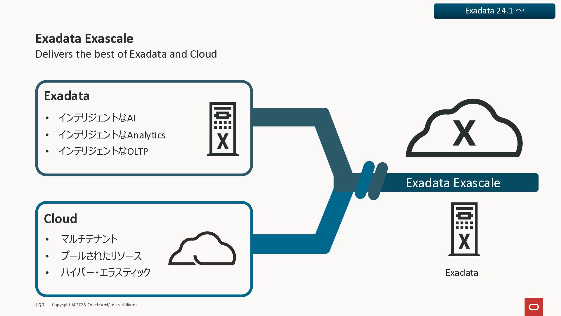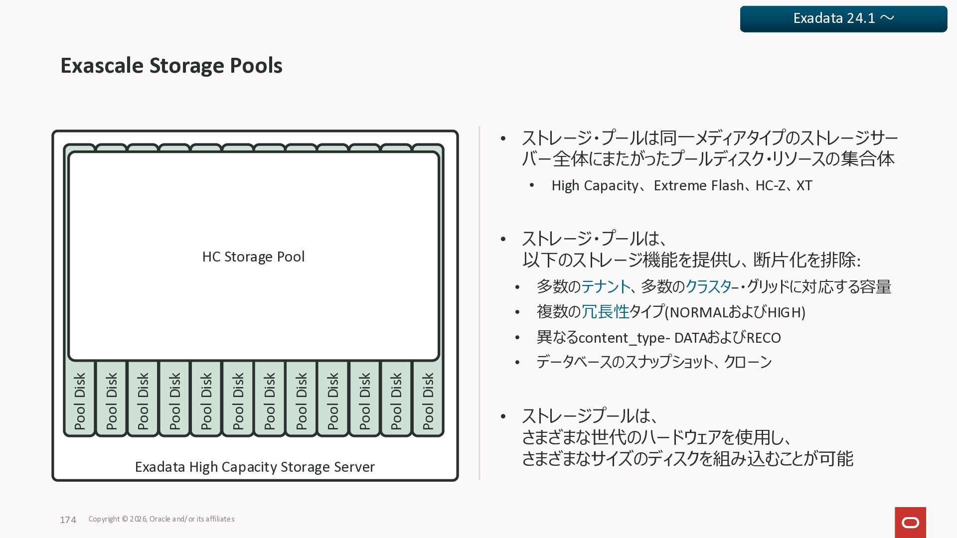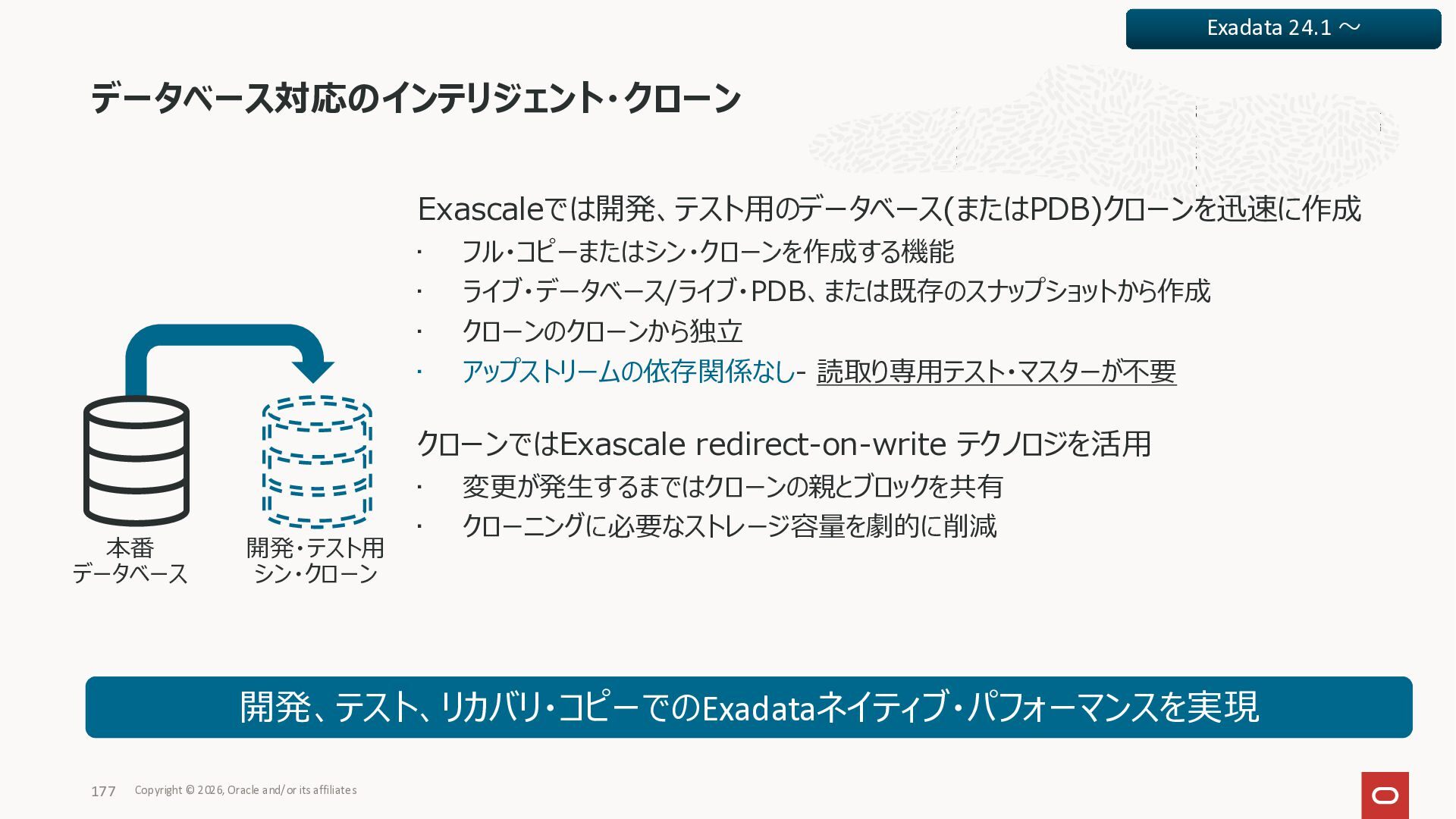 Exadata Exascaleストレージをネイティブにサ ポート • Direct I/OおよびRDMA操作を使用 165 Copyright © 2026, Oracle and/or its affiliates Exadata Storage Exadata Exascale Services と Exadata スマートストレージ機能 Storage Pools, Vault and Volume Management, redundancy and partnering, caching and tiering, file metadata management, snapshots and clones, data integrity, Smart Flash Cache, XRMEM Data Accelerator, Smart Scan, Storage Indexes, Columnar Caching, Bloom filters, 等 Oracle Grid Infrastructure Oracle AI Database 26ai Exadata Compute すべてのExadata Smart Storage機能 が利用可能