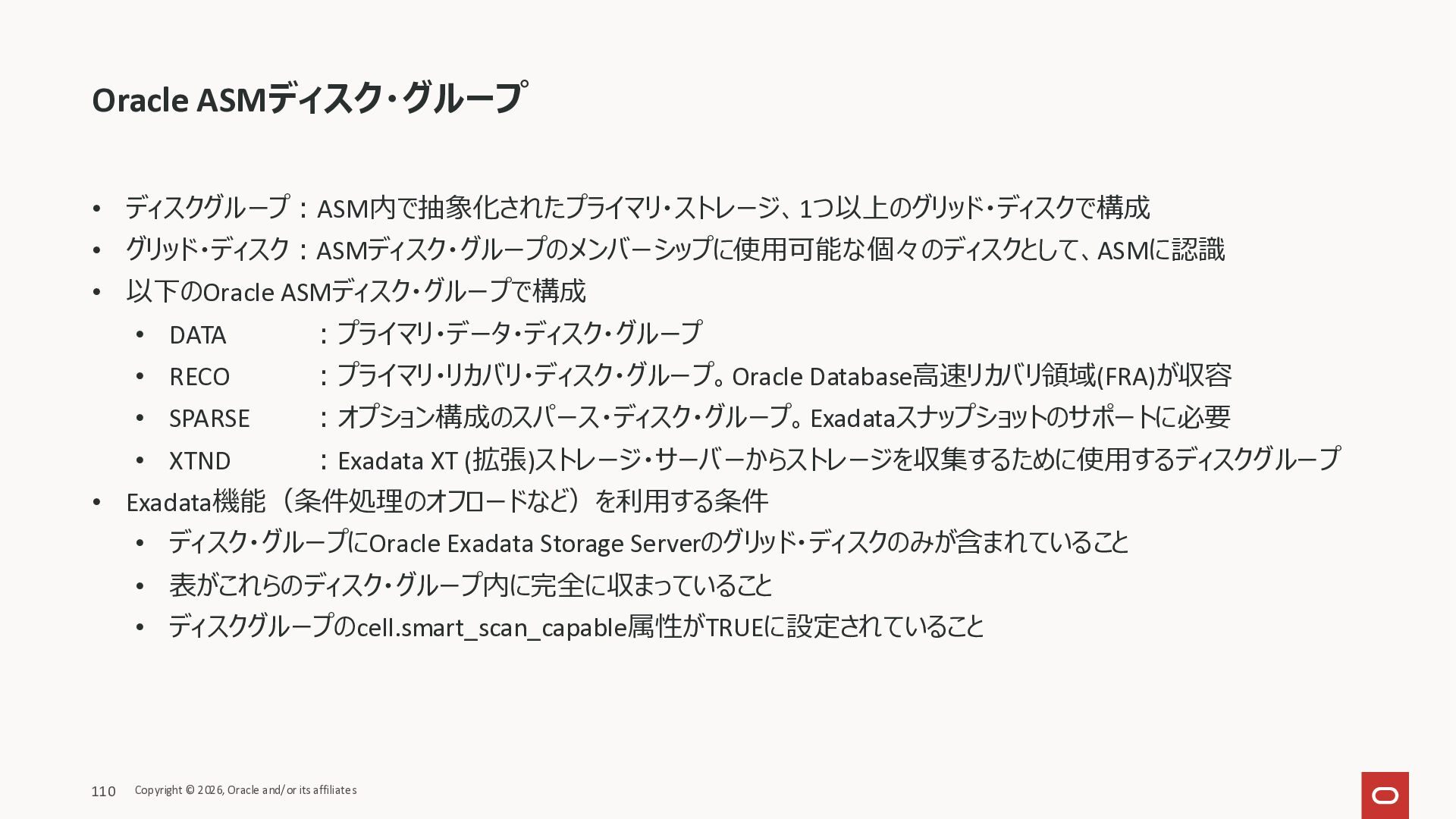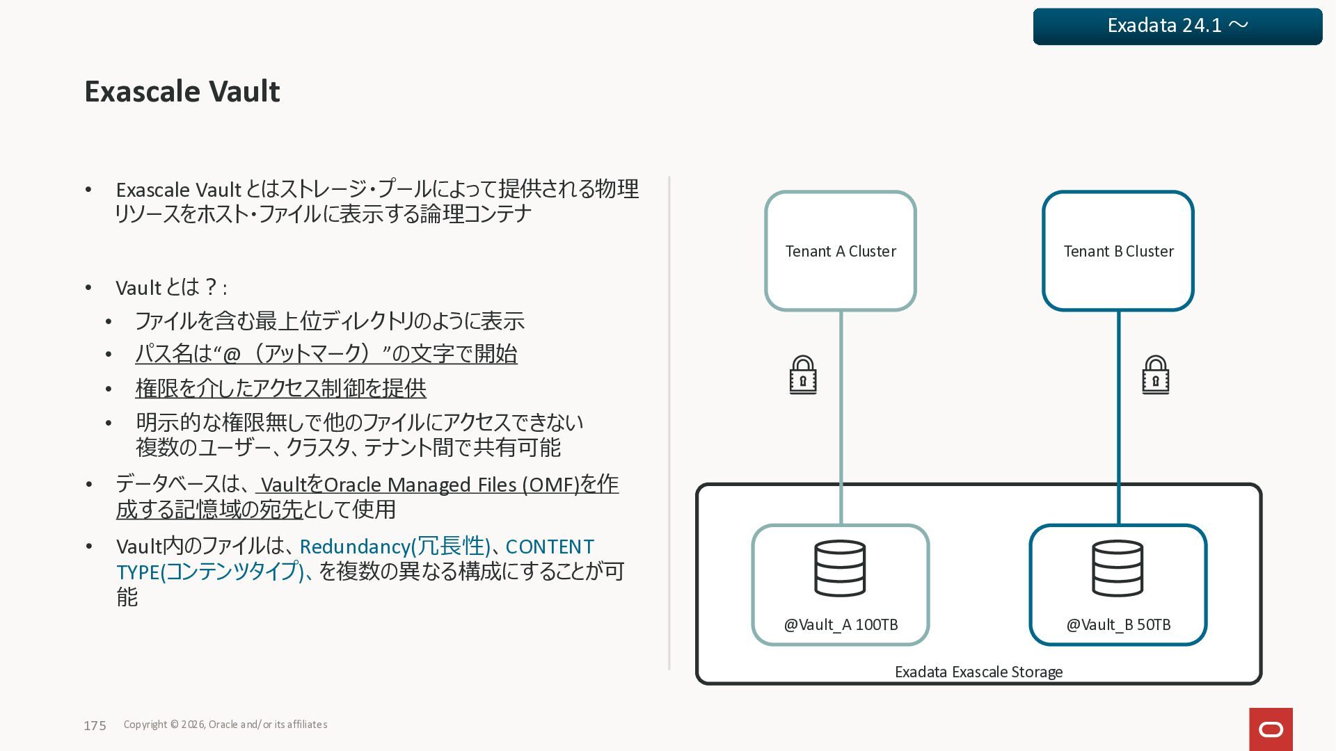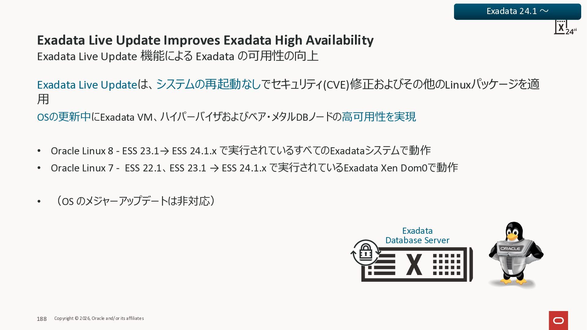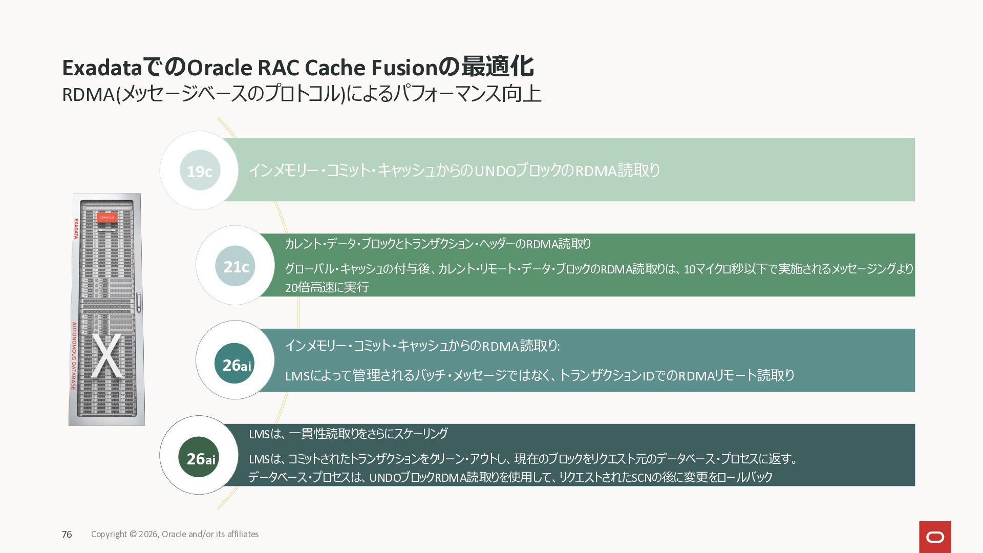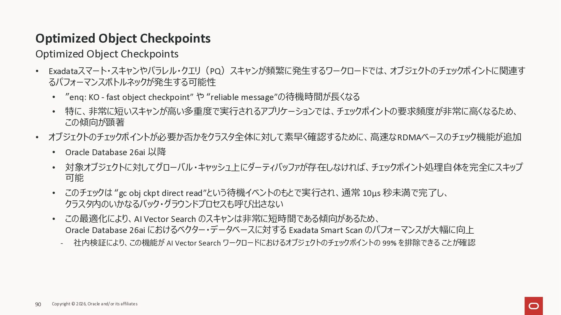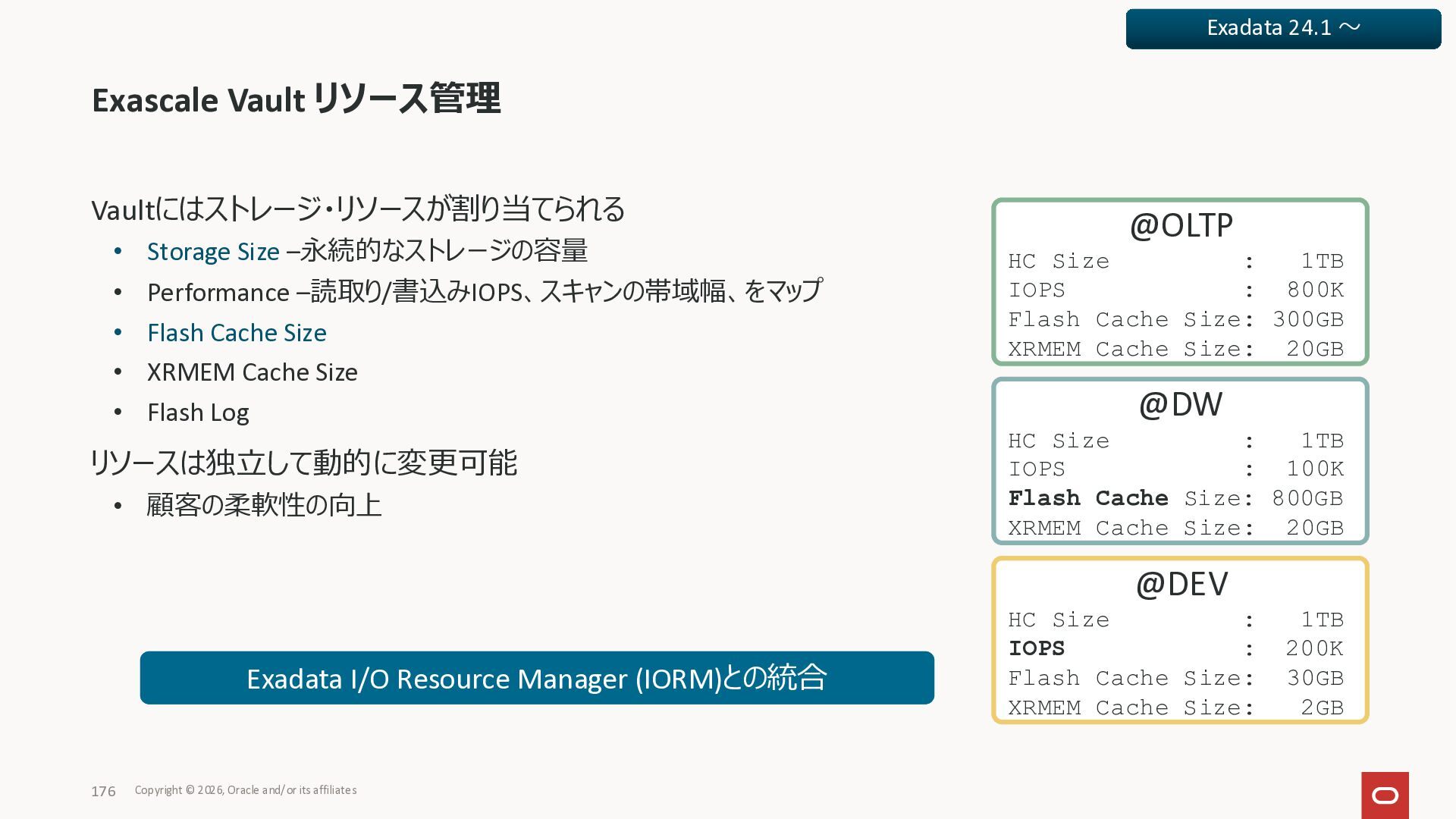 Exadata Exascaleストレージをネイティブにサ ポート • Direct I/OおよびRDMA操作を使用 165 Copyright © 2026, Oracle and/or its affiliates Exadata Storage Exadata Exascale Services と Exadata スマートストレージ機能 Storage Pools, Vault and Volume Management, redundancy and partnering, caching and tiering, file metadata management, snapshots and clones, data integrity, Smart Flash Cache, XRMEM Data Accelerator, Smart Scan, Storage Indexes, Columnar Caching, Bloom filters, 等 Oracle Grid Infrastructure Oracle AI Database 26ai Exadata Compute すべてのExadata Smart Storage機能 が利用可能