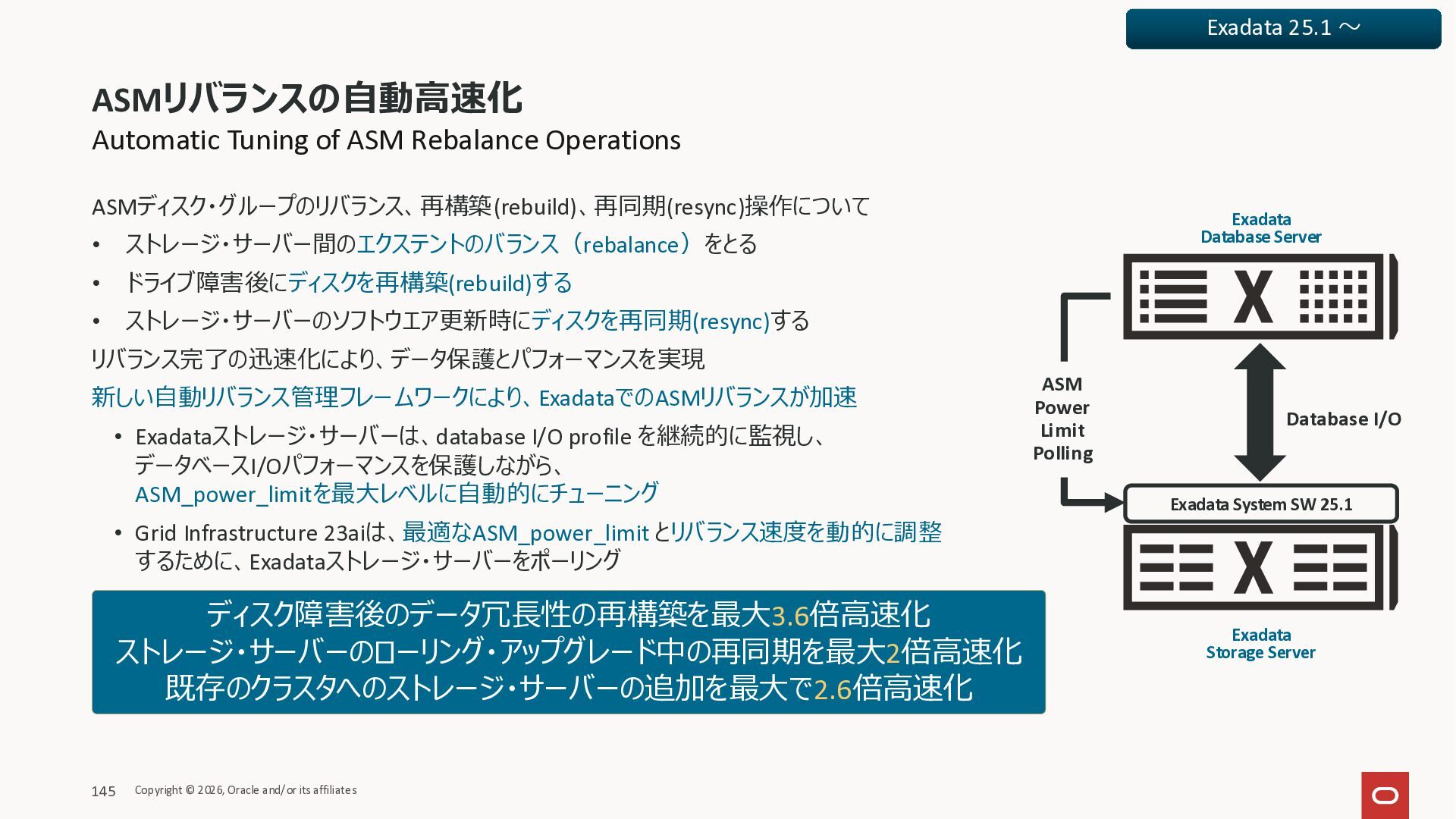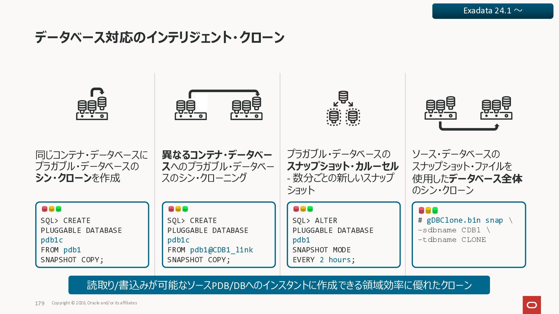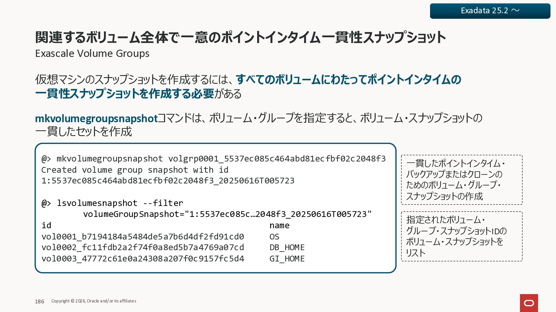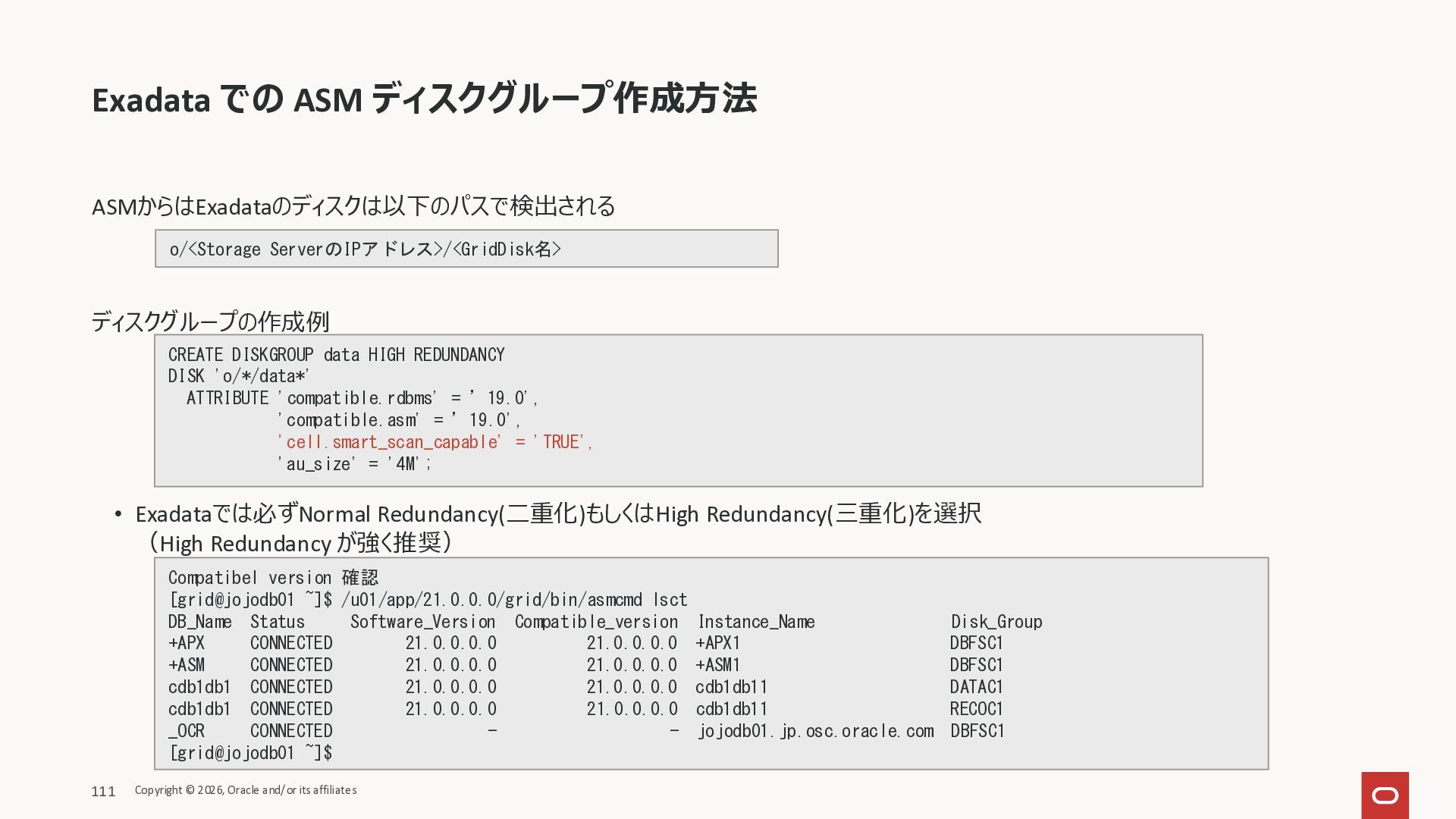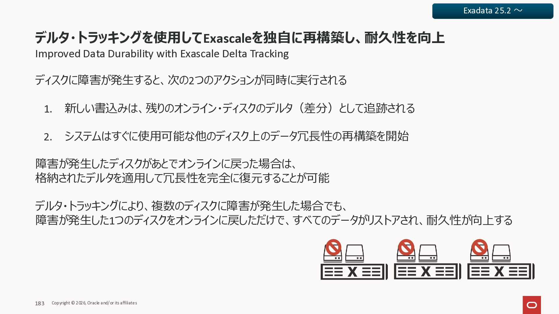 Exadata Exascaleストレージをネイティブにサ ポート • Direct I/OおよびRDMA操作を使用 165 Copyright © 2026, Oracle and/or its affiliates Exadata Storage Exadata Exascale Services と Exadata スマートストレージ機能 Storage Pools, Vault and Volume Management, redundancy and partnering, caching and tiering, file metadata management, snapshots and clones, data integrity, Smart Flash Cache, XRMEM Data Accelerator, Smart Scan, Storage Indexes, Columnar Caching, Bloom filters, 等 Oracle Grid Infrastructure Oracle AI Database 26ai Exadata Compute すべてのExadata Smart Storage機能 が利用可能