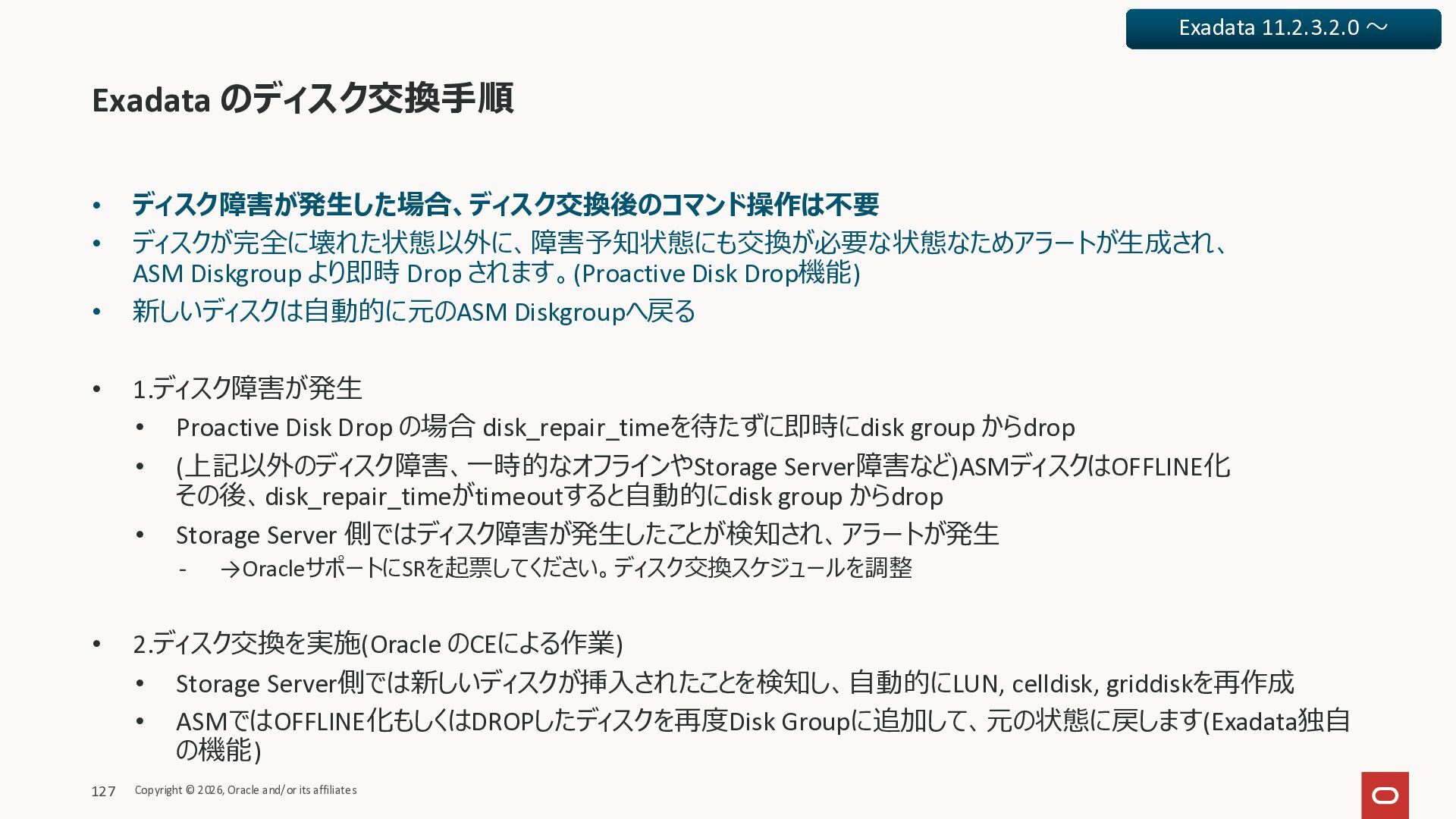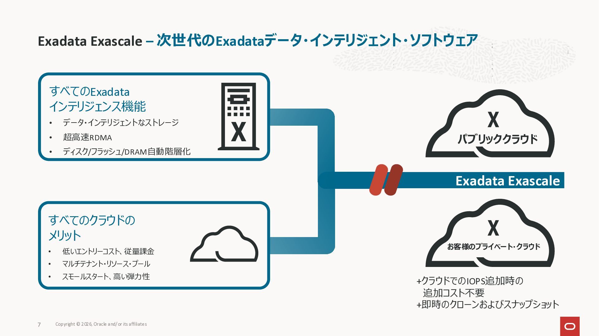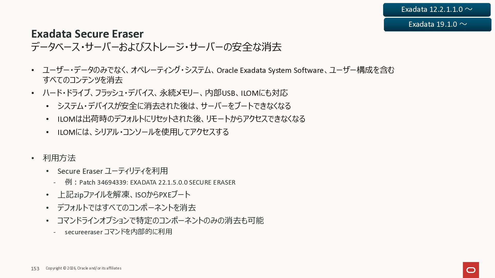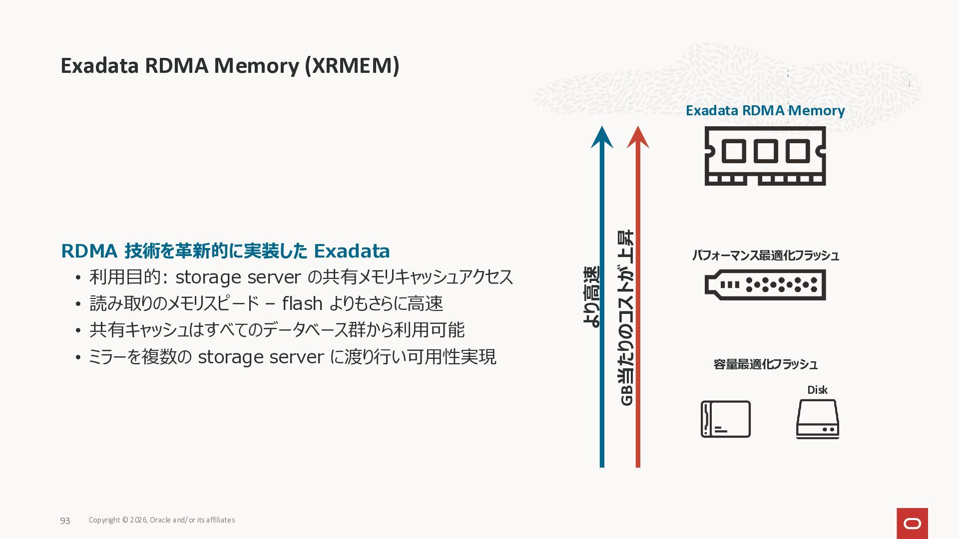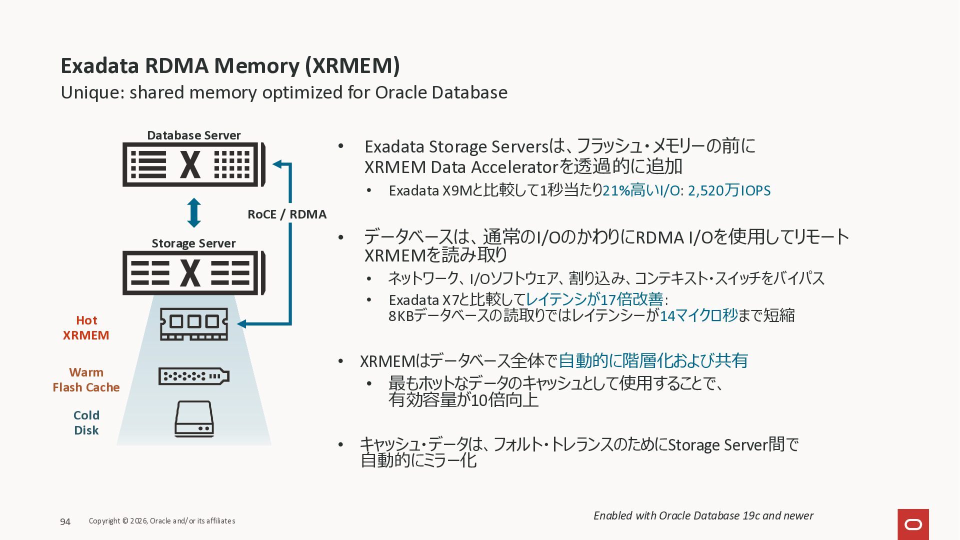 Exadata Exascaleストレージをネイティブにサ ポート • Direct I/OおよびRDMA操作を使用 165 Copyright © 2026, Oracle and/or its affiliates Exadata Storage Exadata Exascale Services と Exadata スマートストレージ機能 Storage Pools, Vault and Volume Management, redundancy and partnering, caching and tiering, file metadata management, snapshots and clones, data integrity, Smart Flash Cache, XRMEM Data Accelerator, Smart Scan, Storage Indexes, Columnar Caching, Bloom filters, 等 Oracle Grid Infrastructure Oracle AI Database 26ai Exadata Compute すべてのExadata Smart Storage機能 が利用可能