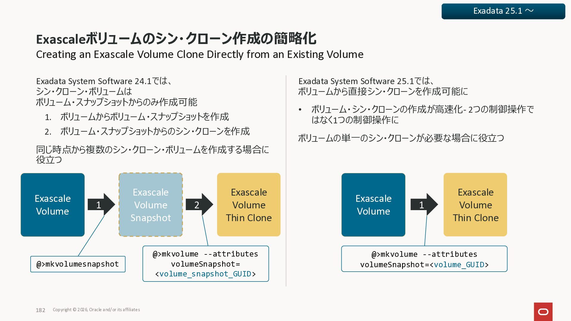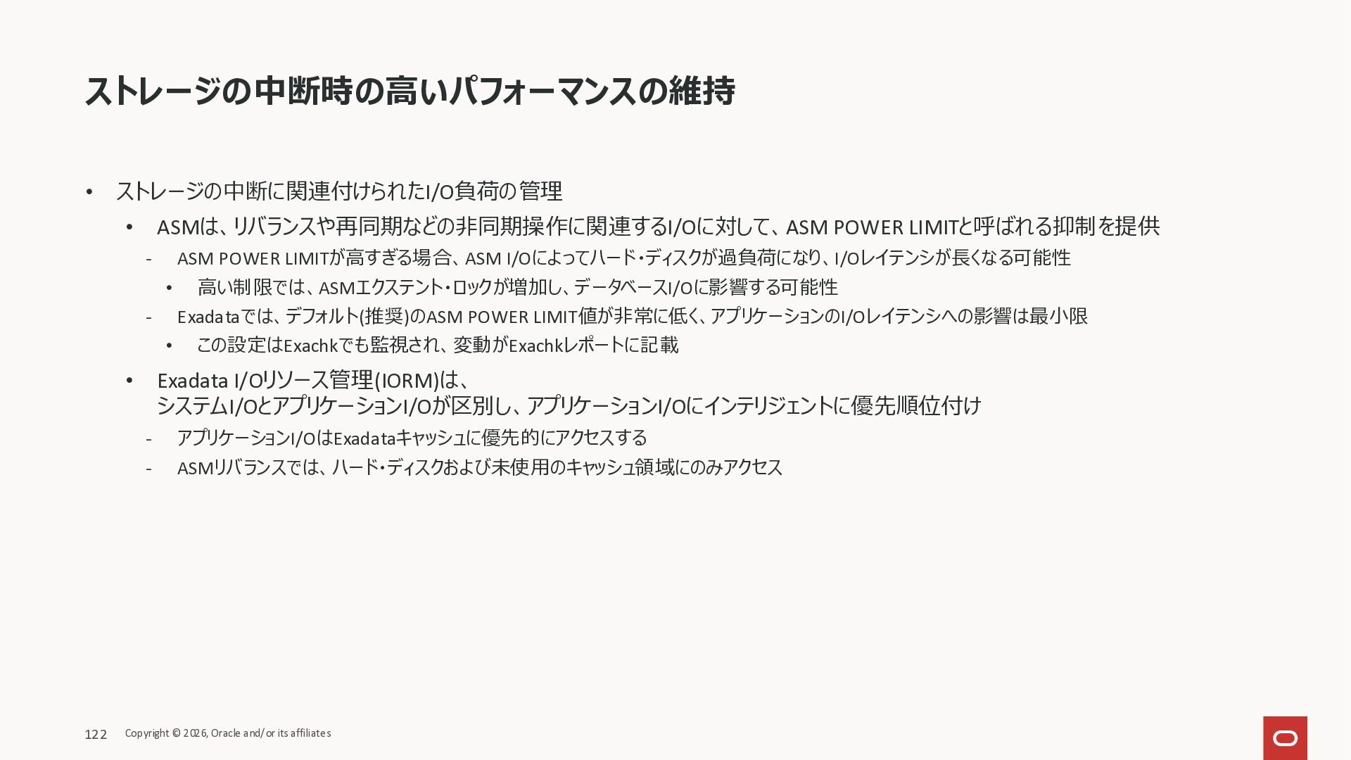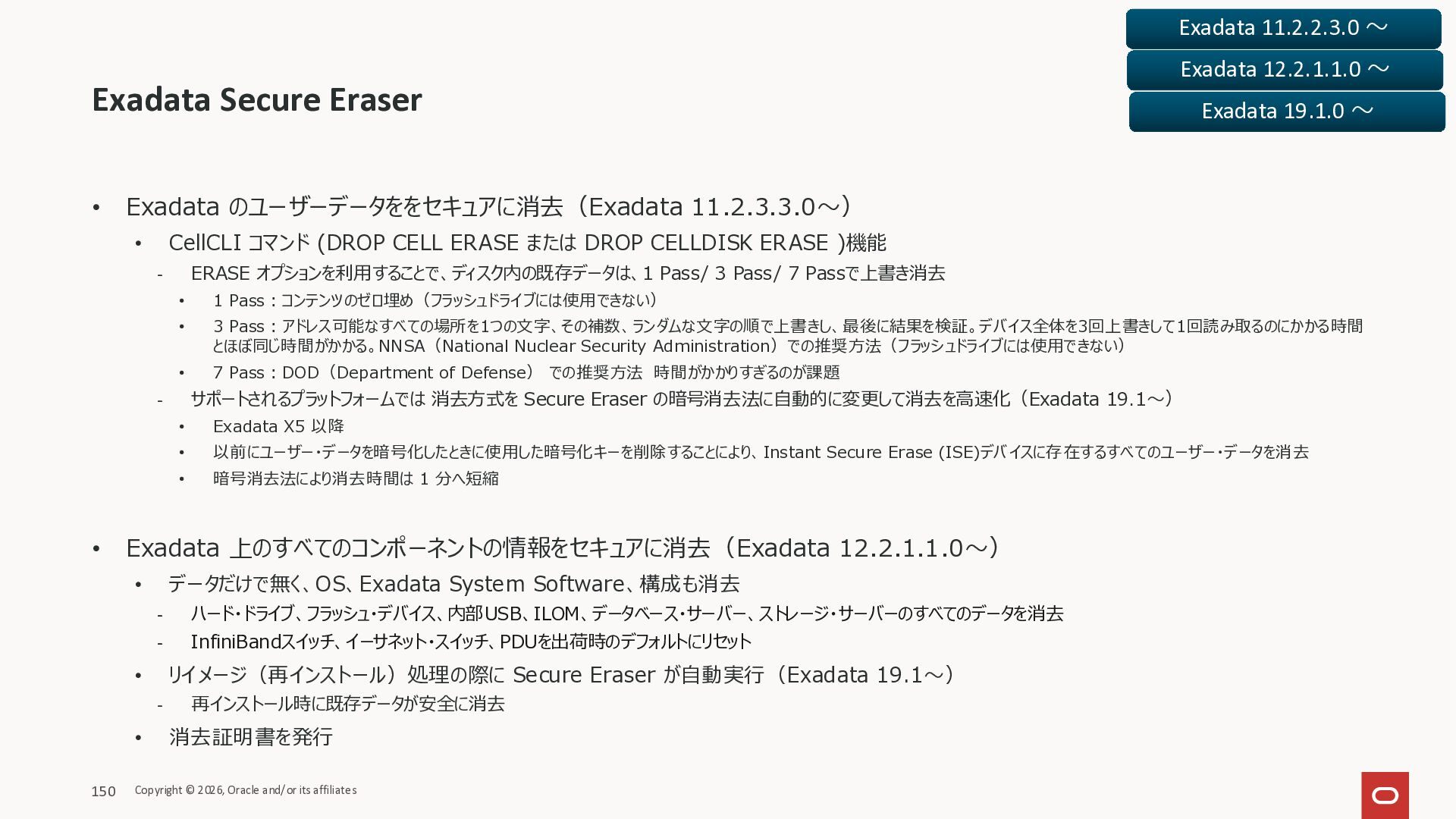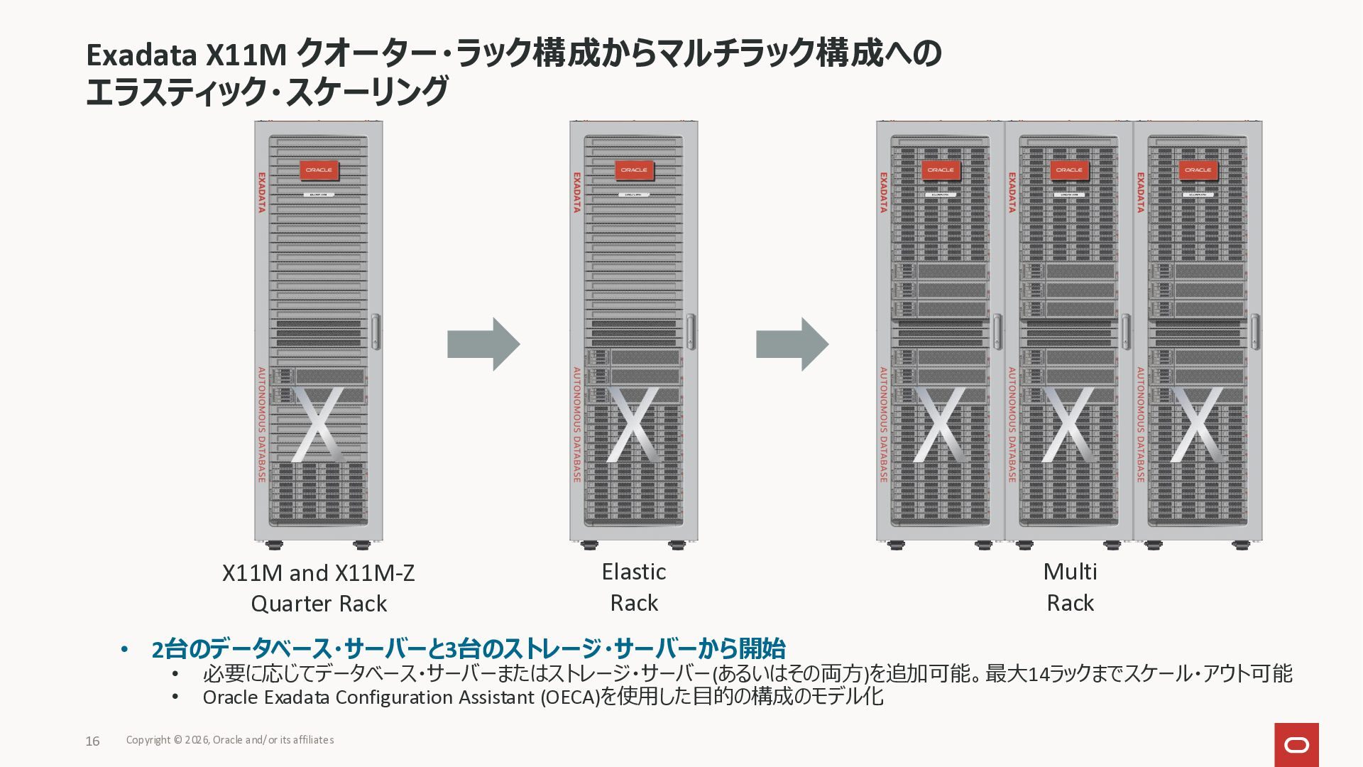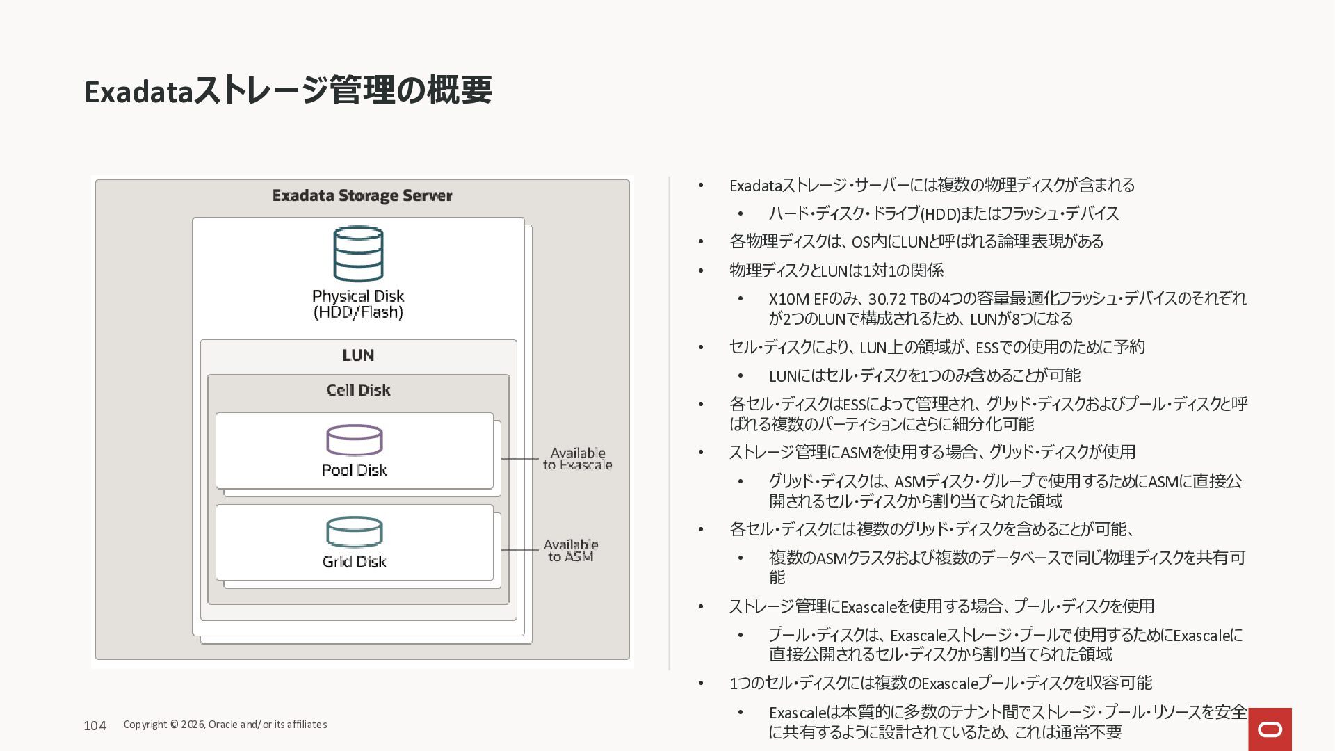 Exadata Exascaleストレージをネイティブにサ ポート • Direct I/OおよびRDMA操作を使用 165 Copyright © 2026, Oracle and/or its affiliates Exadata Storage Exadata Exascale Services と Exadata スマートストレージ機能 Storage Pools, Vault and Volume Management, redundancy and partnering, caching and tiering, file metadata management, snapshots and clones, data integrity, Smart Flash Cache, XRMEM Data Accelerator, Smart Scan, Storage Indexes, Columnar Caching, Bloom filters, 等 Oracle Grid Infrastructure Oracle AI Database 26ai Exadata Compute すべてのExadata Smart Storage機能 が利用可能