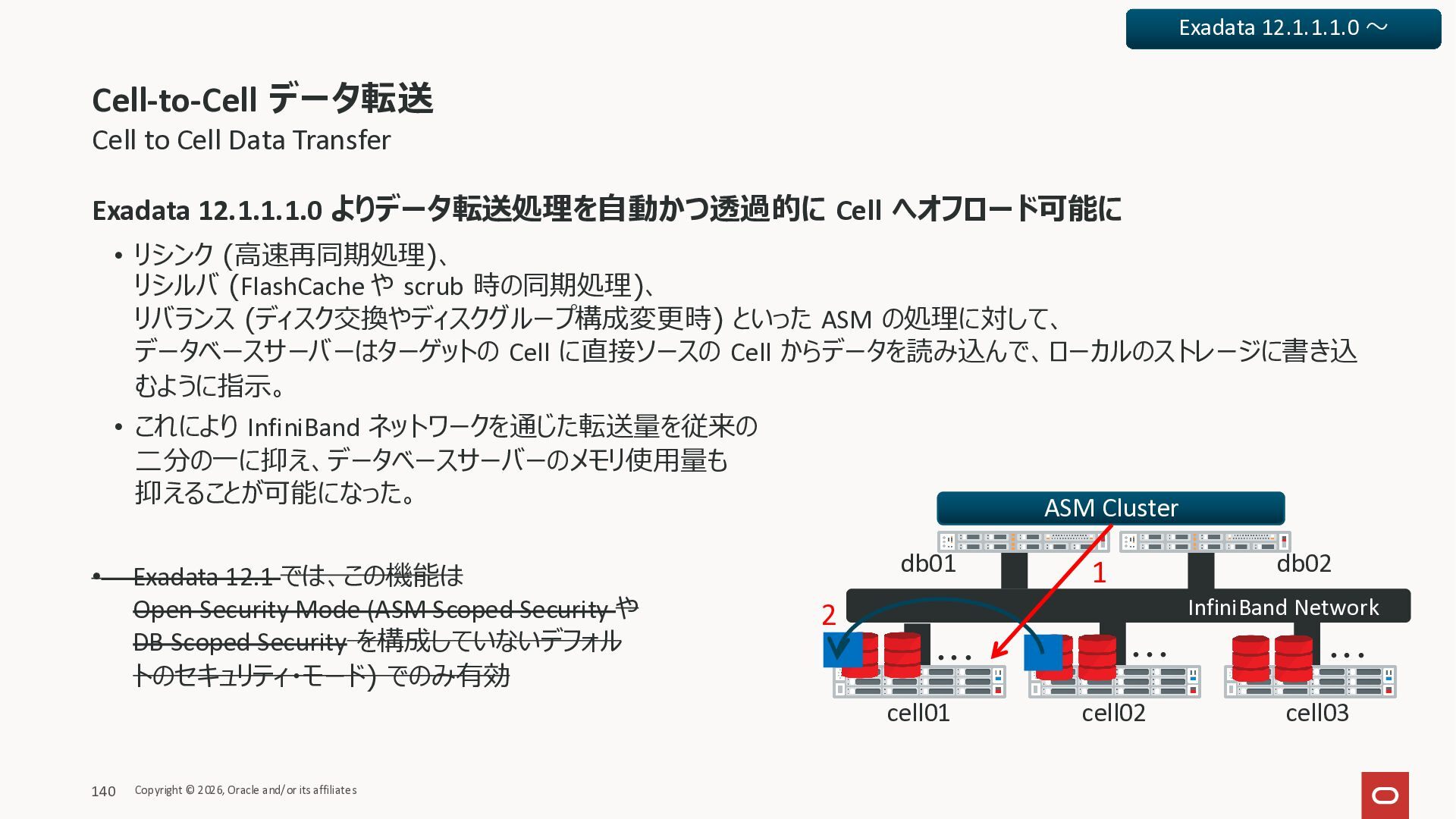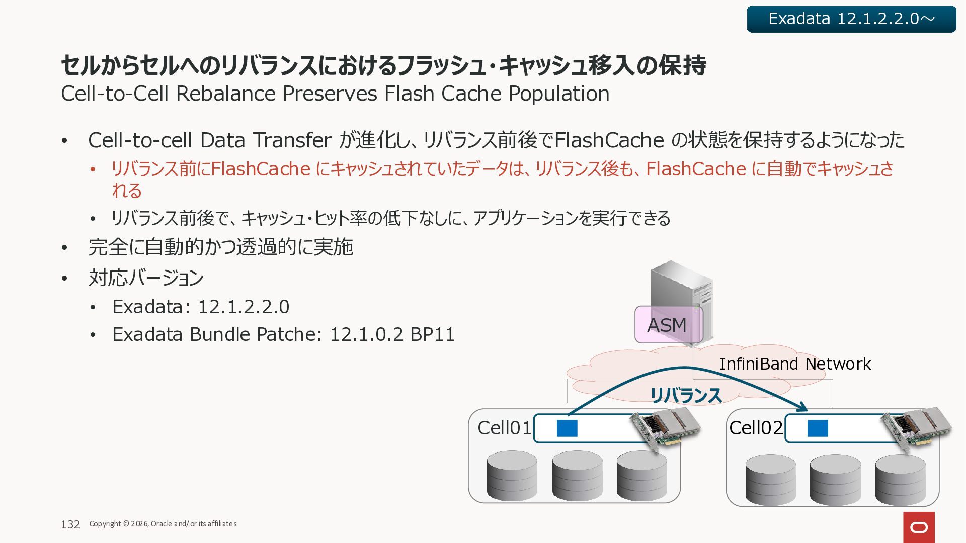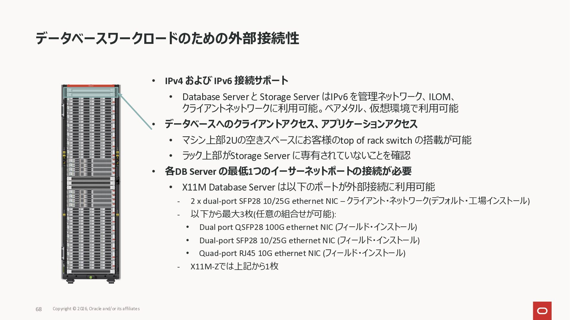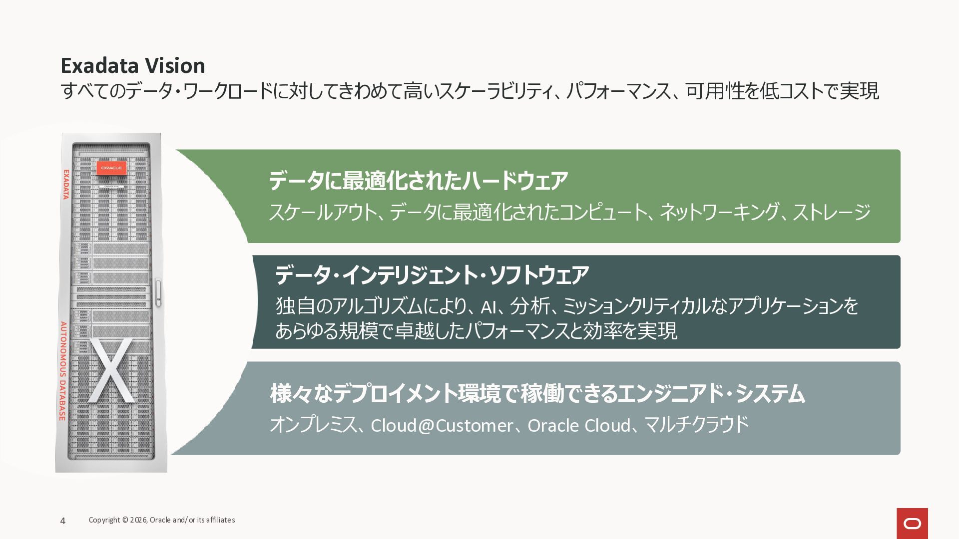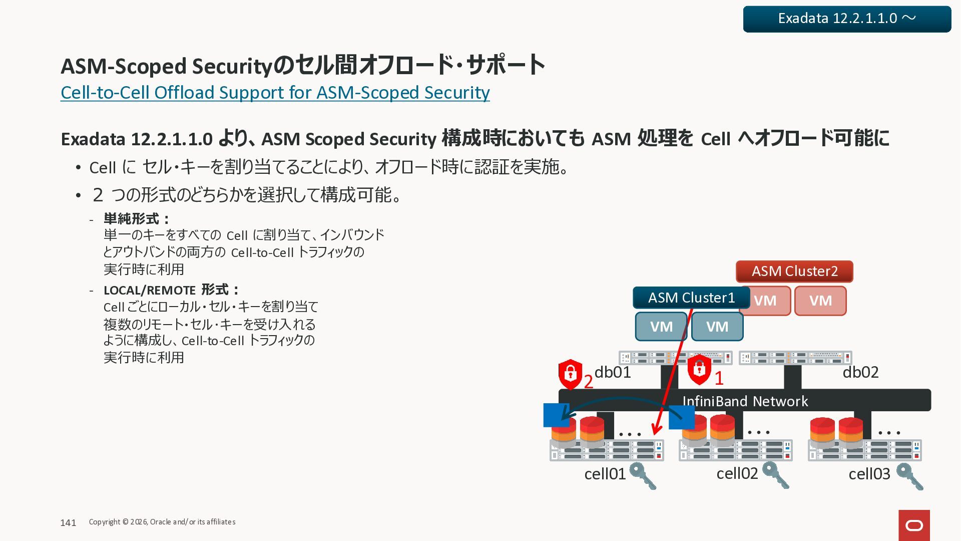Exadata Exascaleストレージをネイティブにサ ポート • Direct I/OおよびRDMA操作を使用 165 Copyright © 2026, Oracle and/or its affiliates Exadata Storage Exadata Exascale Services と Exadata スマートストレージ機能 Storage Pools, Vault and Volume Management, redundancy and partnering, caching and tiering, file metadata management, snapshots and clones, data integrity, Smart Flash Cache, XRMEM Data Accelerator, Smart Scan, Storage Indexes, Columnar Caching, Bloom filters, 等 Oracle Grid Infrastructure Oracle AI Database 26ai Exadata Compute すべてのExadata Smart Storage機能 が利用可能