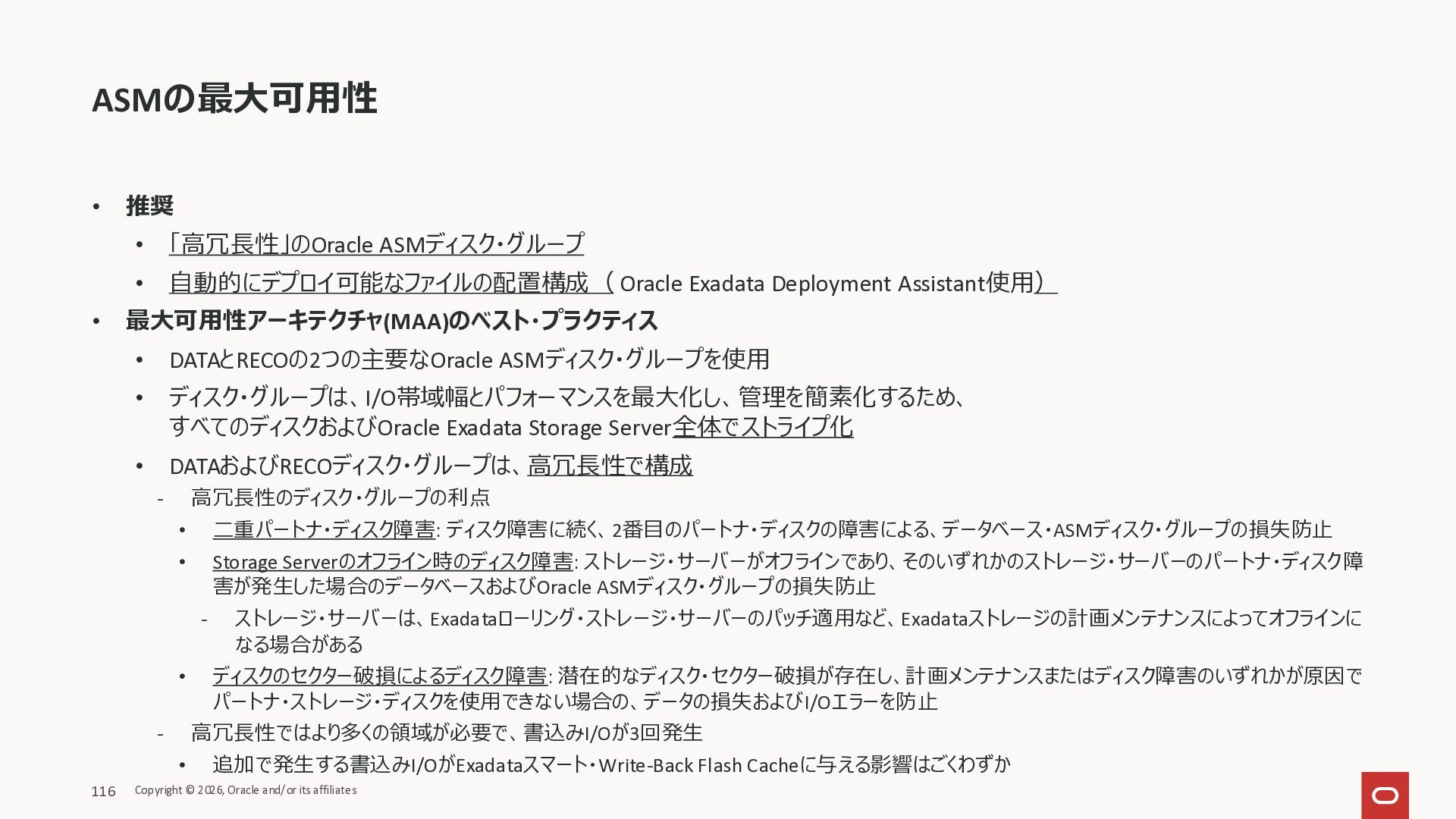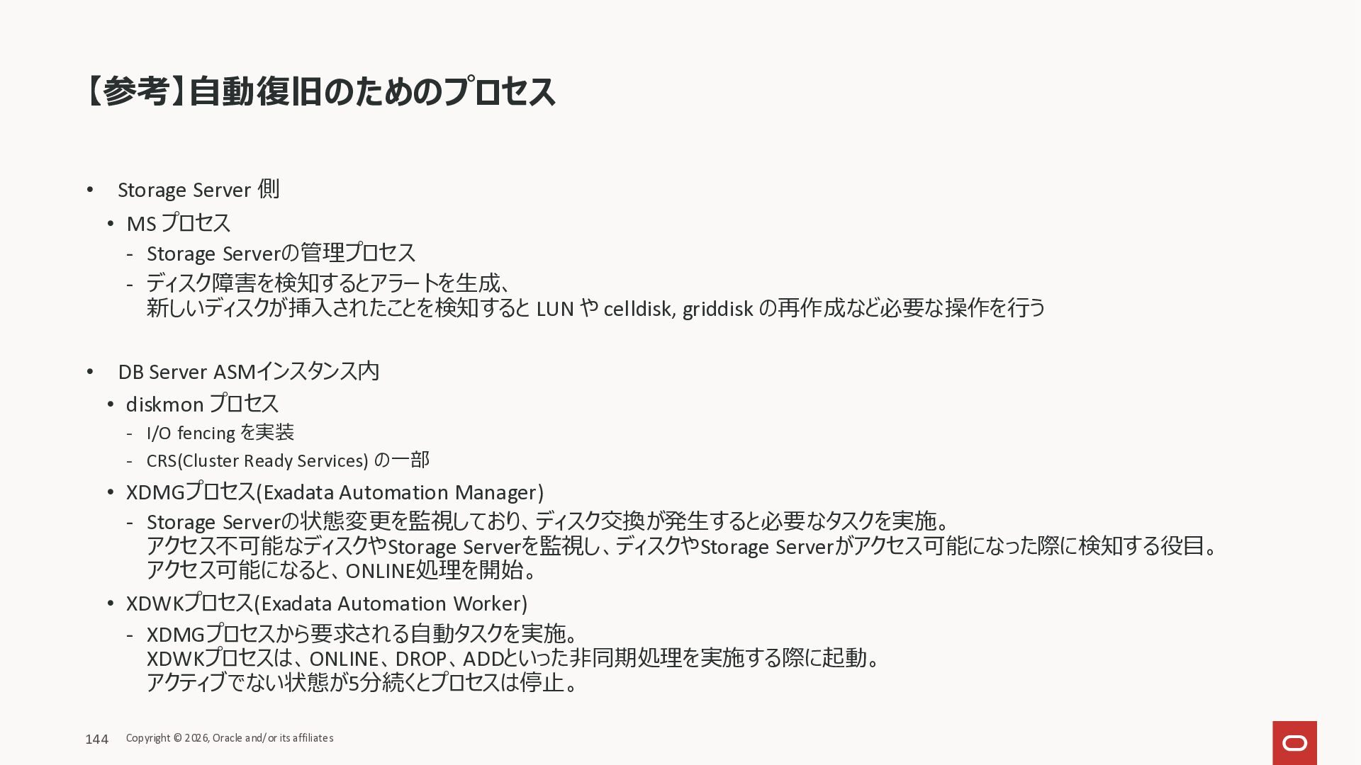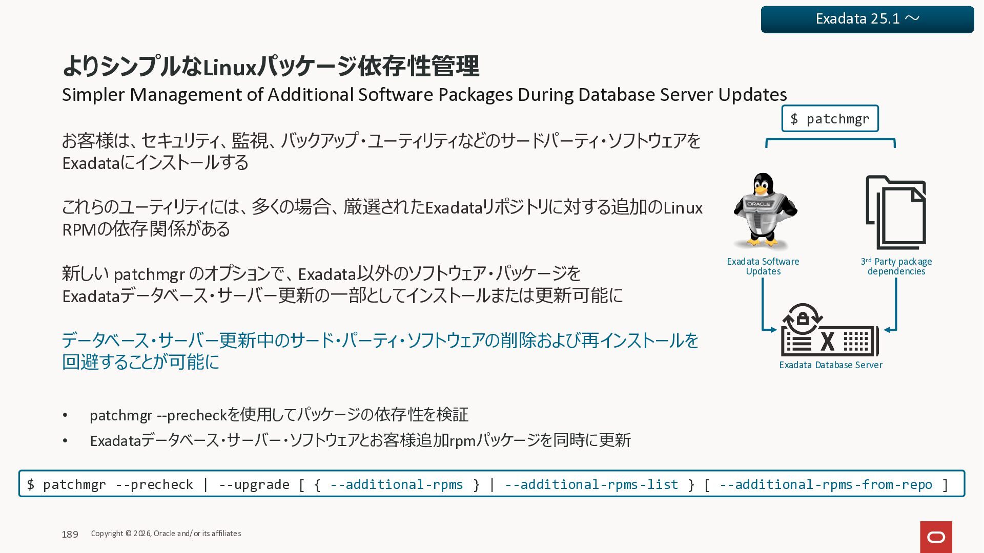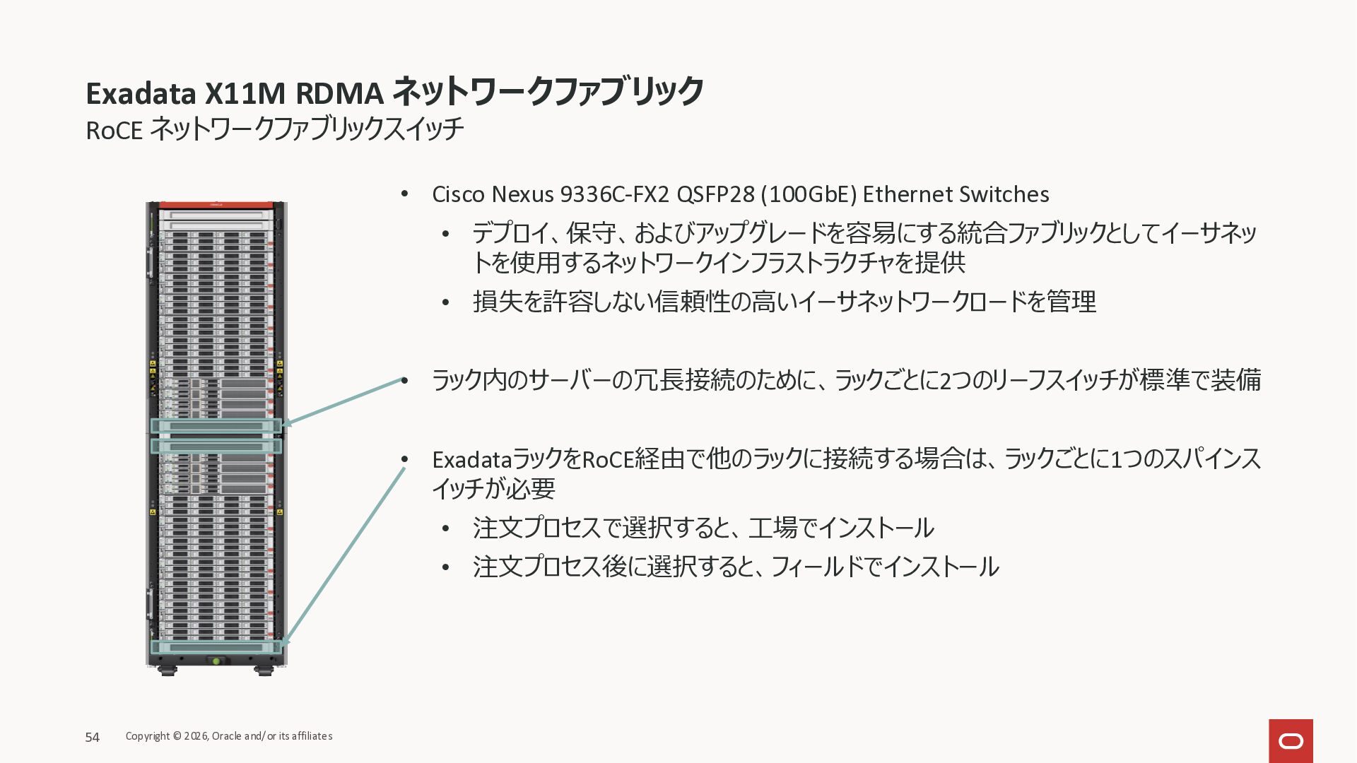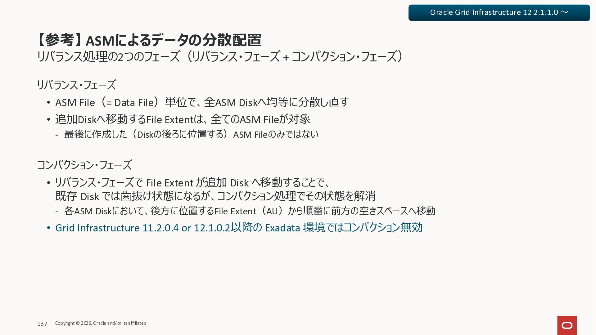 Exadata Exascaleストレージをネイティブにサ ポート • Direct I/OおよびRDMA操作を使用 165 Copyright © 2026, Oracle and/or its affiliates Exadata Storage Exadata Exascale Services と Exadata スマートストレージ機能 Storage Pools, Vault and Volume Management, redundancy and partnering, caching and tiering, file metadata management, snapshots and clones, data integrity, Smart Flash Cache, XRMEM Data Accelerator, Smart Scan, Storage Indexes, Columnar Caching, Bloom filters, 等 Oracle Grid Infrastructure Oracle AI Database 26ai Exadata Compute すべてのExadata Smart Storage機能 が利用可能
