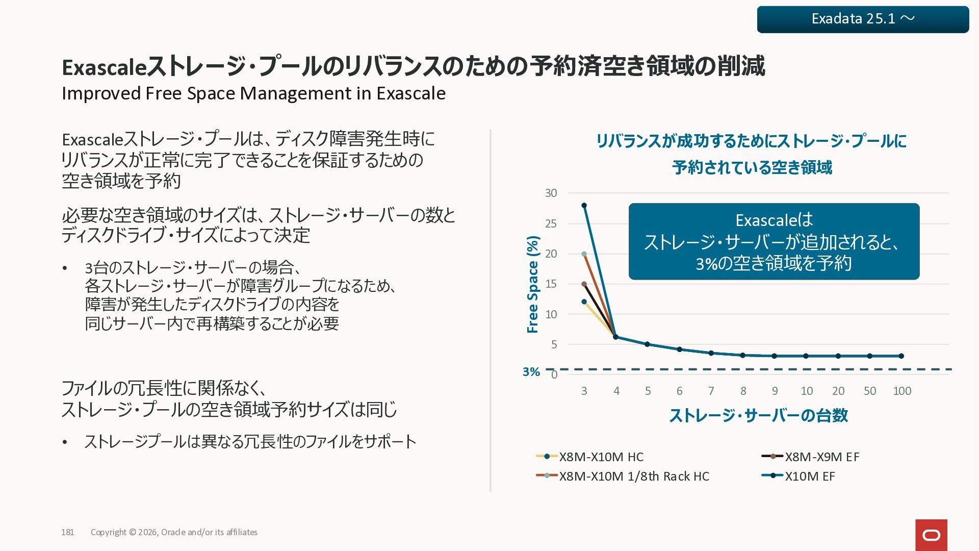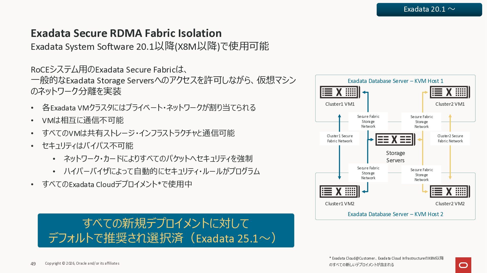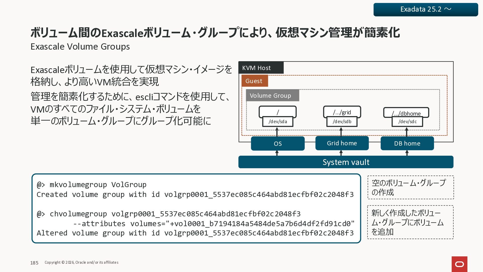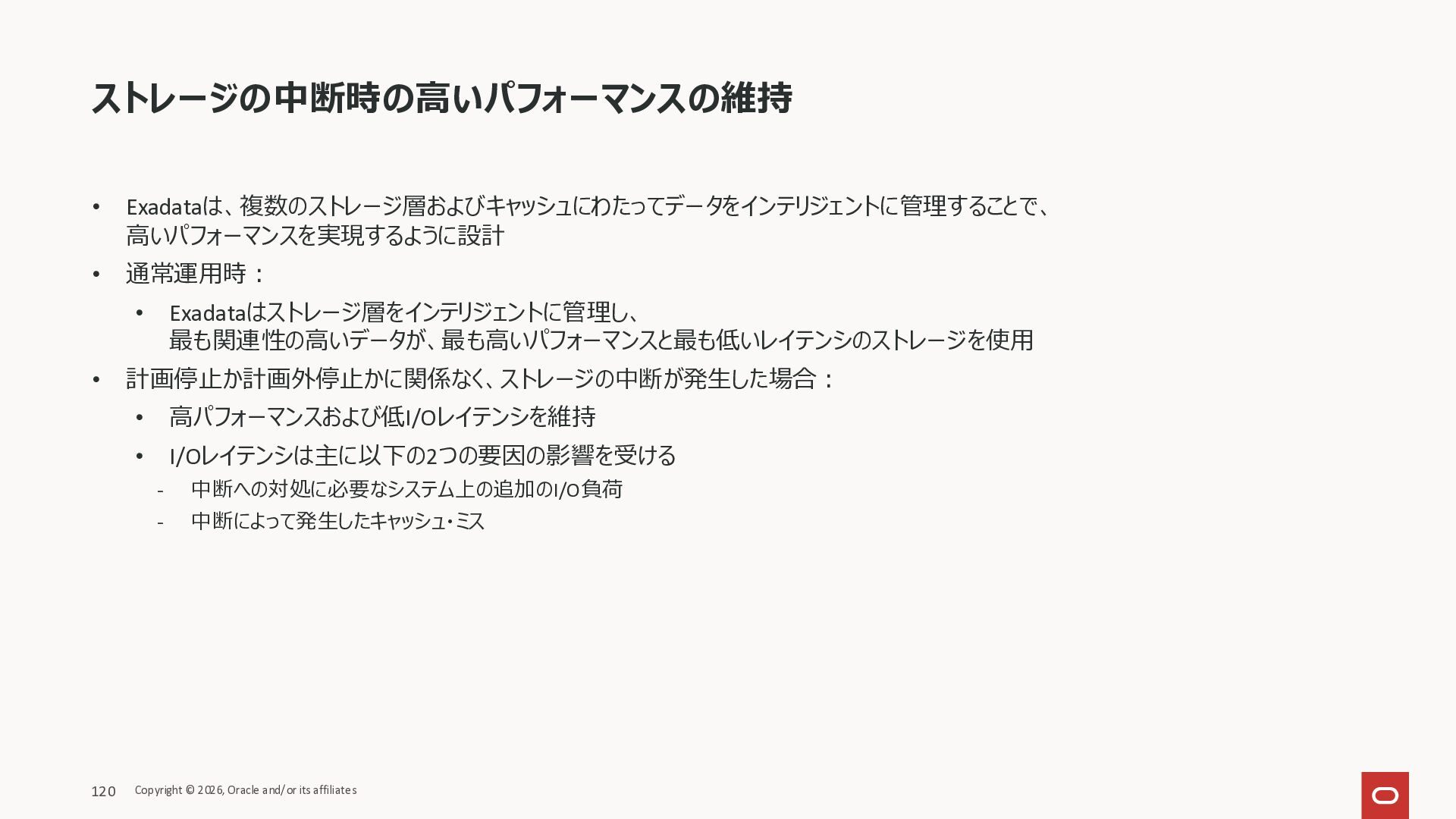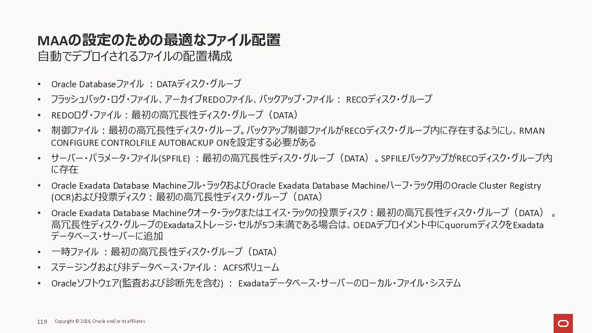 Exadata Exascaleストレージをネイティブにサ ポート • Direct I/OおよびRDMA操作を使用 165 Copyright © 2026, Oracle and/or its affiliates Exadata Storage Exadata Exascale Services と Exadata スマートストレージ機能 Storage Pools, Vault and Volume Management, redundancy and partnering, caching and tiering, file metadata management, snapshots and clones, data integrity, Smart Flash Cache, XRMEM Data Accelerator, Smart Scan, Storage Indexes, Columnar Caching, Bloom filters, 等 Oracle Grid Infrastructure Oracle AI Database 26ai Exadata Compute すべてのExadata Smart Storage機能 が利用可能
