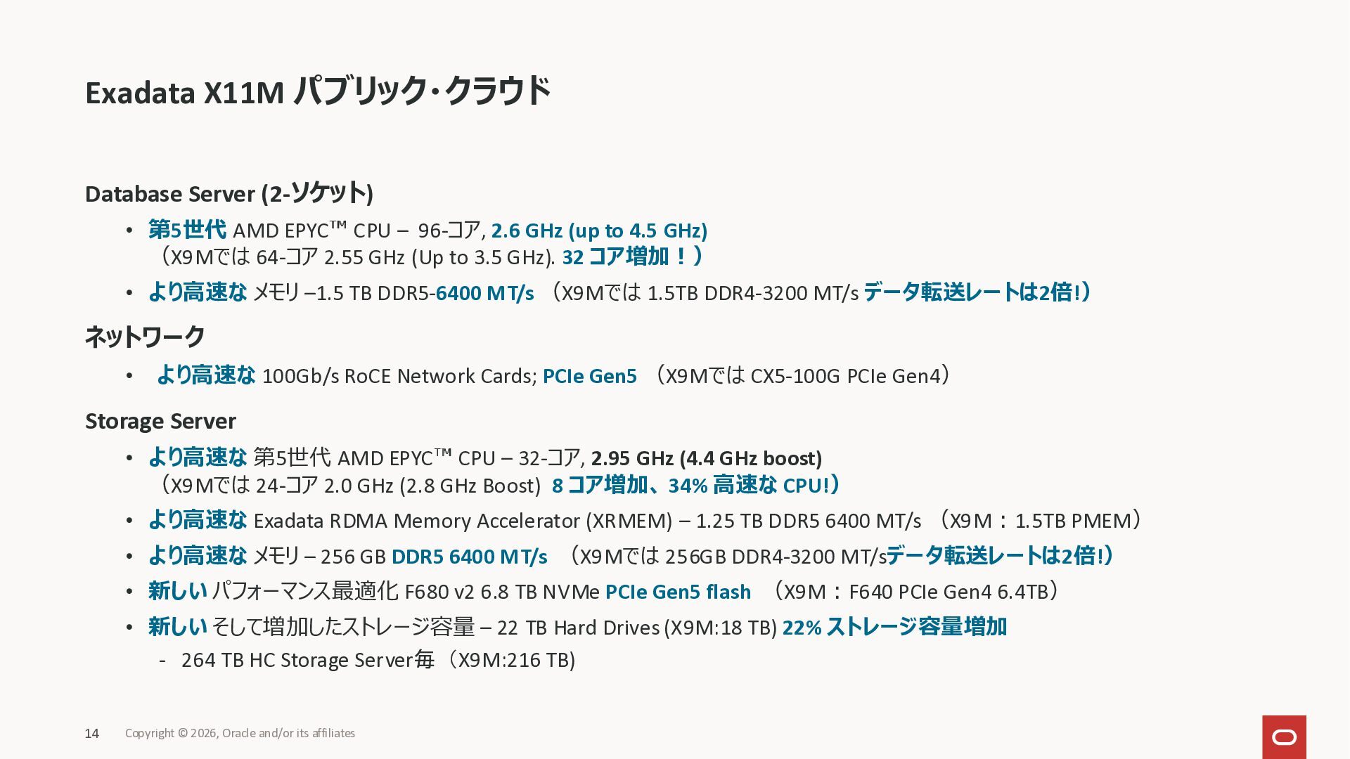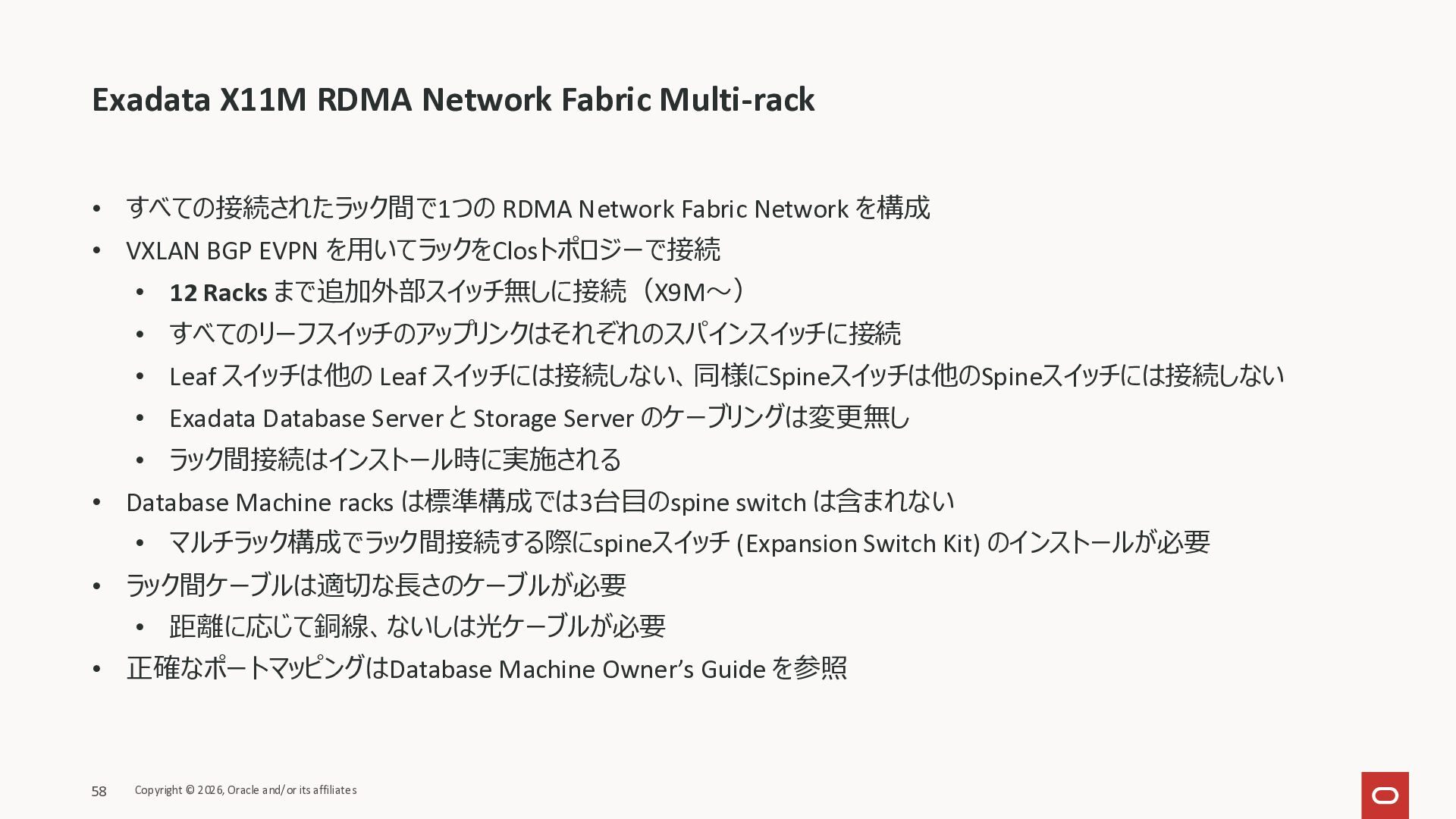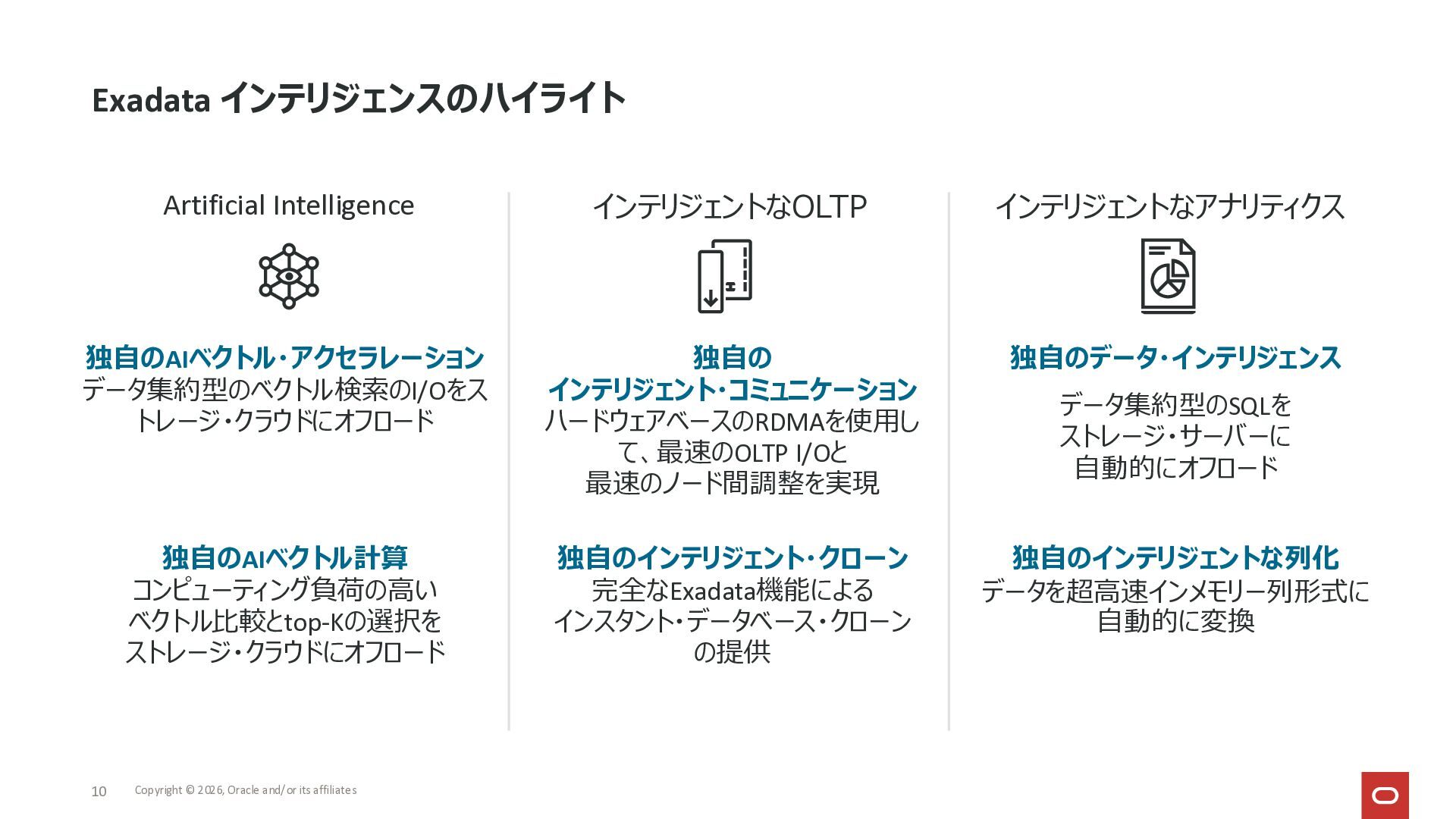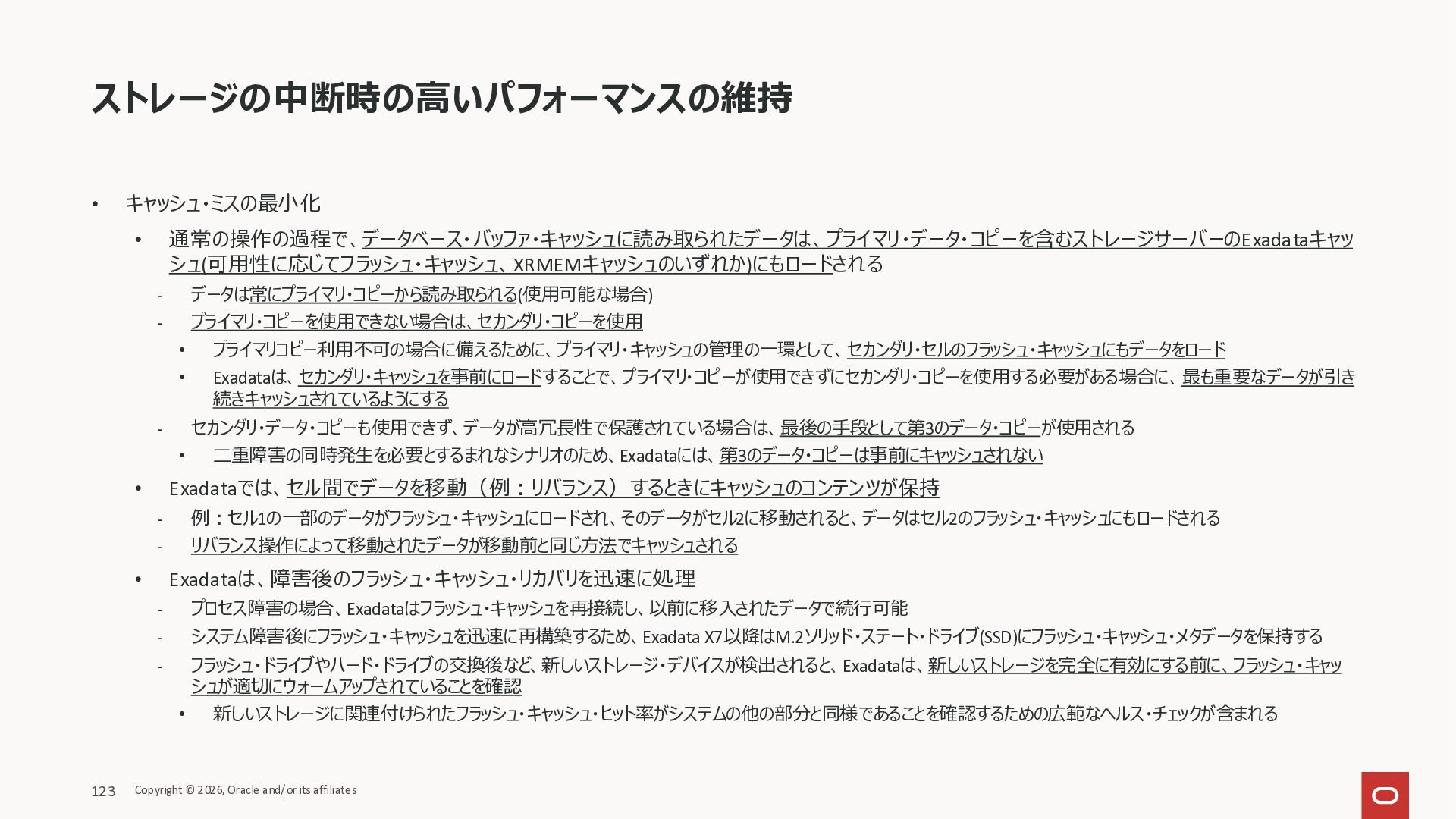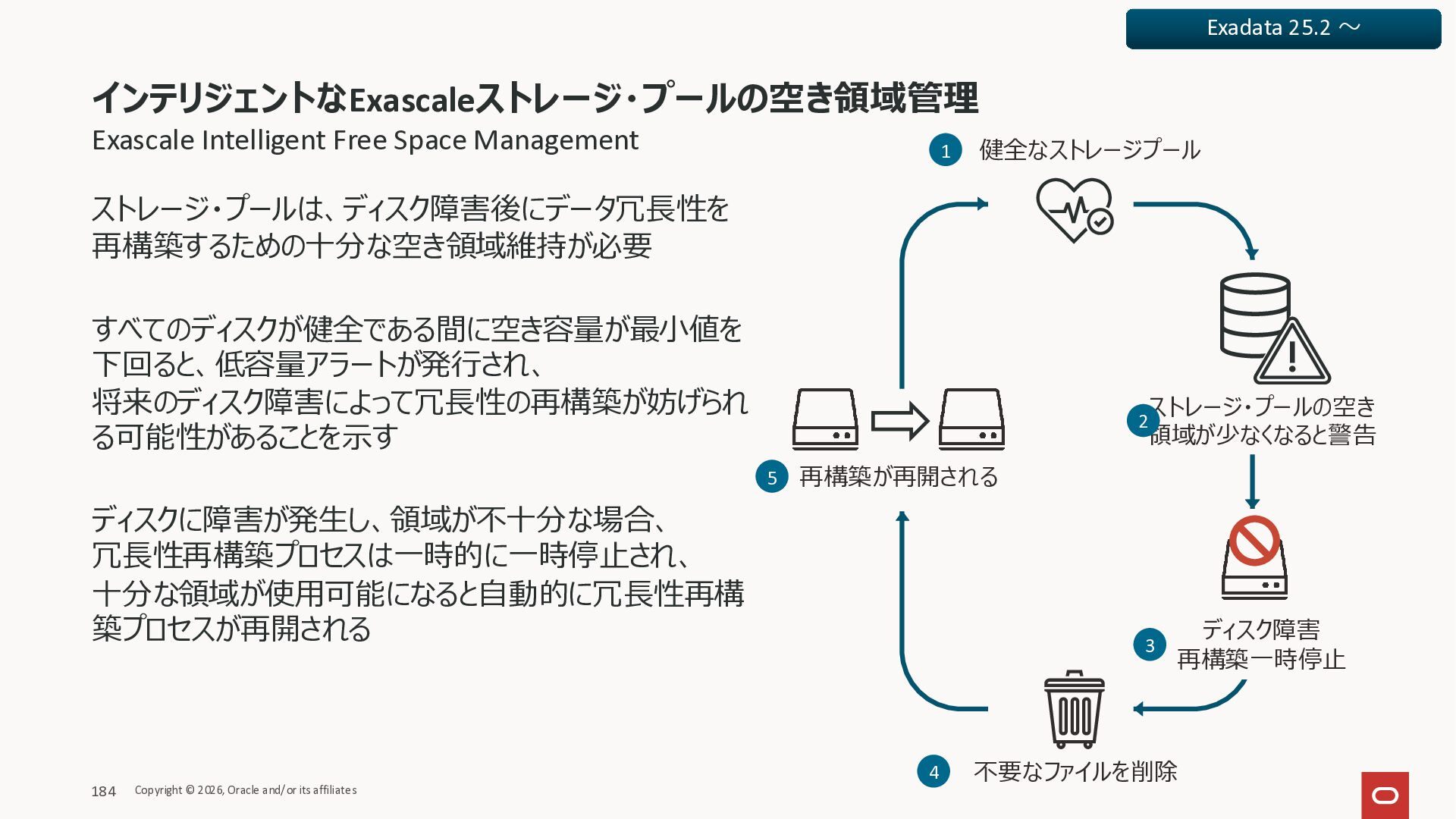 Exadata Exascaleストレージをネイティブにサ ポート • Direct I/OおよびRDMA操作を使用 165 Copyright © 2026, Oracle and/or its affiliates Exadata Storage Exadata Exascale Services と Exadata スマートストレージ機能 Storage Pools, Vault and Volume Management, redundancy and partnering, caching and tiering, file metadata management, snapshots and clones, data integrity, Smart Flash Cache, XRMEM Data Accelerator, Smart Scan, Storage Indexes, Columnar Caching, Bloom filters, 等 Oracle Grid Infrastructure Oracle AI Database 26ai Exadata Compute すべてのExadata Smart Storage機能 が利用可能