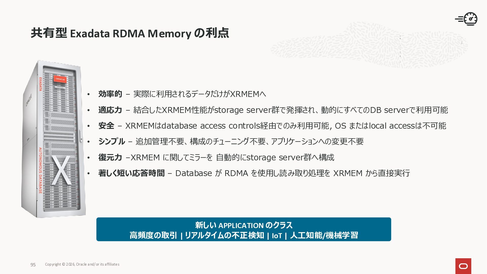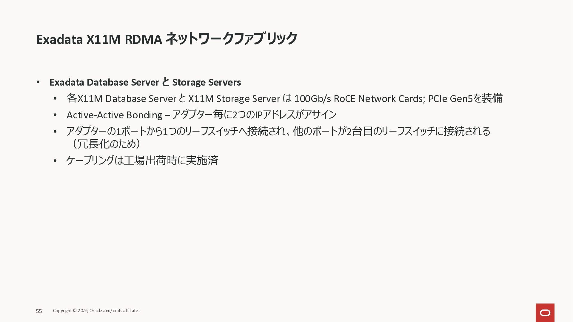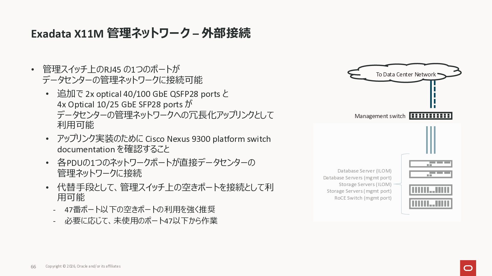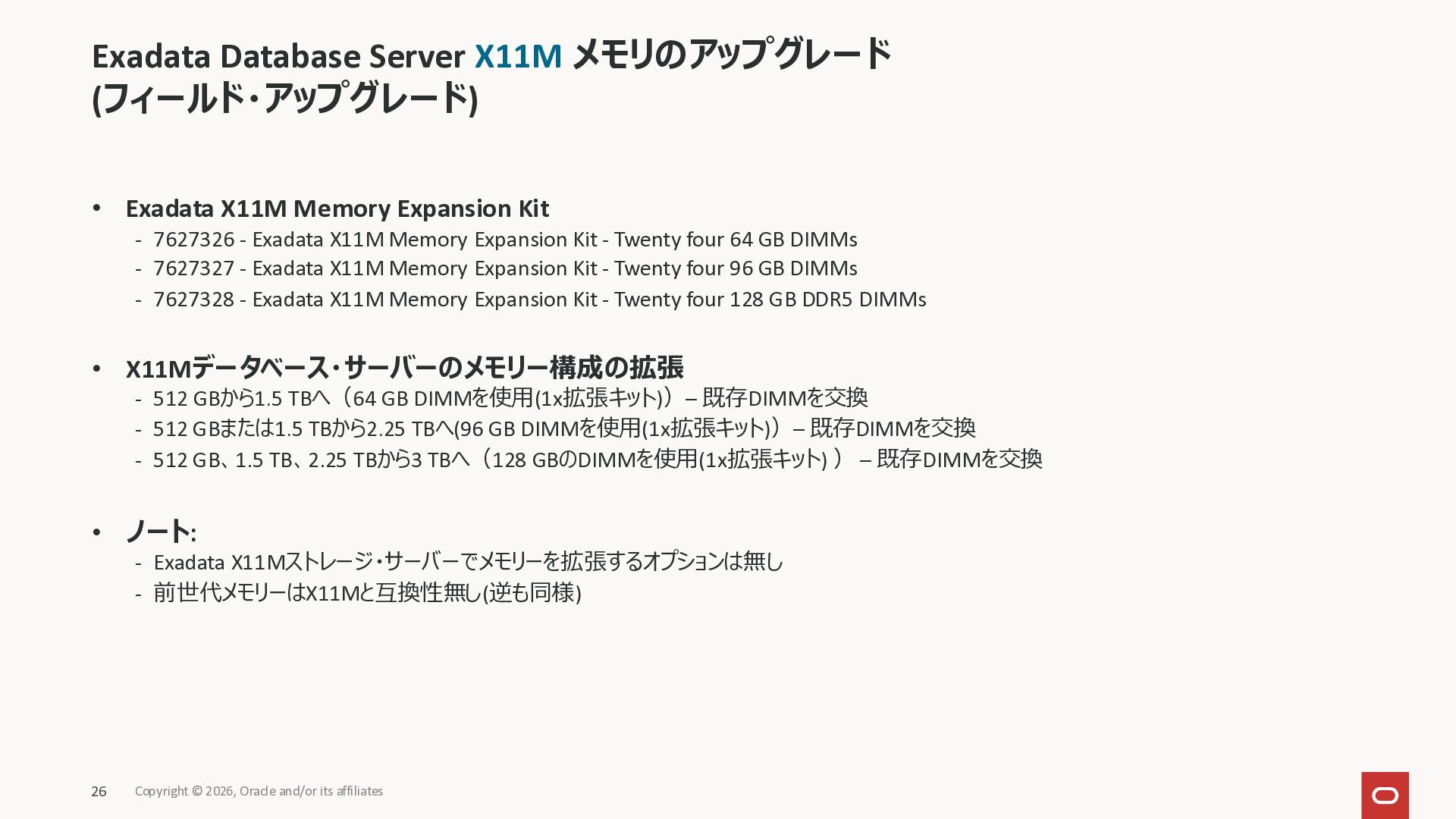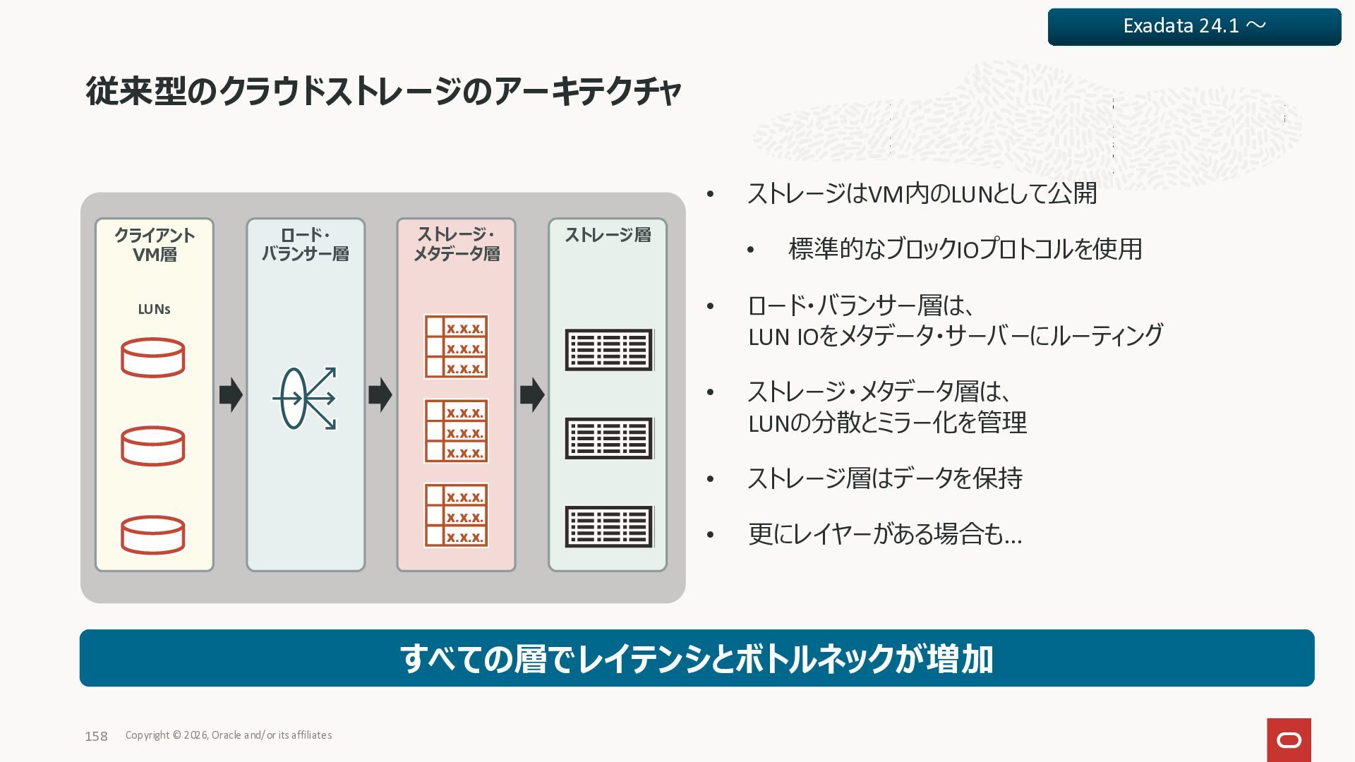 Exadata Exascaleストレージをネイティブにサ ポート • Direct I/OおよびRDMA操作を使用 165 Copyright © 2026, Oracle and/or its affiliates Exadata Storage Exadata Exascale Services と Exadata スマートストレージ機能 Storage Pools, Vault and Volume Management, redundancy and partnering, caching and tiering, file metadata management, snapshots and clones, data integrity, Smart Flash Cache, XRMEM Data Accelerator, Smart Scan, Storage Indexes, Columnar Caching, Bloom filters, 等 Oracle Grid Infrastructure Oracle AI Database 26ai Exadata Compute すべてのExadata Smart Storage機能 が利用可能