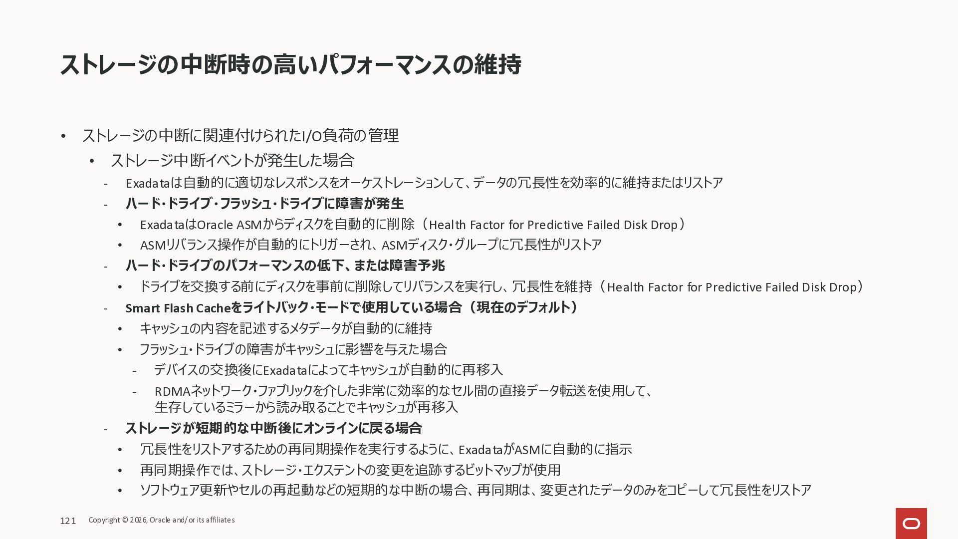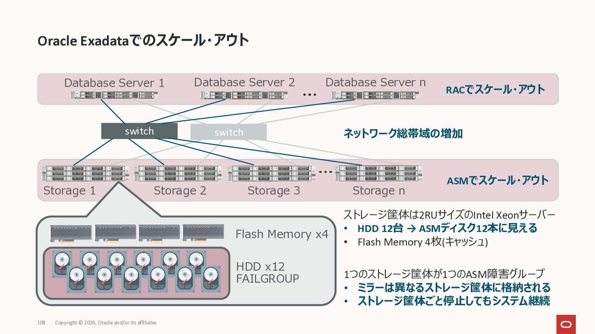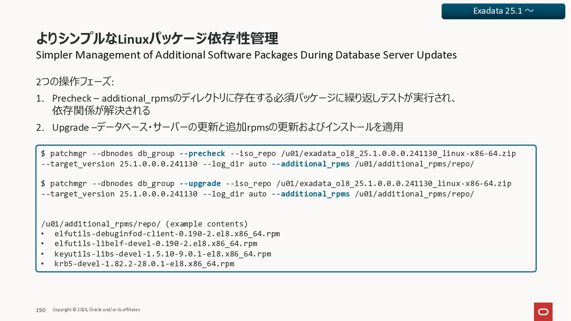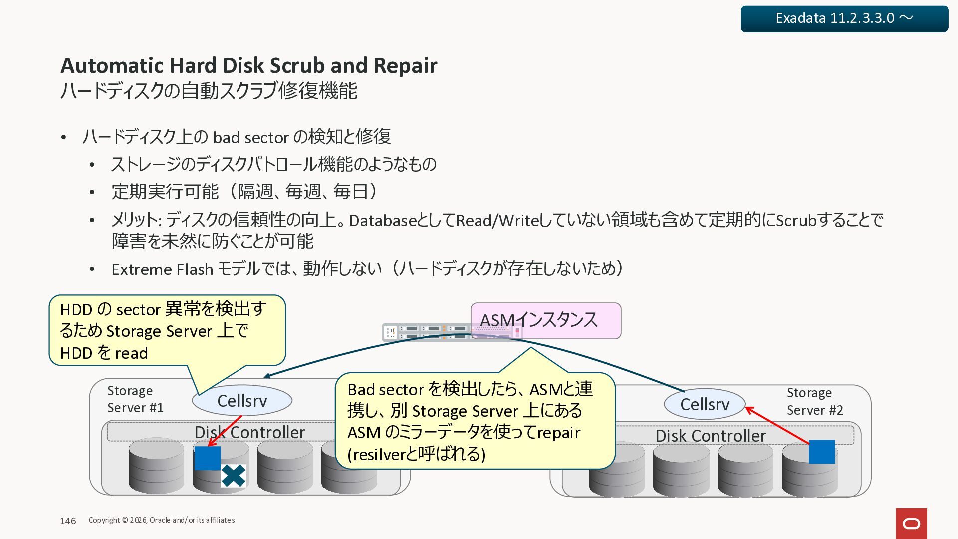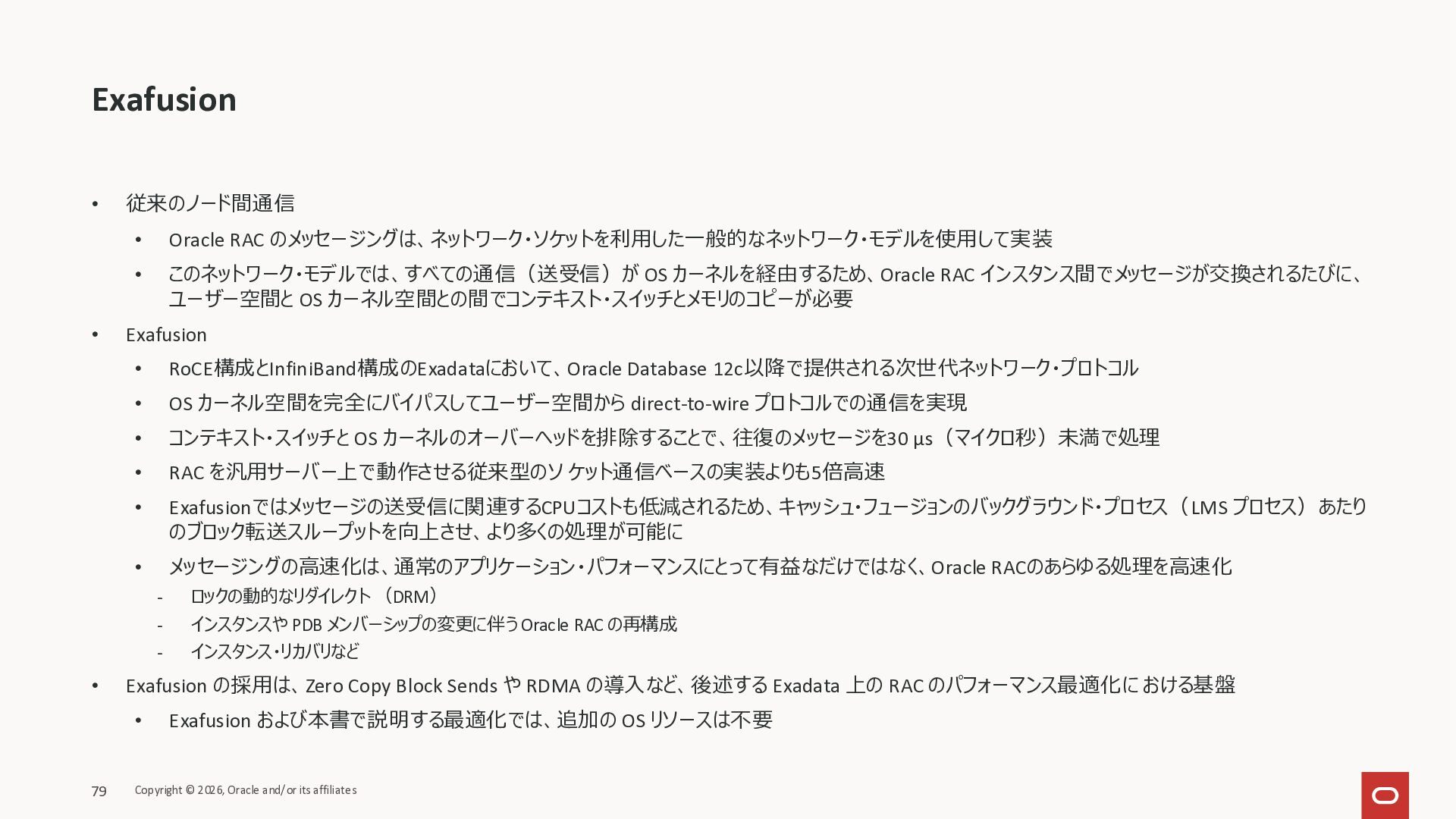 Exadata Exascaleストレージをネイティブにサ ポート • Direct I/OおよびRDMA操作を使用 165 Copyright © 2026, Oracle and/or its affiliates Exadata Storage Exadata Exascale Services と Exadata スマートストレージ機能 Storage Pools, Vault and Volume Management, redundancy and partnering, caching and tiering, file metadata management, snapshots and clones, data integrity, Smart Flash Cache, XRMEM Data Accelerator, Smart Scan, Storage Indexes, Columnar Caching, Bloom filters, 等 Oracle Grid Infrastructure Oracle AI Database 26ai Exadata Compute すべてのExadata Smart Storage機能 が利用可能
