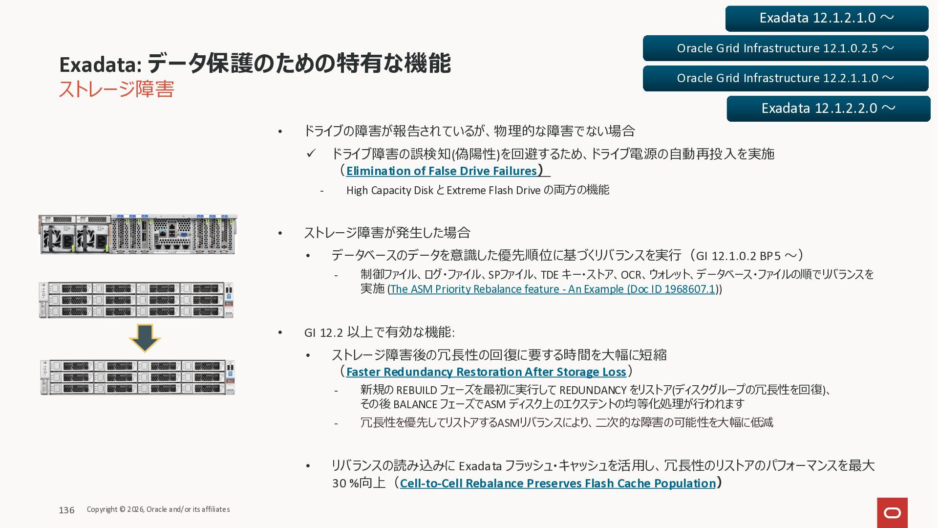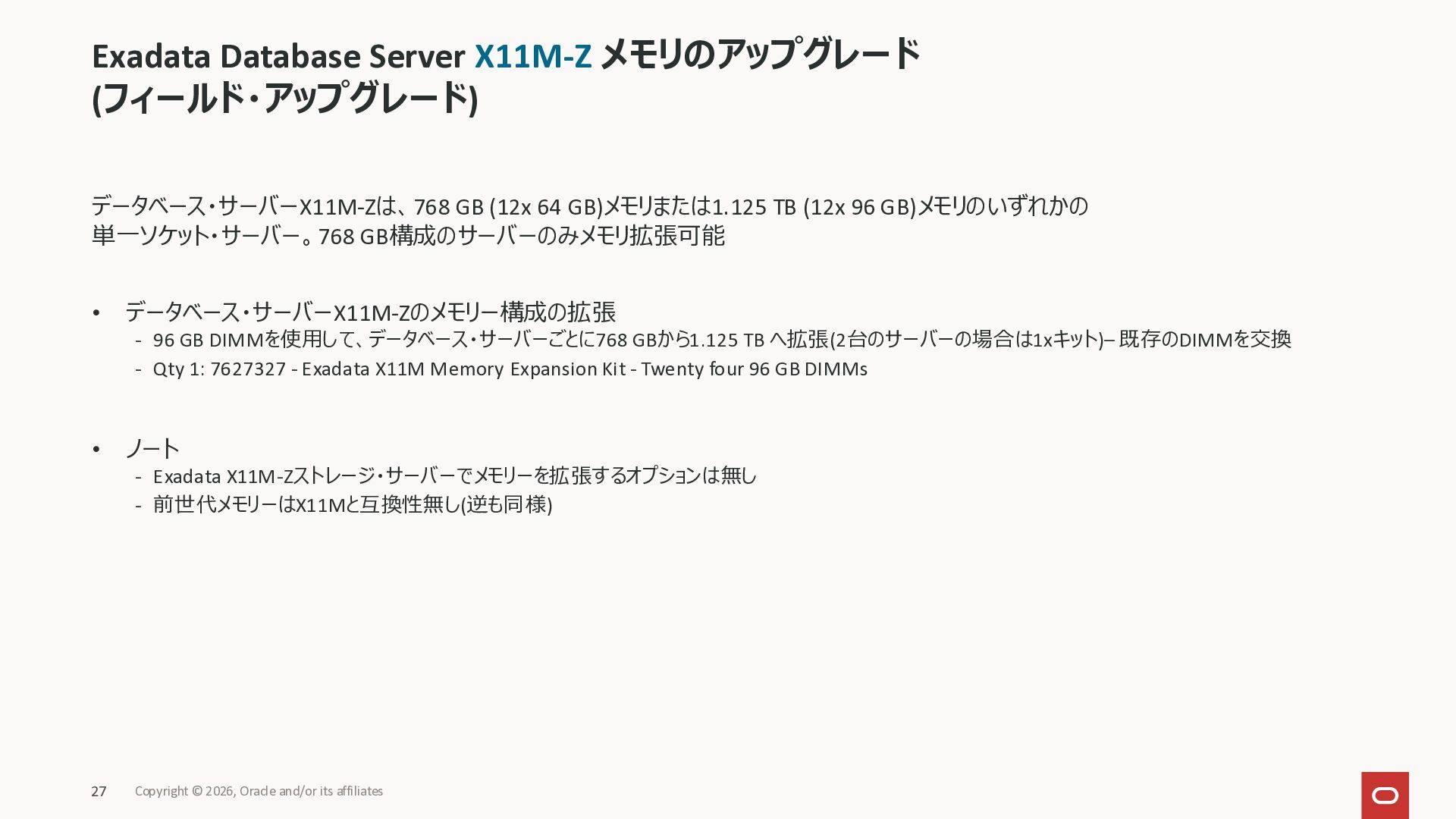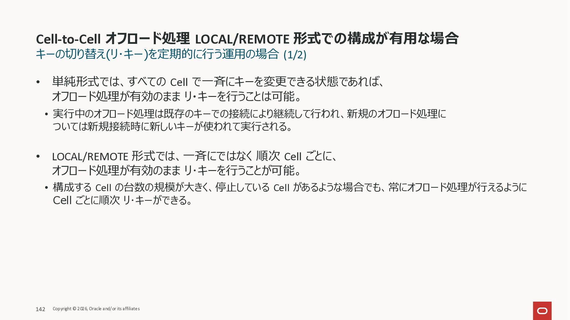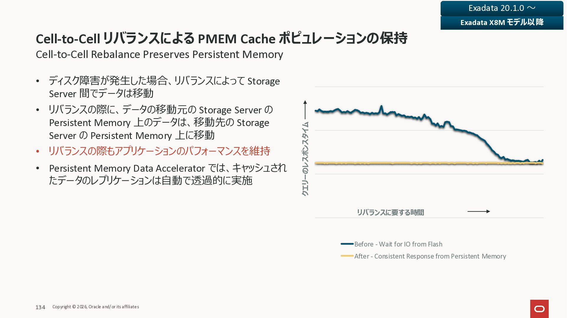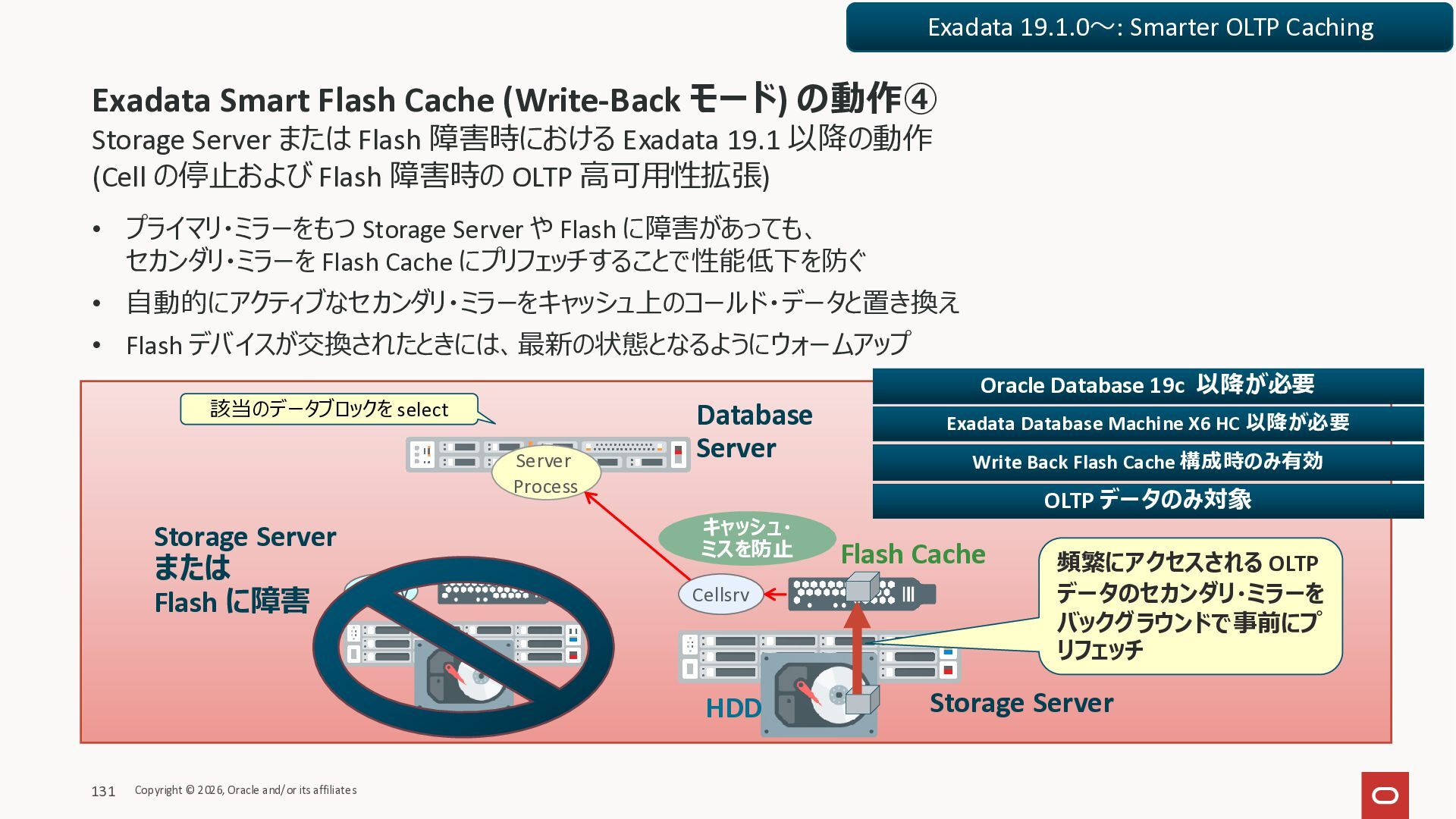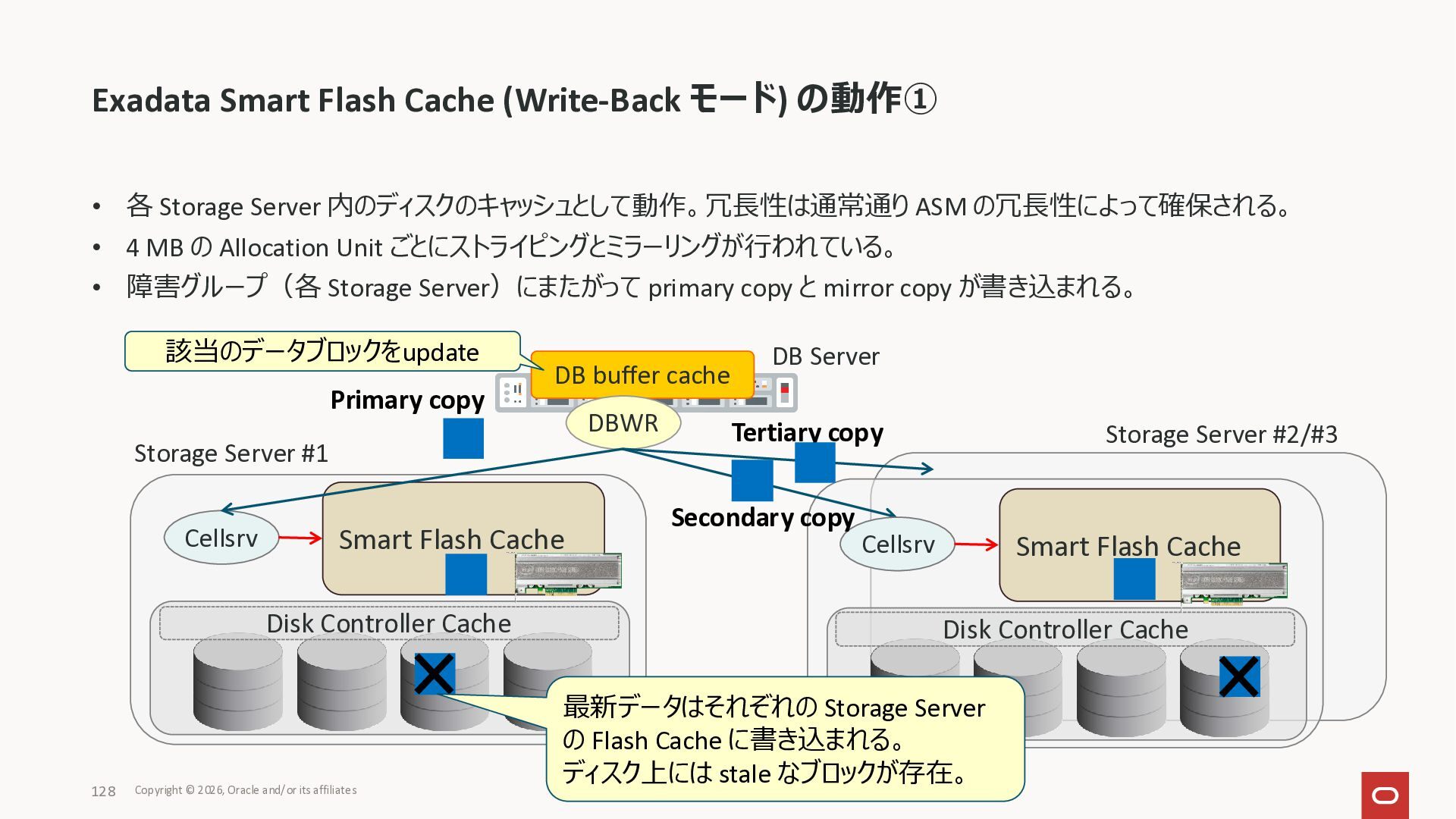 Exadata Exascaleストレージをネイティブにサ ポート • Direct I/OおよびRDMA操作を使用 165 Copyright © 2026, Oracle and/or its affiliates Exadata Storage Exadata Exascale Services と Exadata スマートストレージ機能 Storage Pools, Vault and Volume Management, redundancy and partnering, caching and tiering, file metadata management, snapshots and clones, data integrity, Smart Flash Cache, XRMEM Data Accelerator, Smart Scan, Storage Indexes, Columnar Caching, Bloom filters, 等 Oracle Grid Infrastructure Oracle AI Database 26ai Exadata Compute すべてのExadata Smart Storage機能 が利用可能
