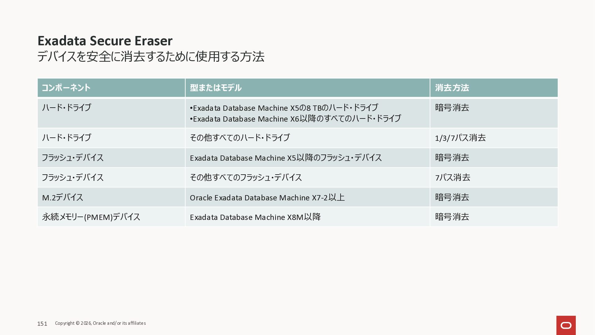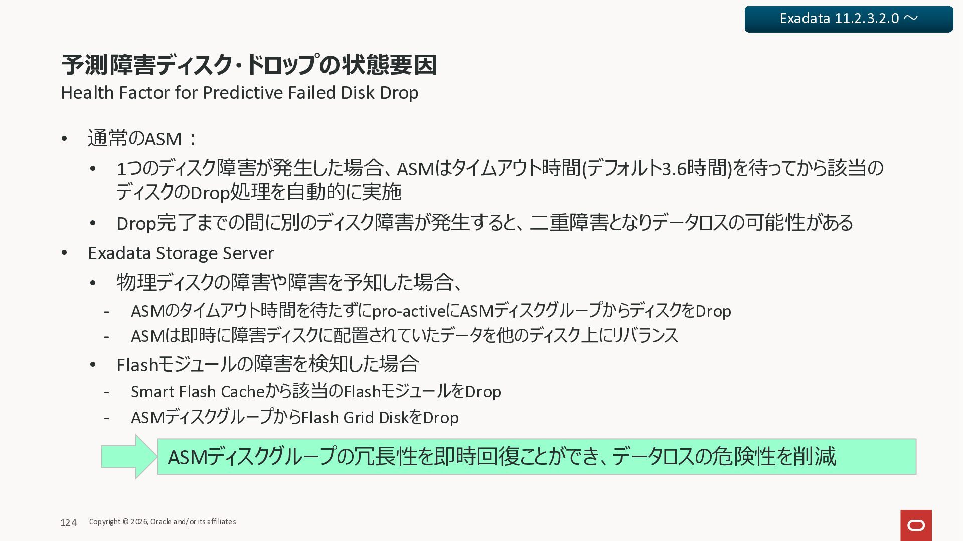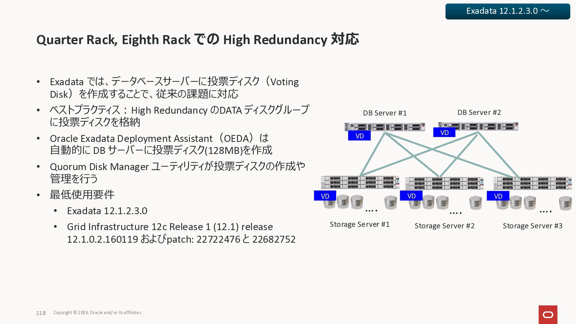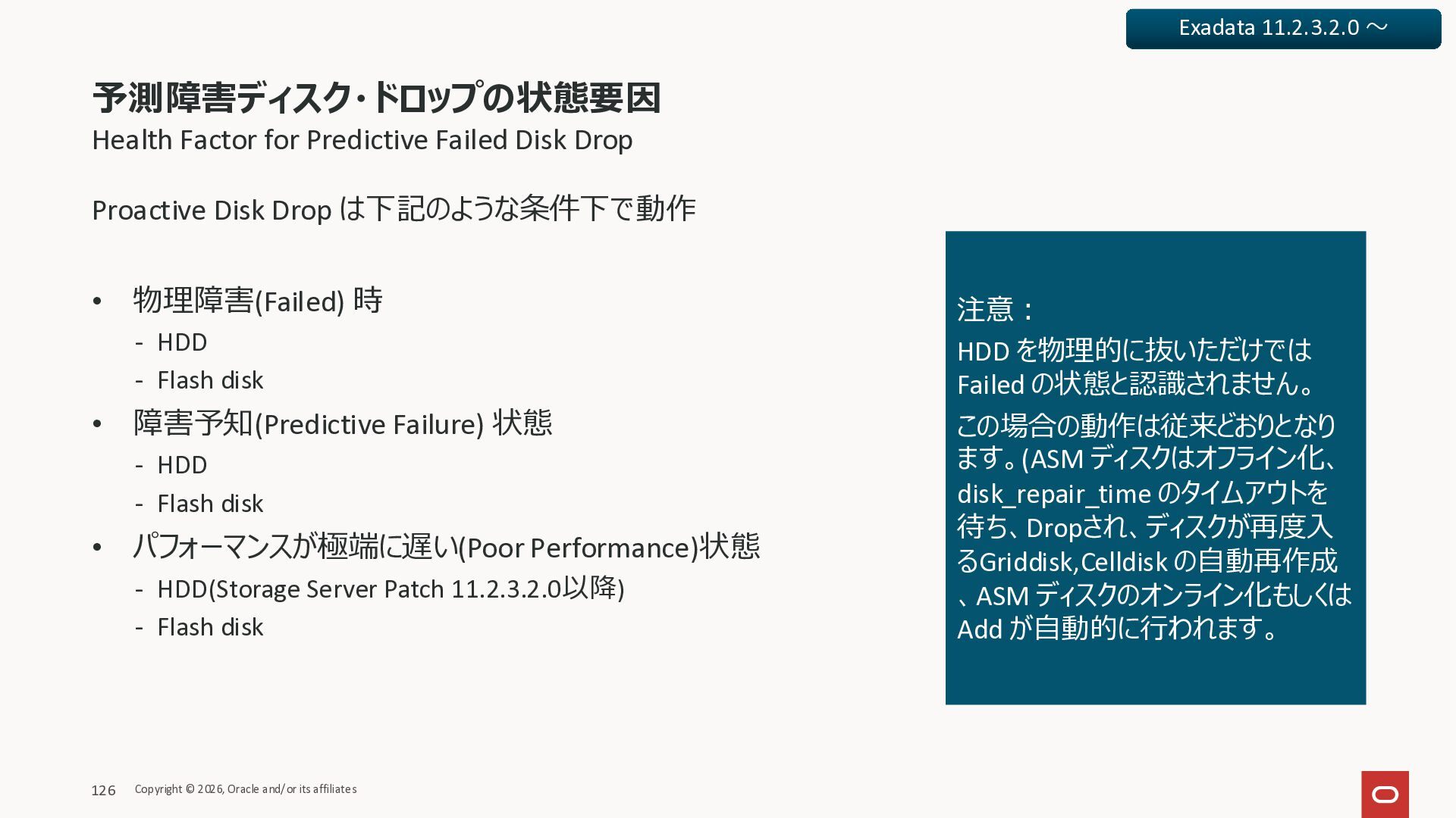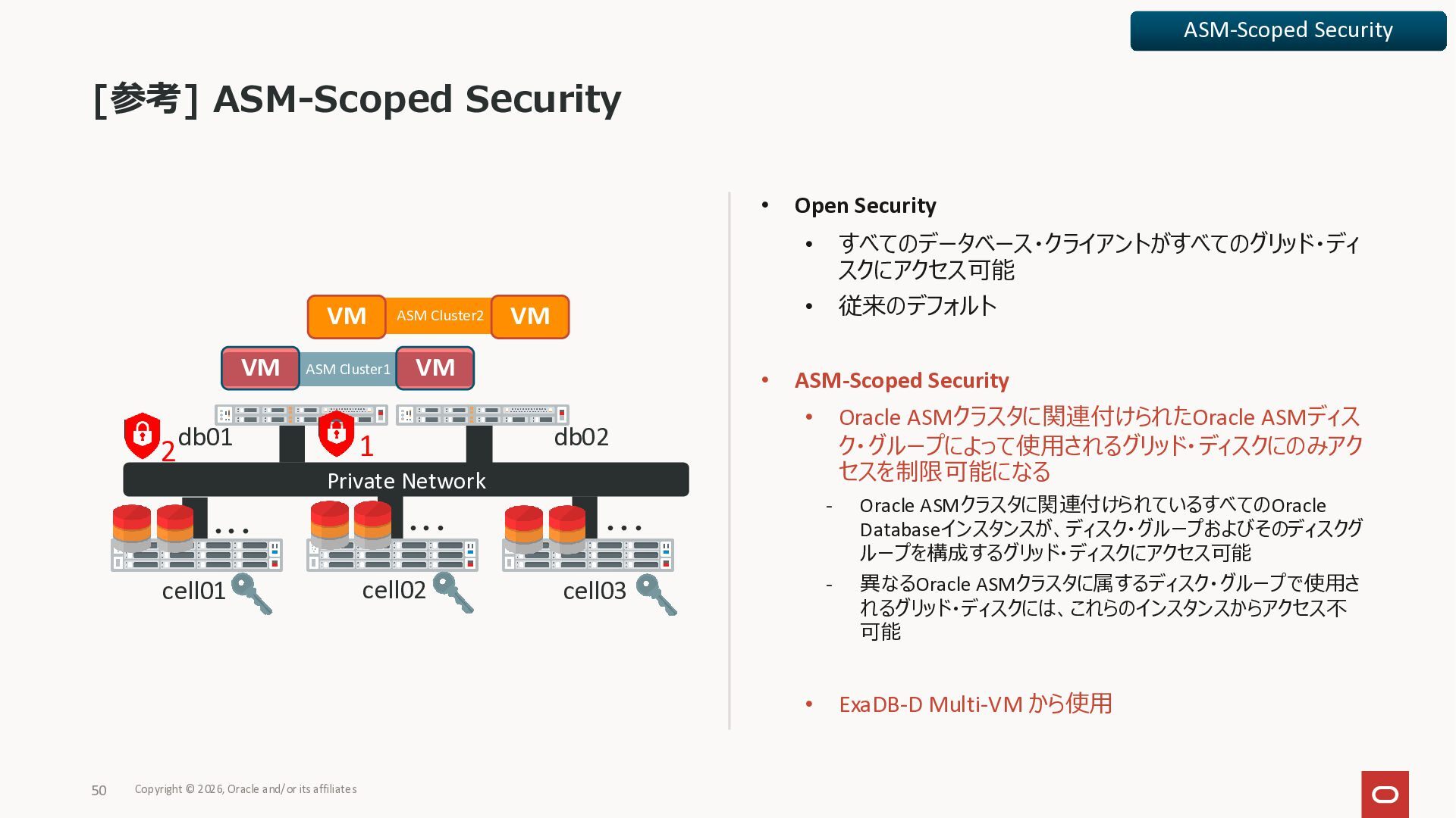 Exadata Exascaleストレージをネイティブにサ ポート • Direct I/OおよびRDMA操作を使用 165 Copyright © 2026, Oracle and/or its affiliates Exadata Storage Exadata Exascale Services と Exadata スマートストレージ機能 Storage Pools, Vault and Volume Management, redundancy and partnering, caching and tiering, file metadata management, snapshots and clones, data integrity, Smart Flash Cache, XRMEM Data Accelerator, Smart Scan, Storage Indexes, Columnar Caching, Bloom filters, 等 Oracle Grid Infrastructure Oracle AI Database 26ai Exadata Compute すべてのExadata Smart Storage機能 が利用可能
