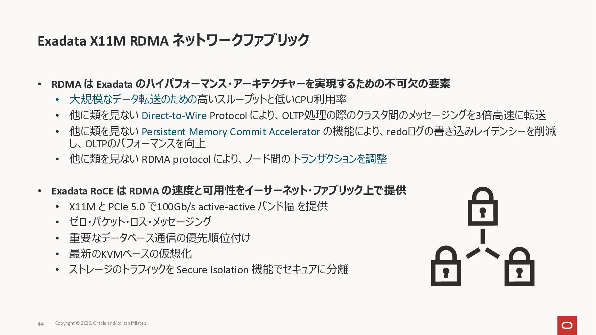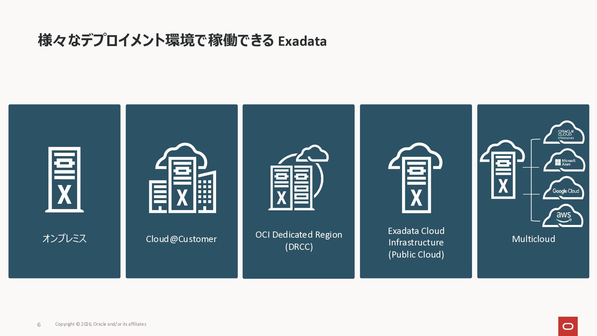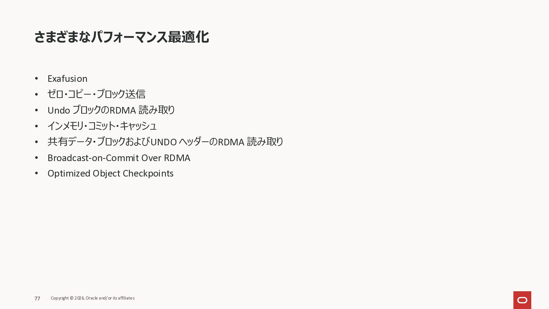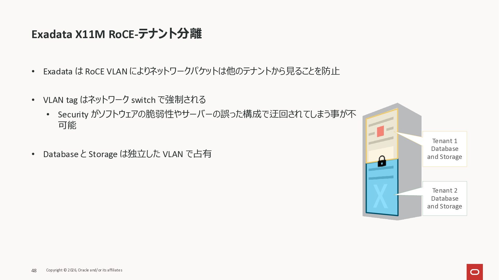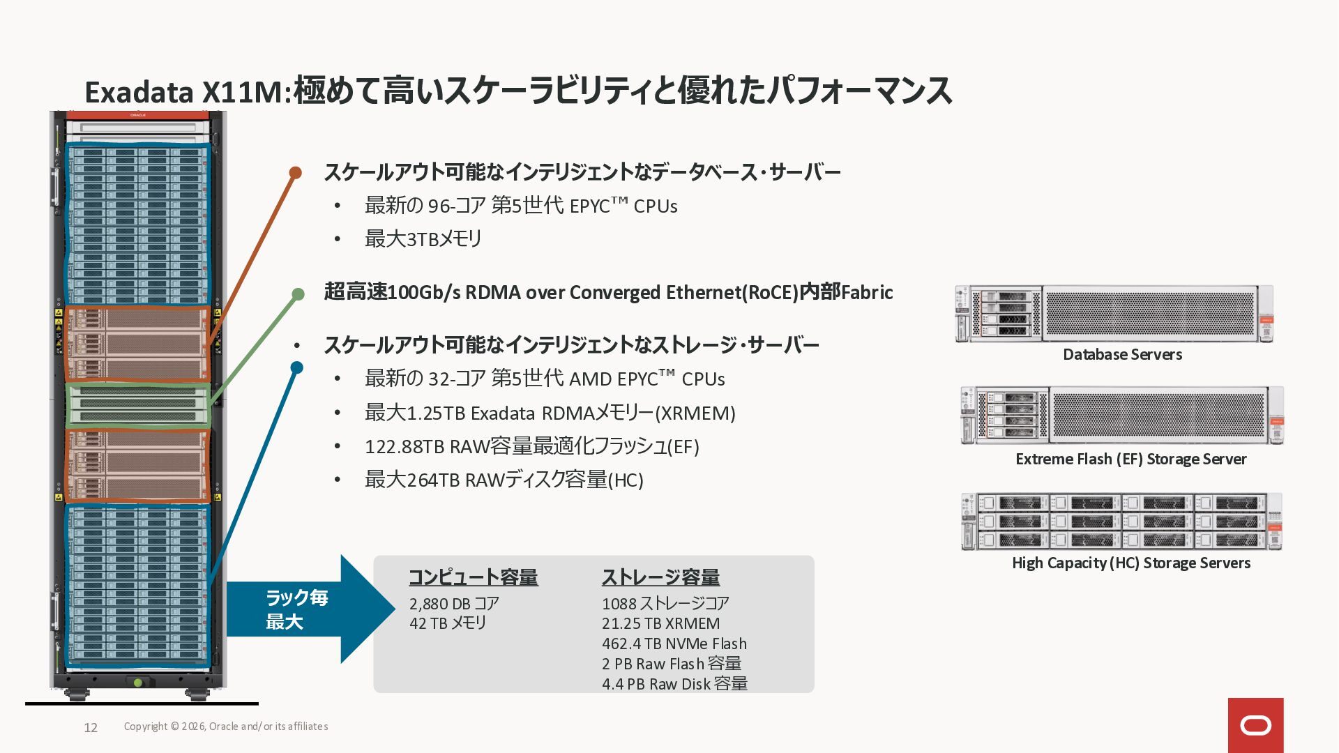 Exadata Exascaleストレージをネイティブにサ ポート • Direct I/OおよびRDMA操作を使用 165 Copyright © 2026, Oracle and/or its affiliates Exadata Storage Exadata Exascale Services と Exadata スマートストレージ機能 Storage Pools, Vault and Volume Management, redundancy and partnering, caching and tiering, file metadata management, snapshots and clones, data integrity, Smart Flash Cache, XRMEM Data Accelerator, Smart Scan, Storage Indexes, Columnar Caching, Bloom filters, 等 Oracle Grid Infrastructure Oracle AI Database 26ai Exadata Compute すべてのExadata Smart Storage機能 が利用可能