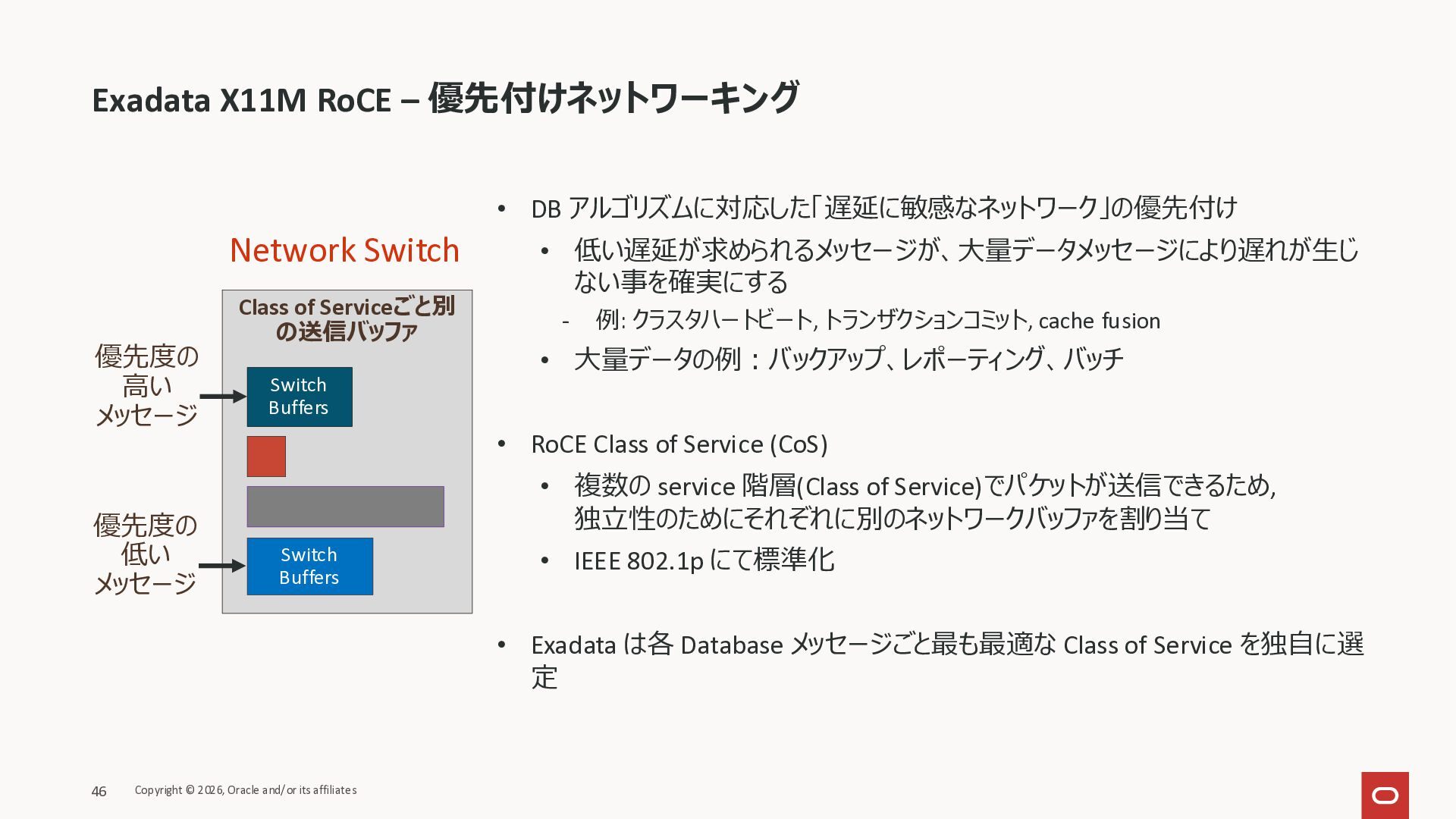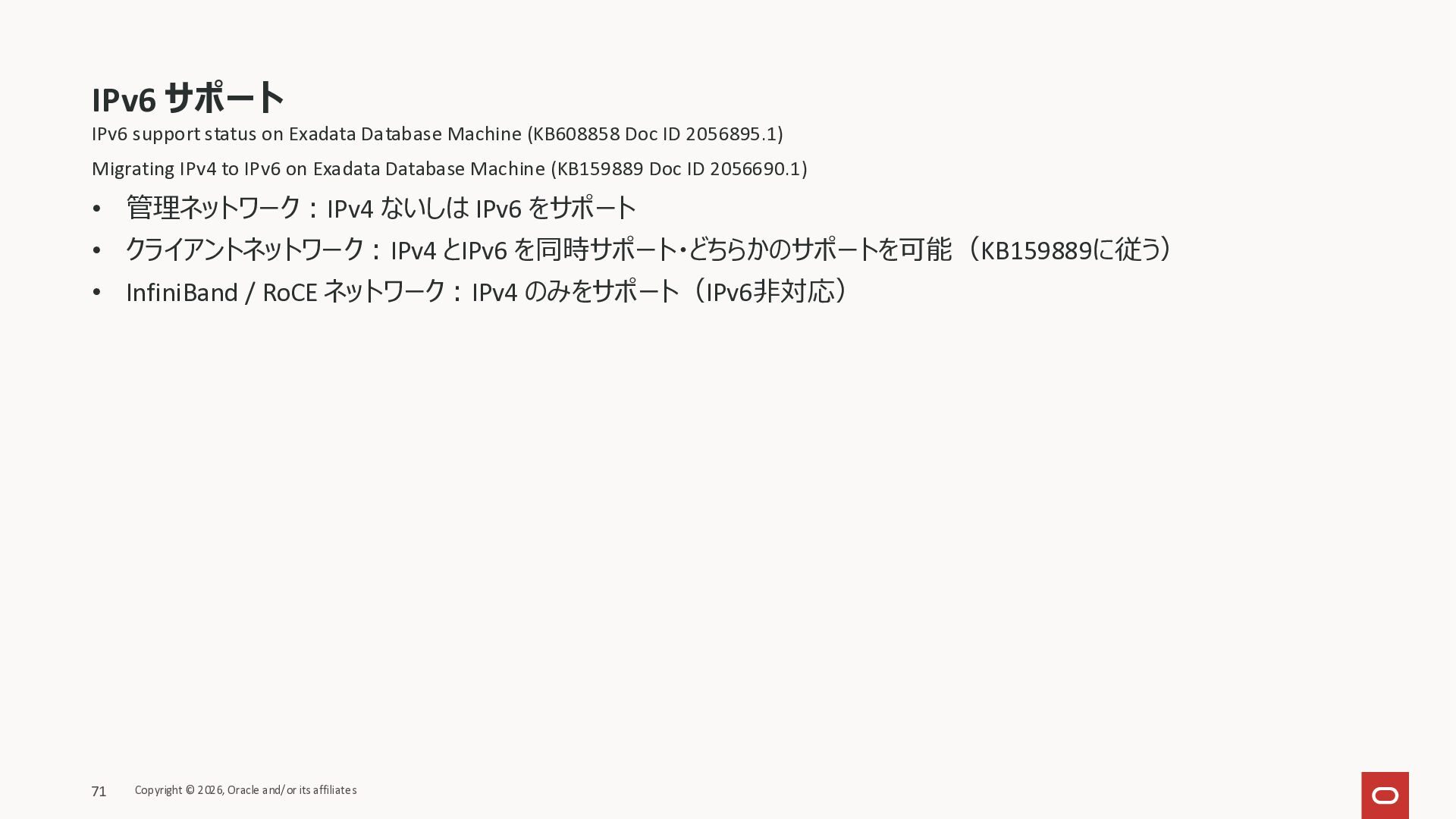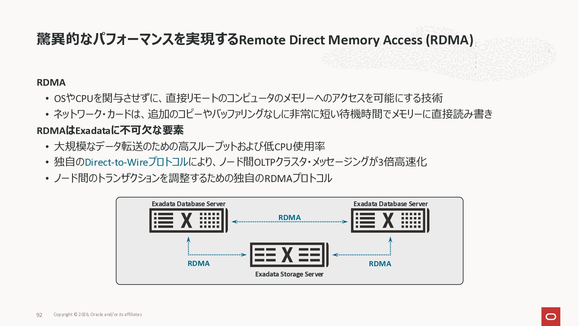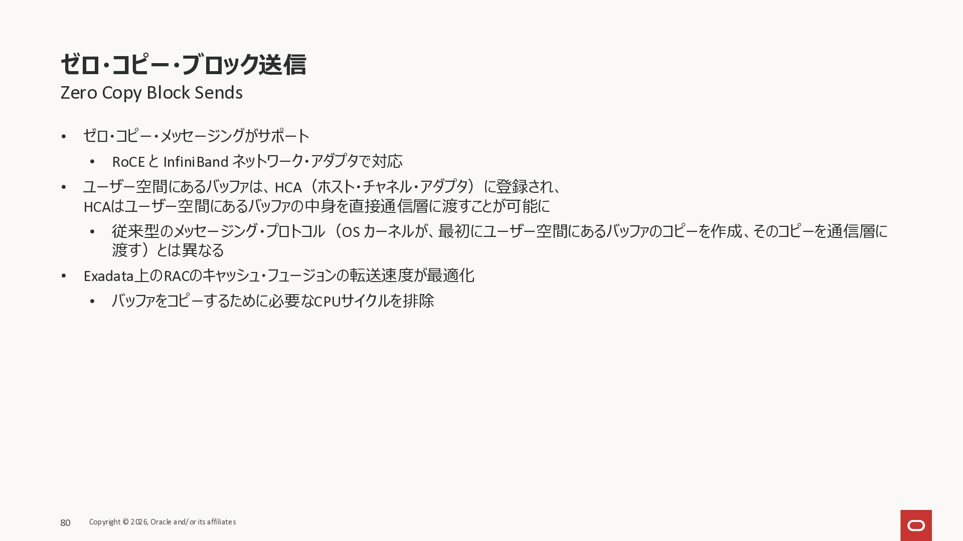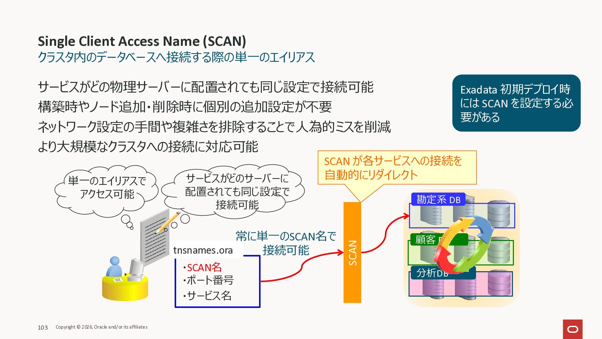 Exadata Exascaleストレージをネイティブにサ ポート • Direct I/OおよびRDMA操作を使用 165 Copyright © 2026, Oracle and/or its affiliates Exadata Storage Exadata Exascale Services と Exadata スマートストレージ機能 Storage Pools, Vault and Volume Management, redundancy and partnering, caching and tiering, file metadata management, snapshots and clones, data integrity, Smart Flash Cache, XRMEM Data Accelerator, Smart Scan, Storage Indexes, Columnar Caching, Bloom filters, 等 Oracle Grid Infrastructure Oracle AI Database 26ai Exadata Compute すべてのExadata Smart Storage機能 が利用可能