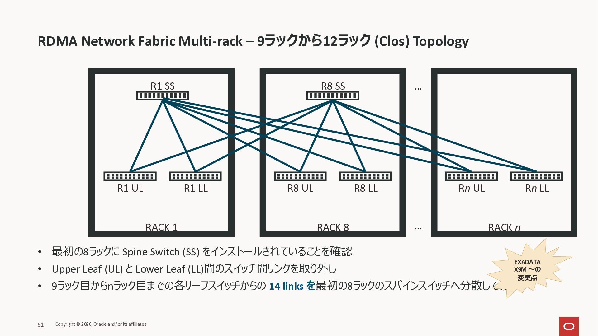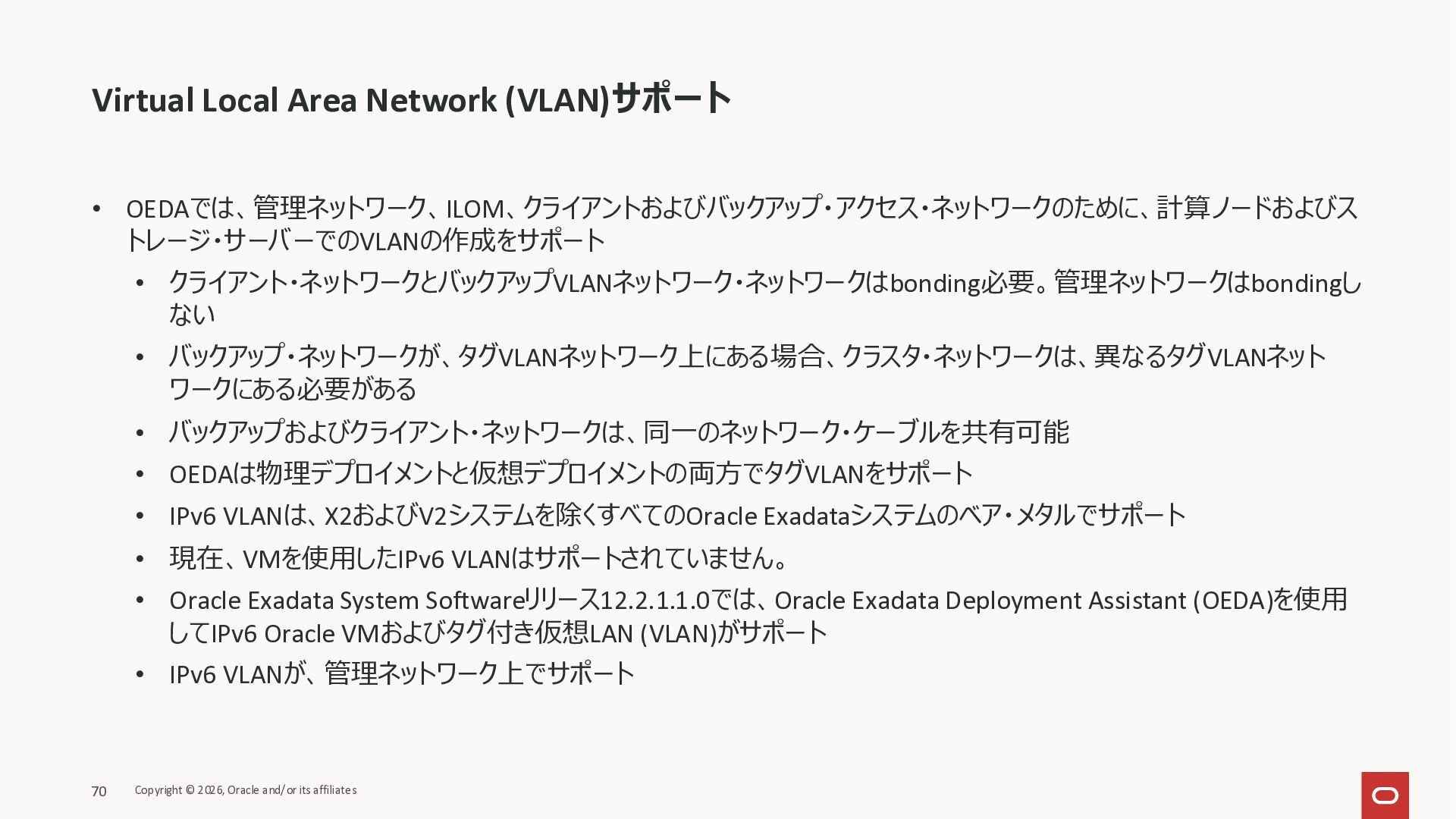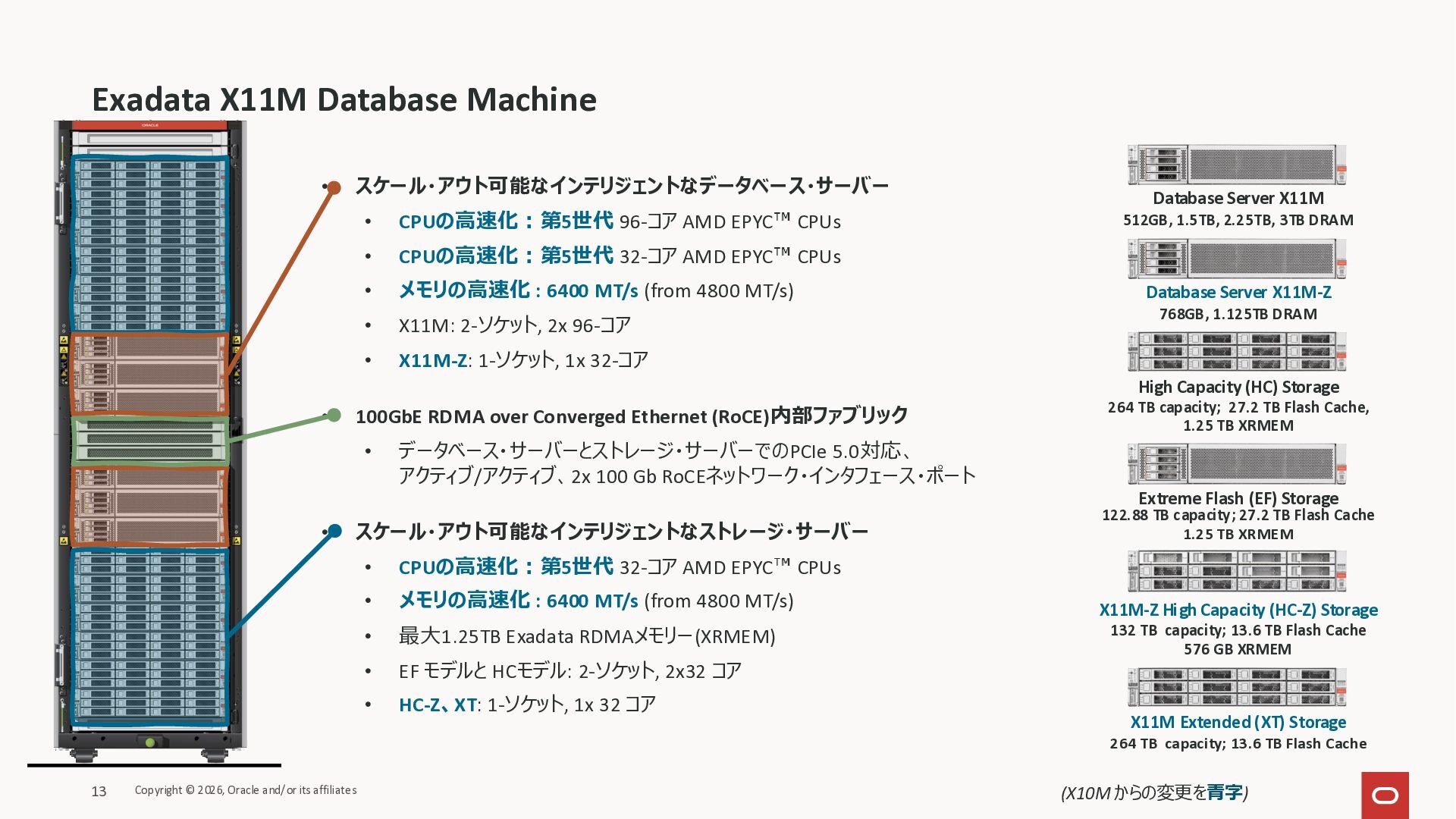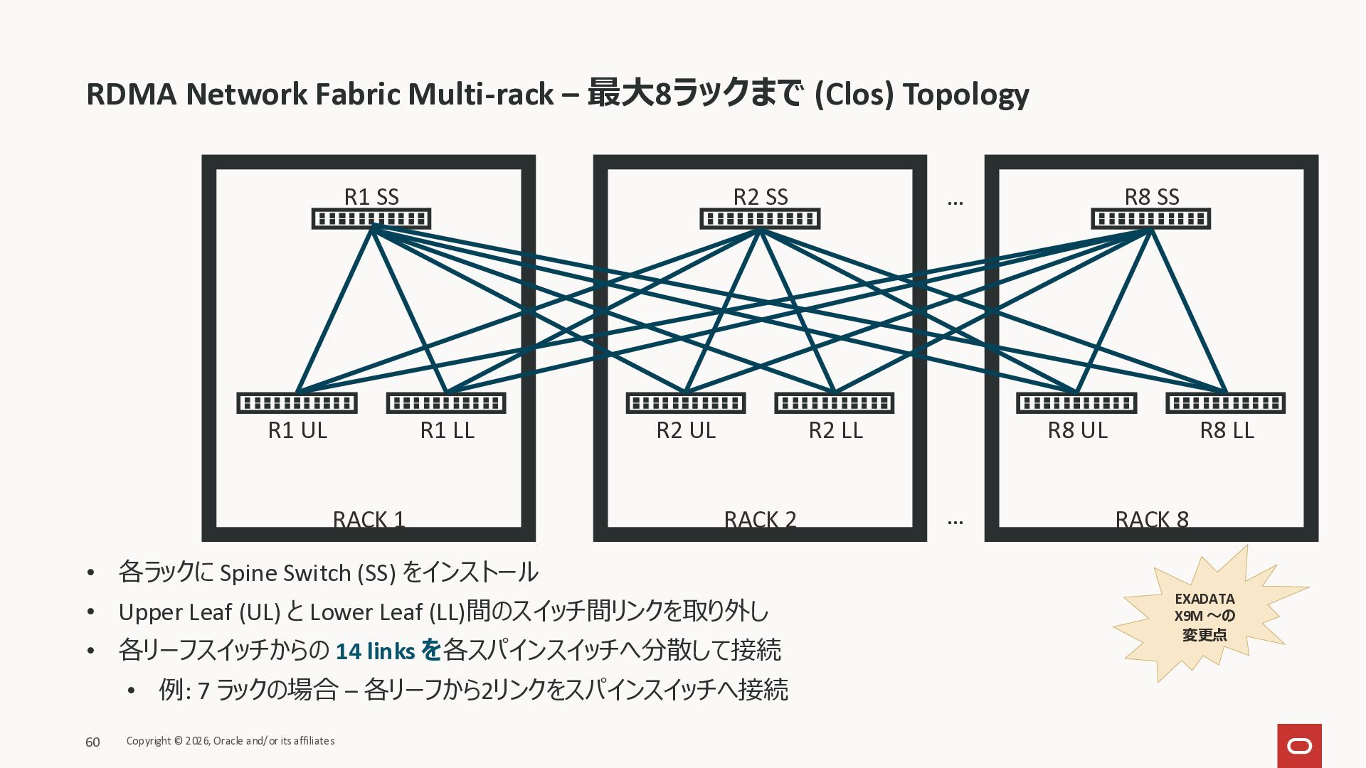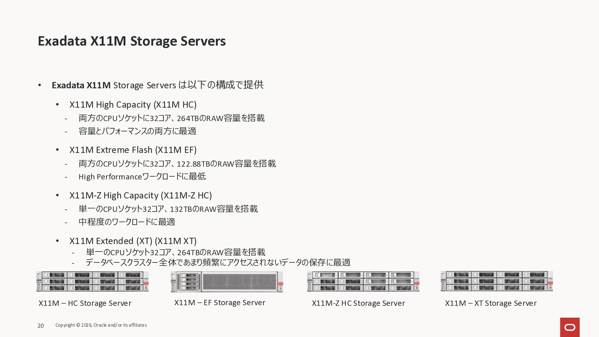 Exadata Exascaleストレージをネイティブにサ ポート • Direct I/OおよびRDMA操作を使用 165 Copyright © 2026, Oracle and/or its affiliates Exadata Storage Exadata Exascale Services と Exadata スマートストレージ機能 Storage Pools, Vault and Volume Management, redundancy and partnering, caching and tiering, file metadata management, snapshots and clones, data integrity, Smart Flash Cache, XRMEM Data Accelerator, Smart Scan, Storage Indexes, Columnar Caching, Bloom filters, 等 Oracle Grid Infrastructure Oracle AI Database 26ai Exadata Compute すべてのExadata Smart Storage機能 が利用可能