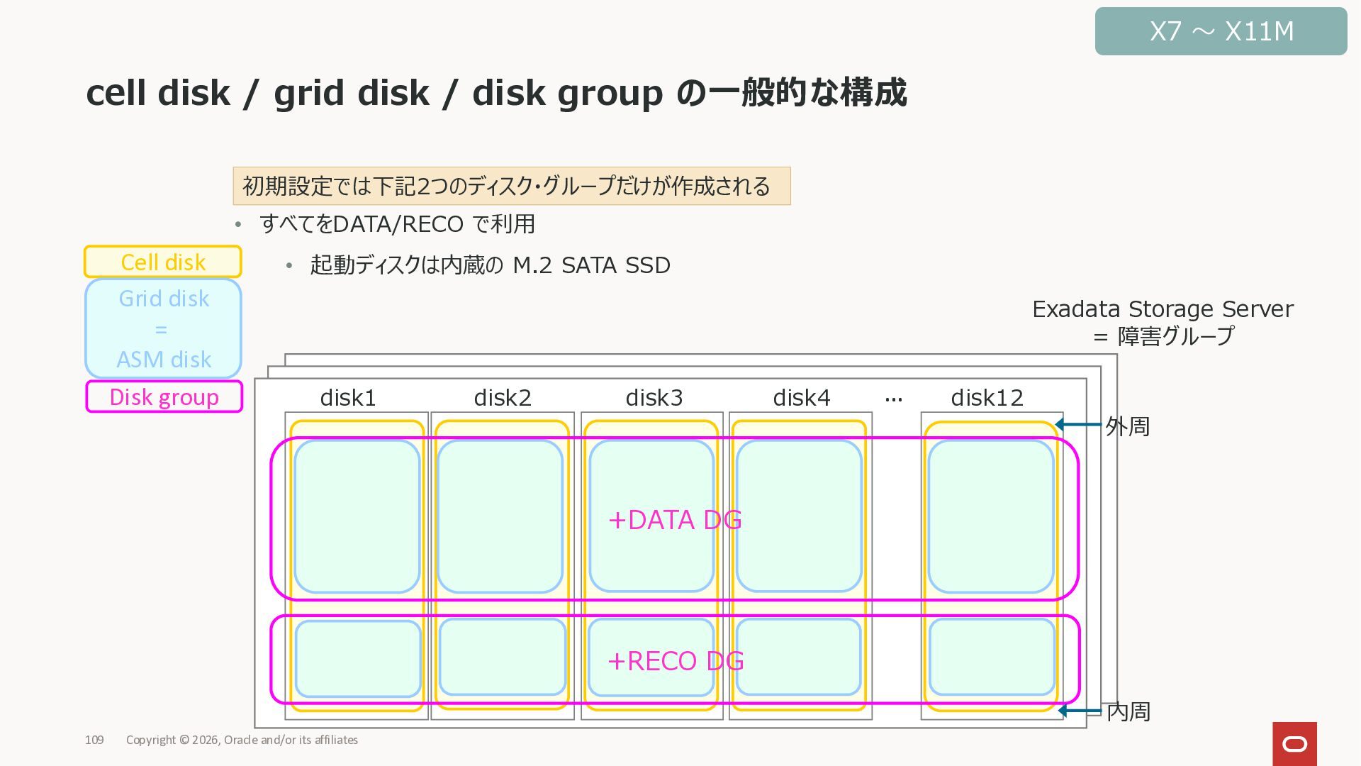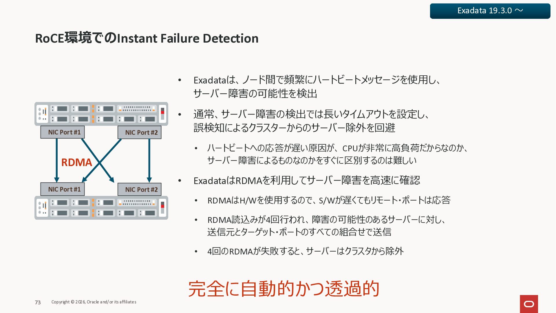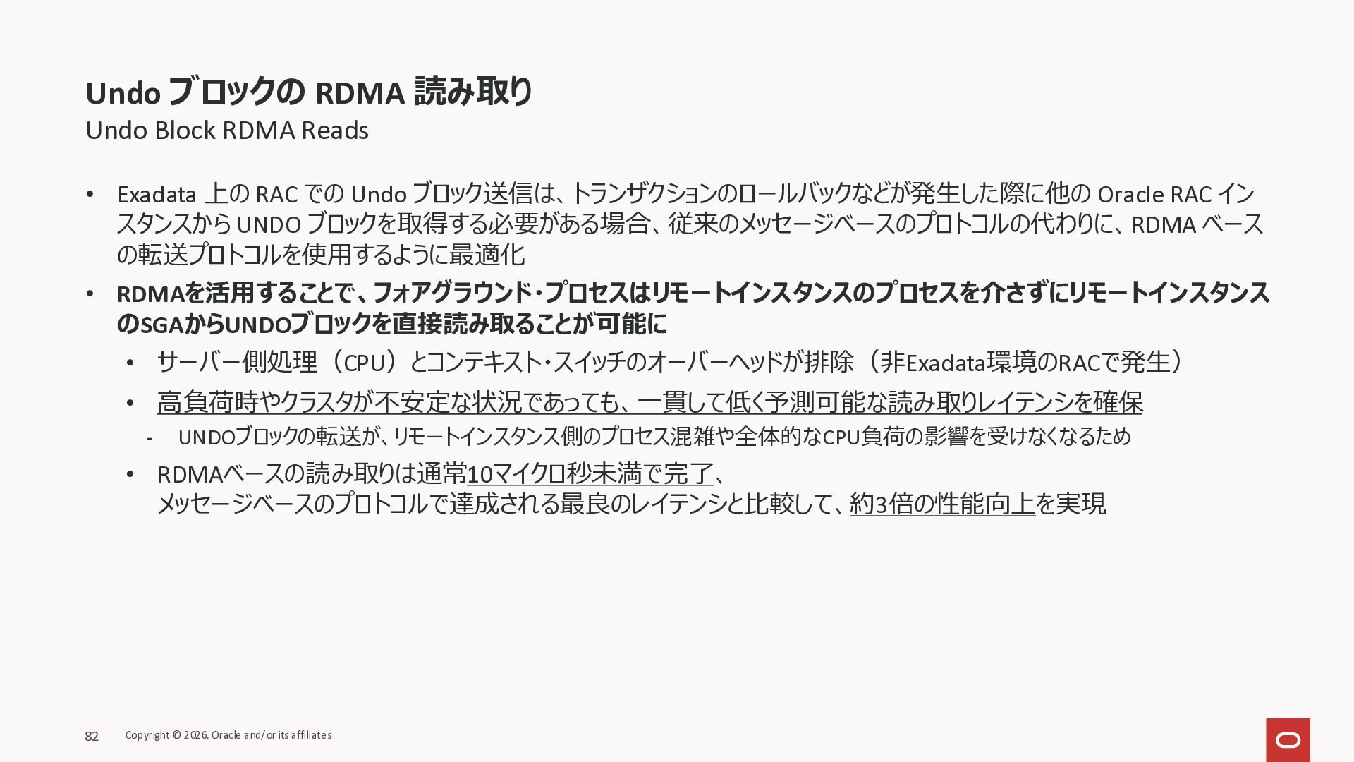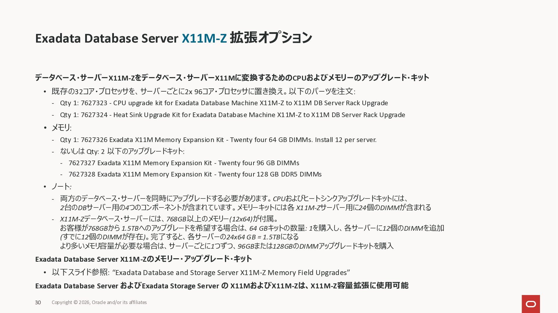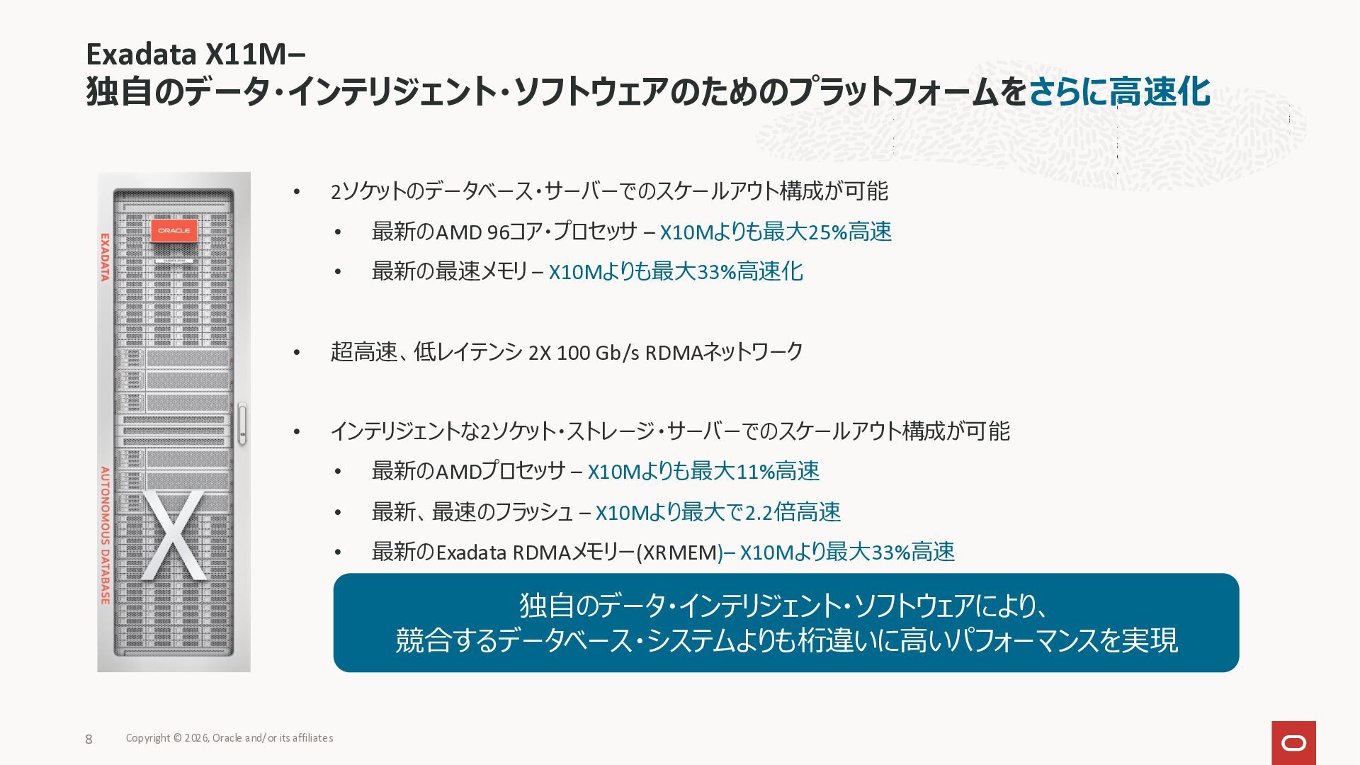 Exadata Exascaleストレージをネイティブにサ ポート • Direct I/OおよびRDMA操作を使用 165 Copyright © 2026, Oracle and/or its affiliates Exadata Storage Exadata Exascale Services と Exadata スマートストレージ機能 Storage Pools, Vault and Volume Management, redundancy and partnering, caching and tiering, file metadata management, snapshots and clones, data integrity, Smart Flash Cache, XRMEM Data Accelerator, Smart Scan, Storage Indexes, Columnar Caching, Bloom filters, 等 Oracle Grid Infrastructure Oracle AI Database 26ai Exadata Compute すべてのExadata Smart Storage機能 が利用可能