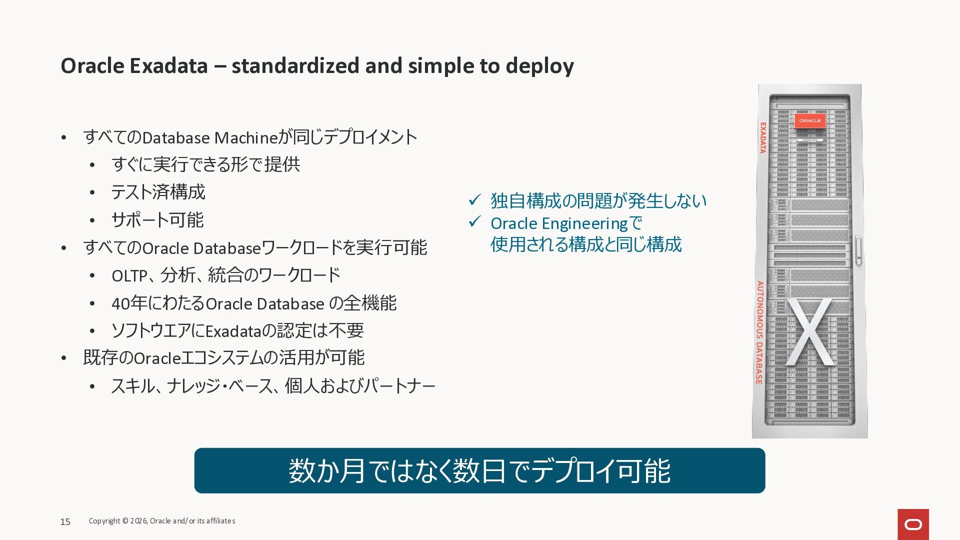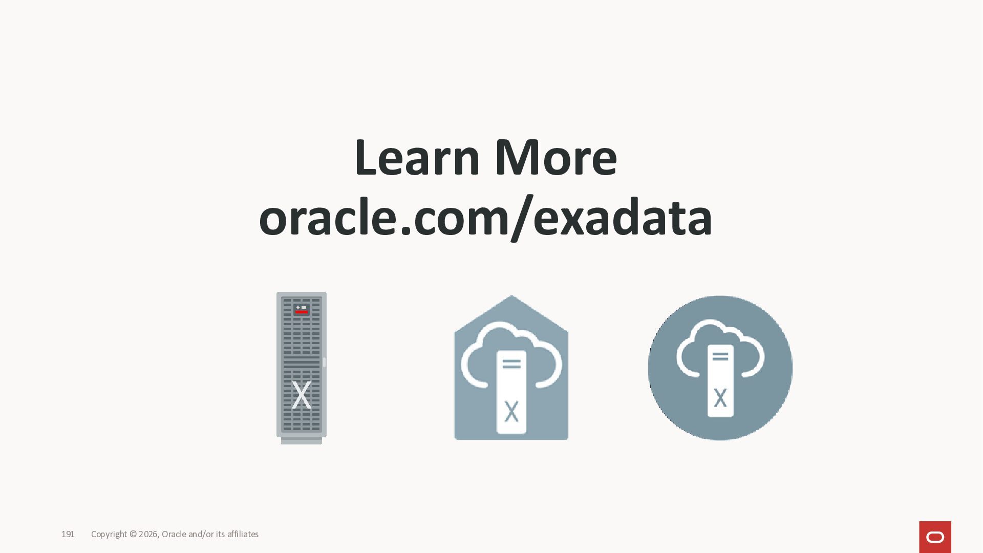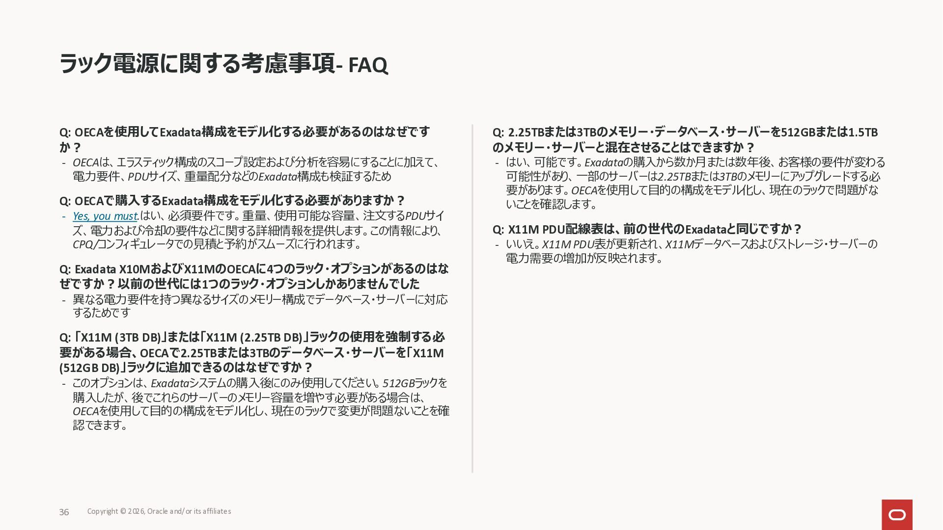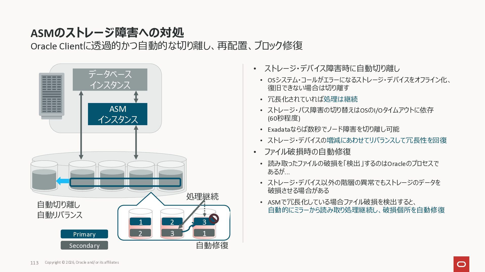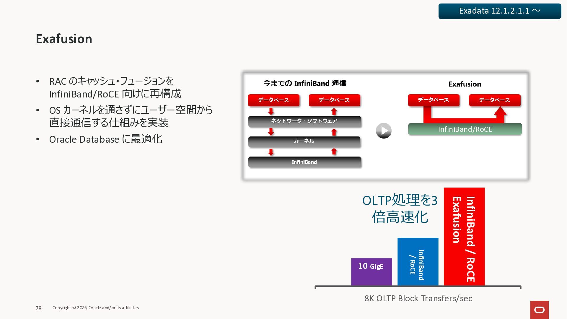 Exadata Exascaleストレージをネイティブにサ ポート • Direct I/OおよびRDMA操作を使用 165 Copyright © 2026, Oracle and/or its affiliates Exadata Storage Exadata Exascale Services と Exadata スマートストレージ機能 Storage Pools, Vault and Volume Management, redundancy and partnering, caching and tiering, file metadata management, snapshots and clones, data integrity, Smart Flash Cache, XRMEM Data Accelerator, Smart Scan, Storage Indexes, Columnar Caching, Bloom filters, 等 Oracle Grid Infrastructure Oracle AI Database 26ai Exadata Compute すべてのExadata Smart Storage機能 が利用可能