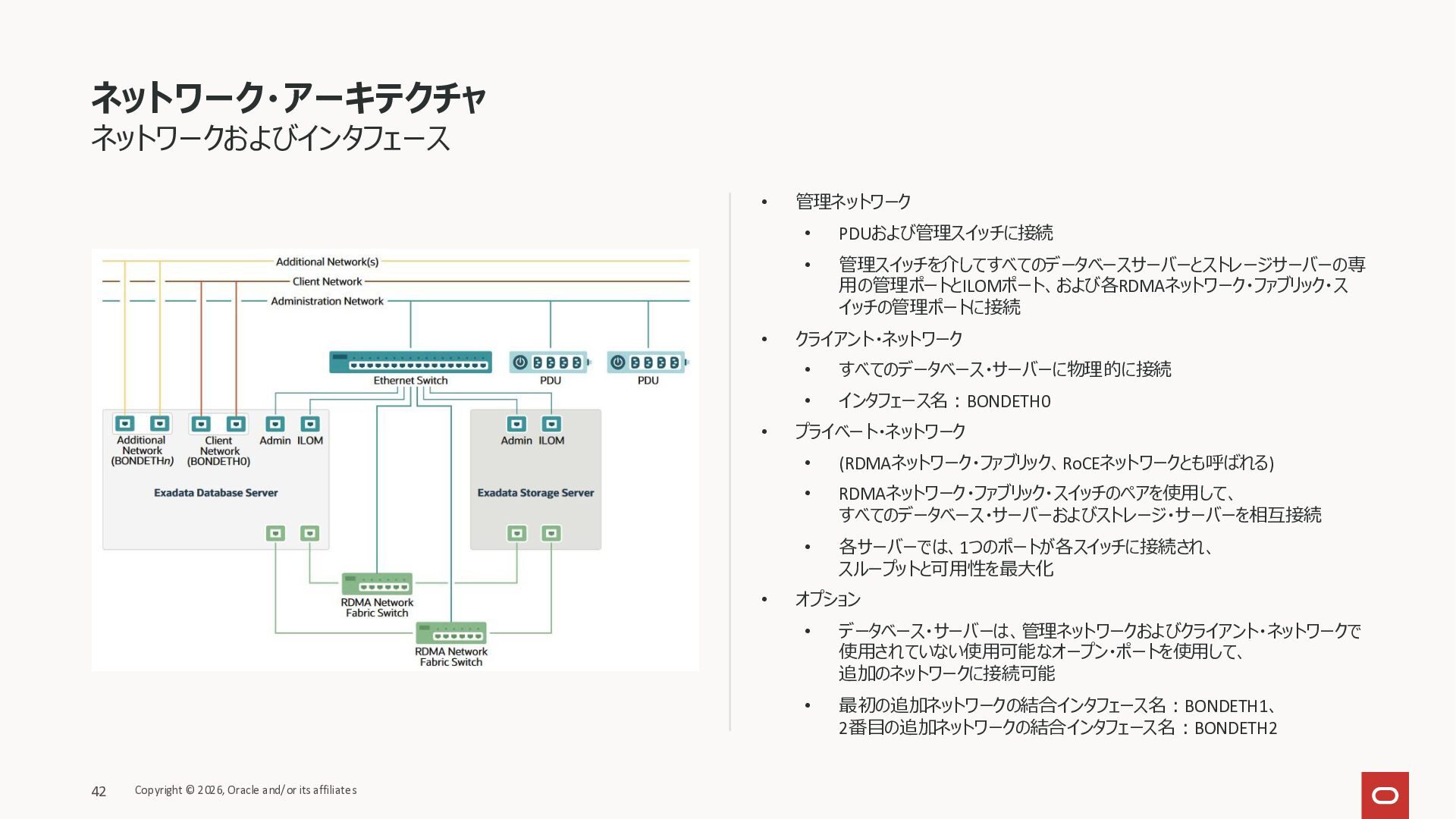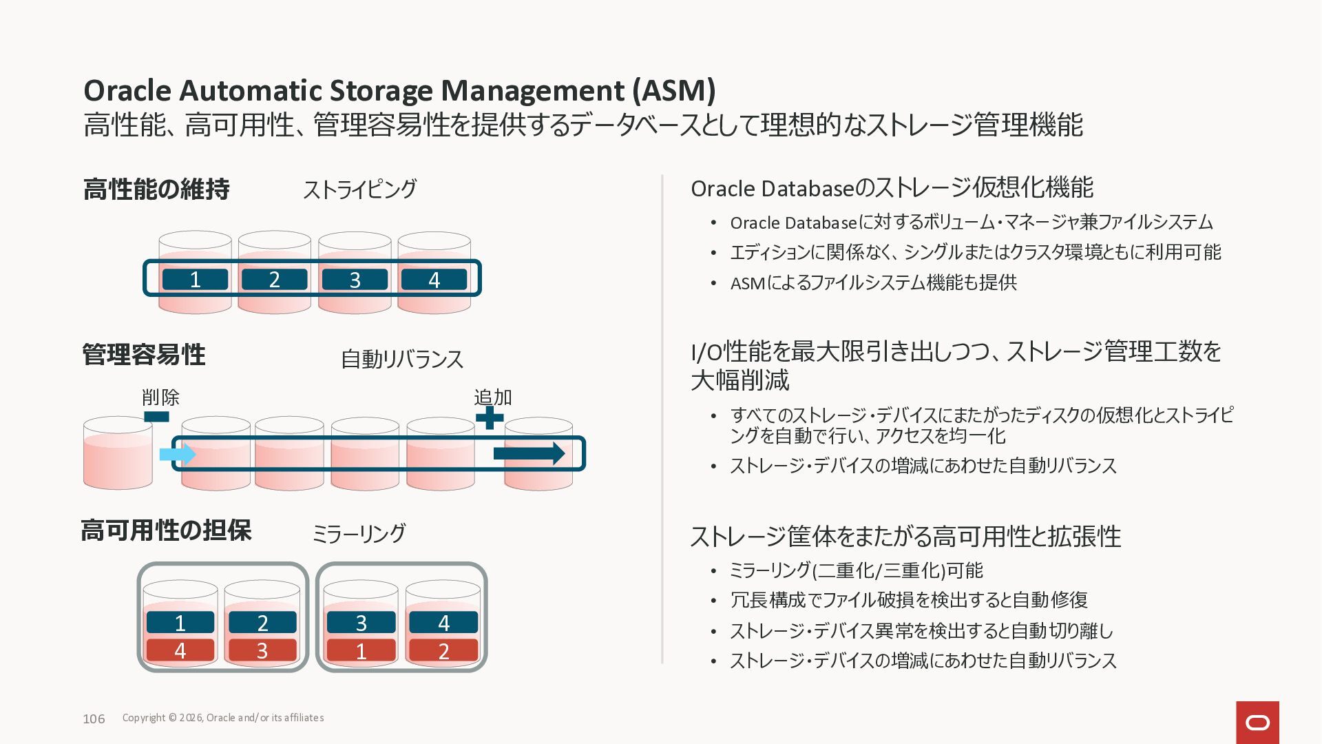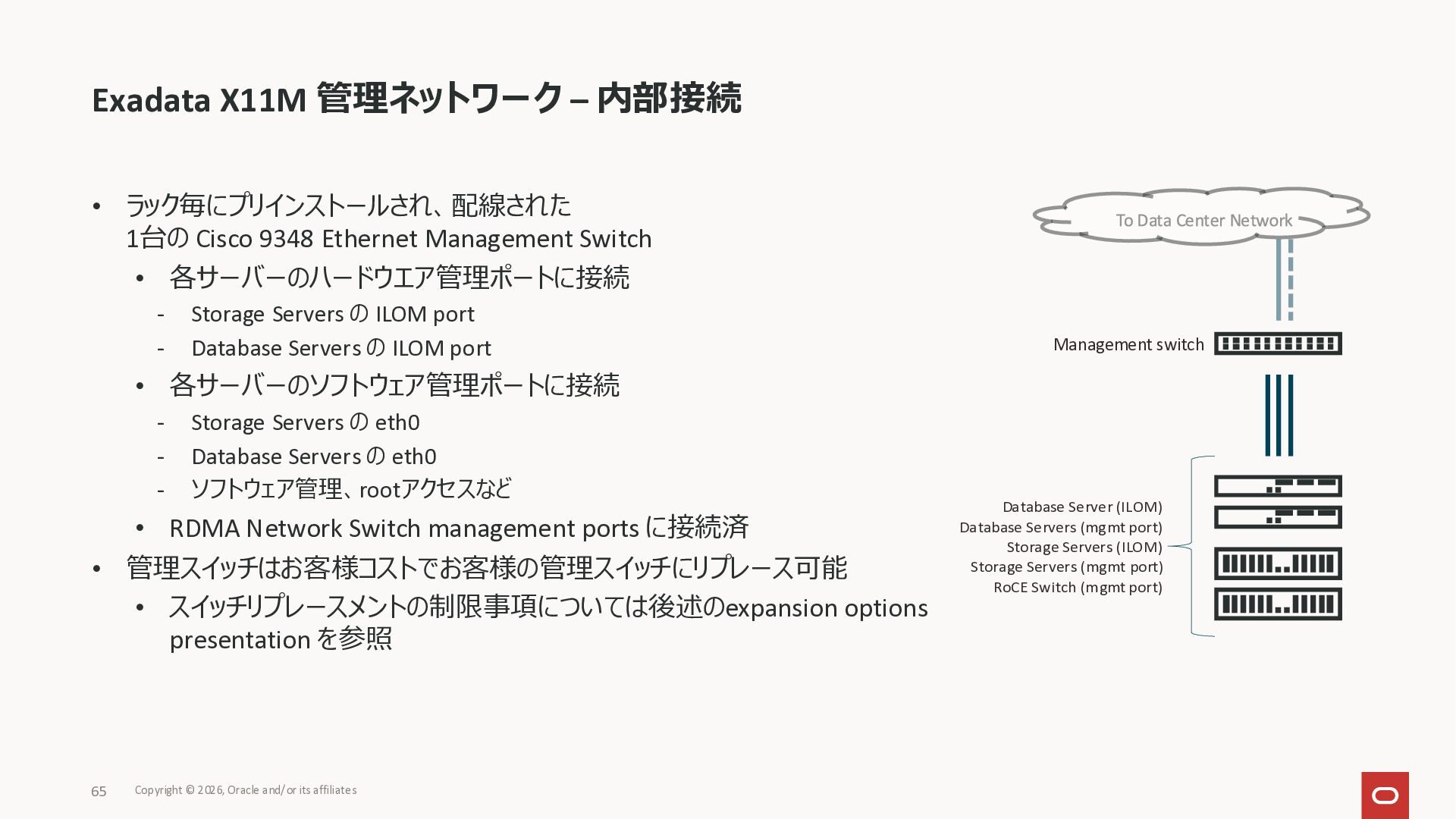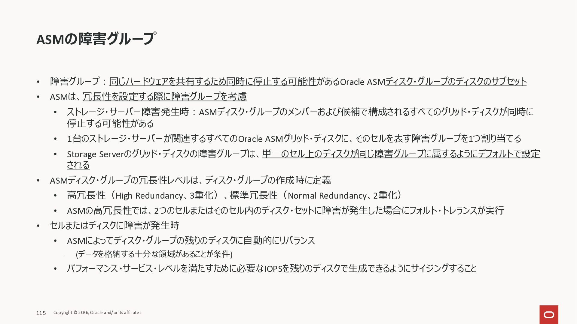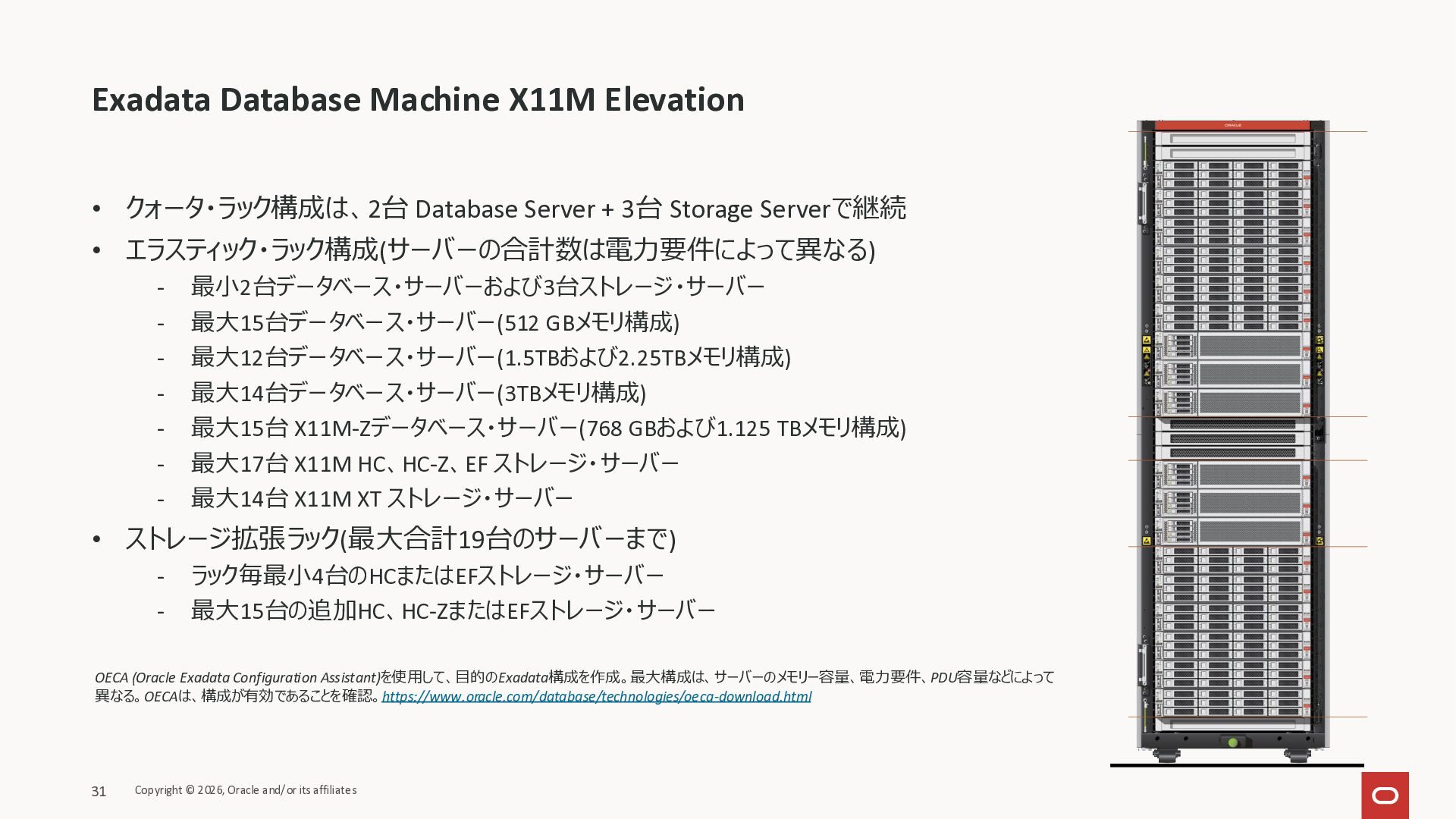 Exadata Exascaleストレージをネイティブにサ ポート • Direct I/OおよびRDMA操作を使用 165 Copyright © 2026, Oracle and/or its affiliates Exadata Storage Exadata Exascale Services と Exadata スマートストレージ機能 Storage Pools, Vault and Volume Management, redundancy and partnering, caching and tiering, file metadata management, snapshots and clones, data integrity, Smart Flash Cache, XRMEM Data Accelerator, Smart Scan, Storage Indexes, Columnar Caching, Bloom filters, 等 Oracle Grid Infrastructure Oracle AI Database 26ai Exadata Compute すべてのExadata Smart Storage機能 が利用可能