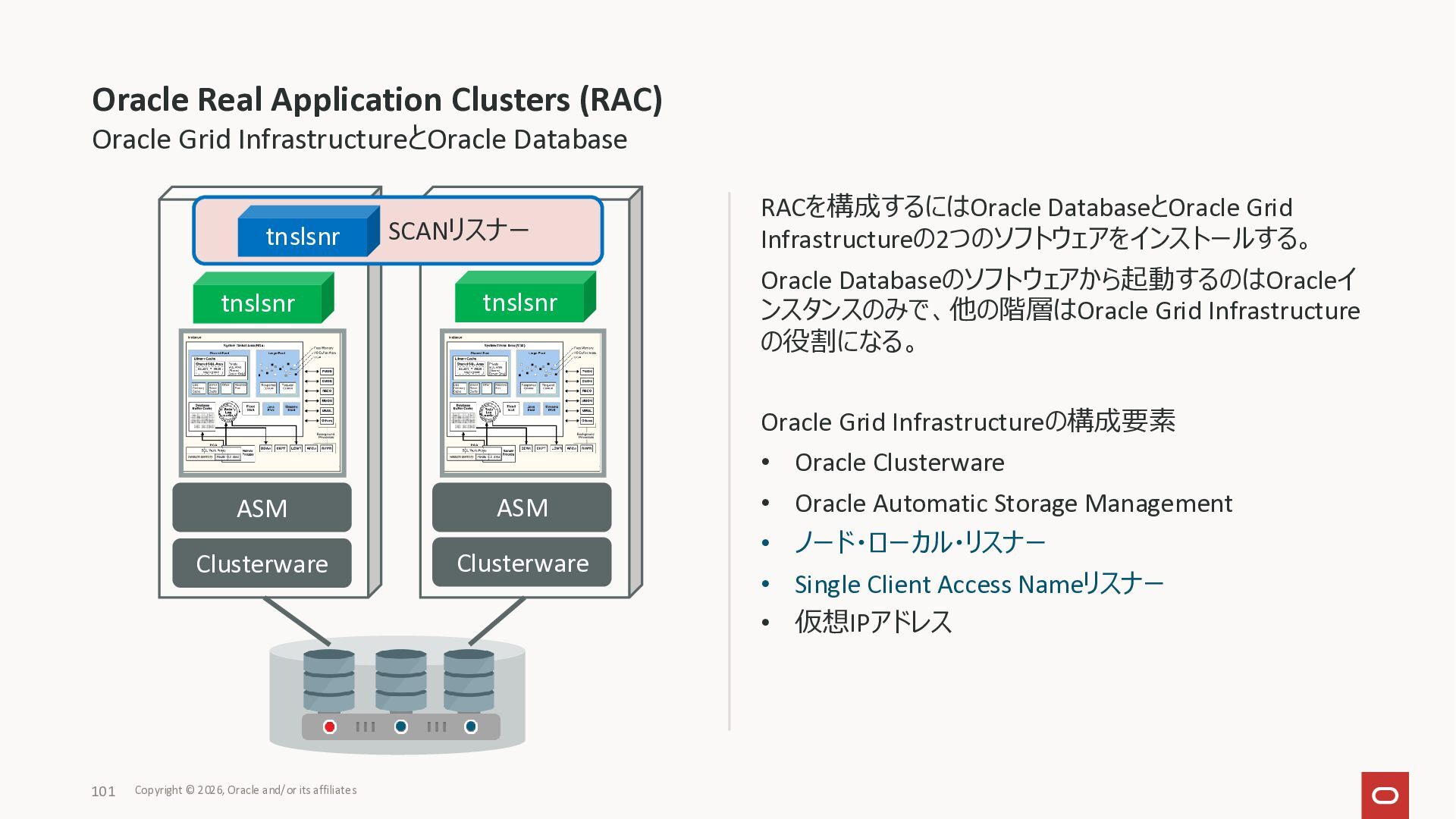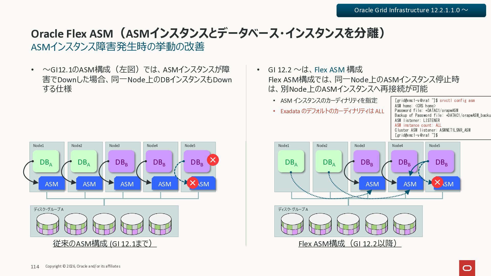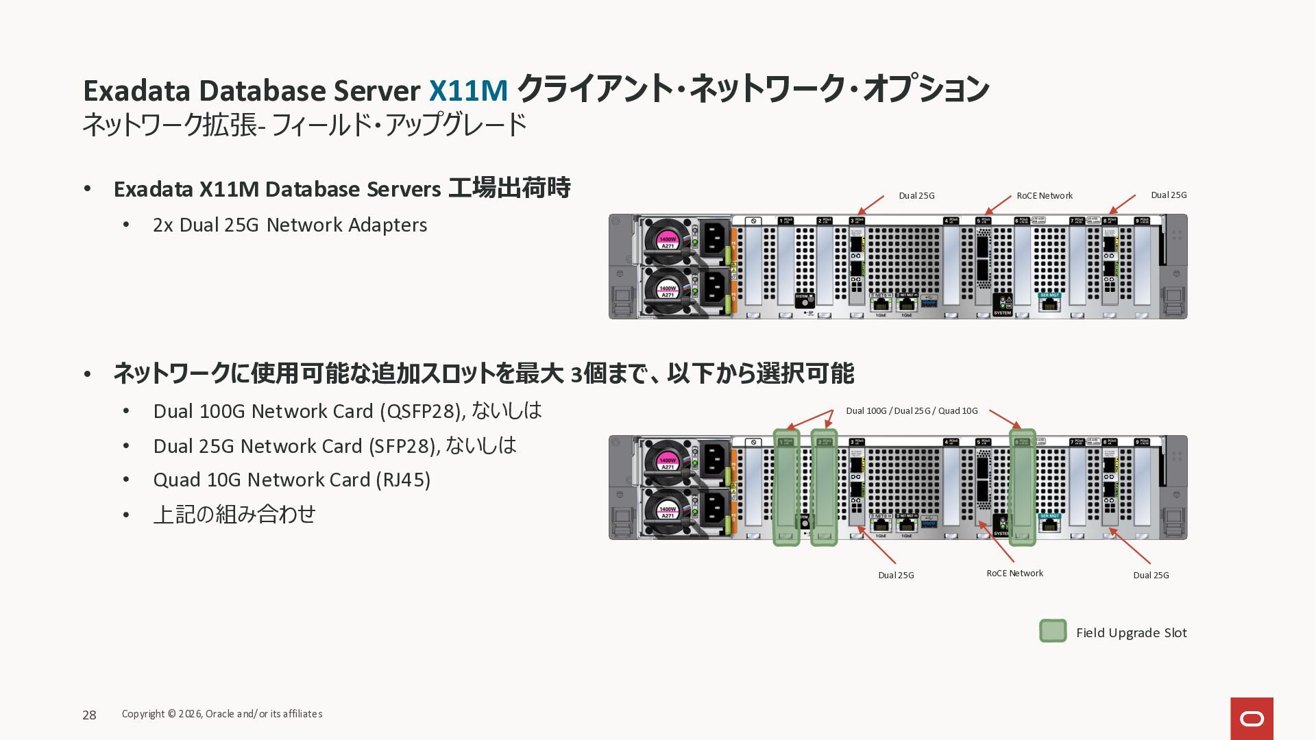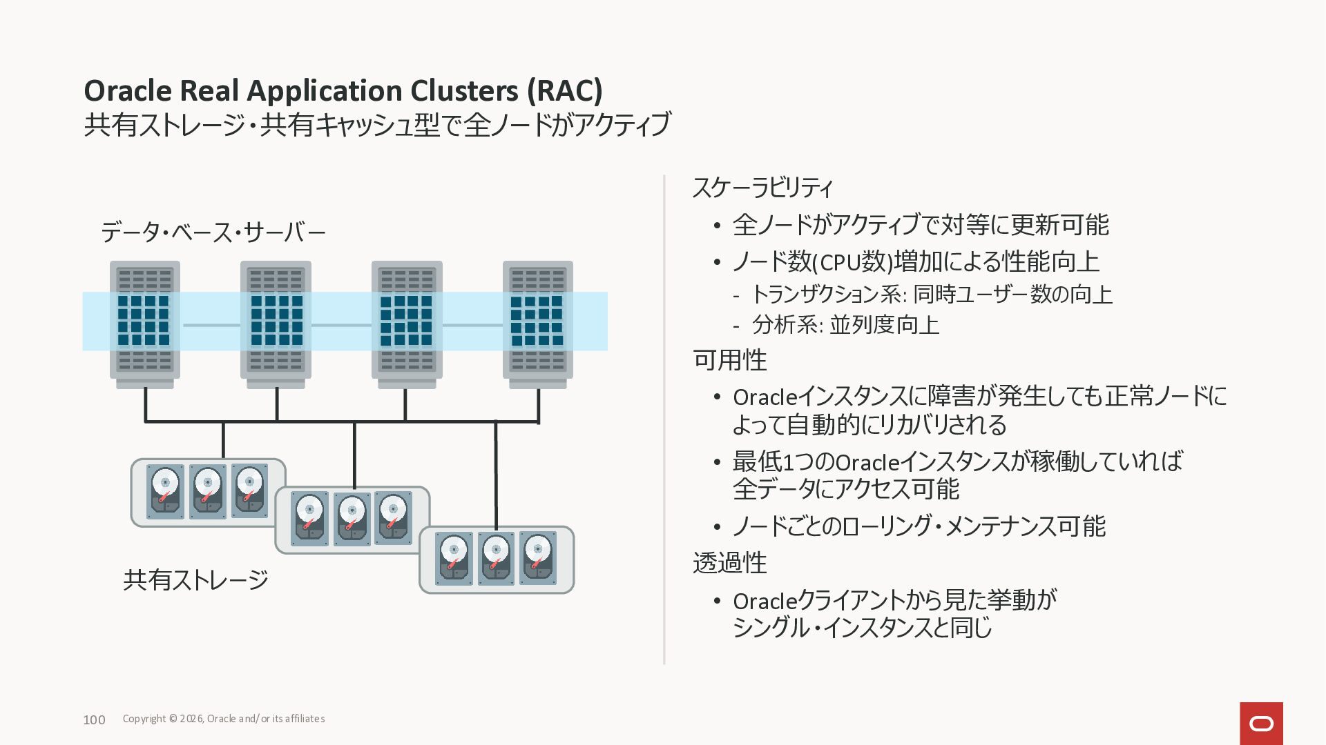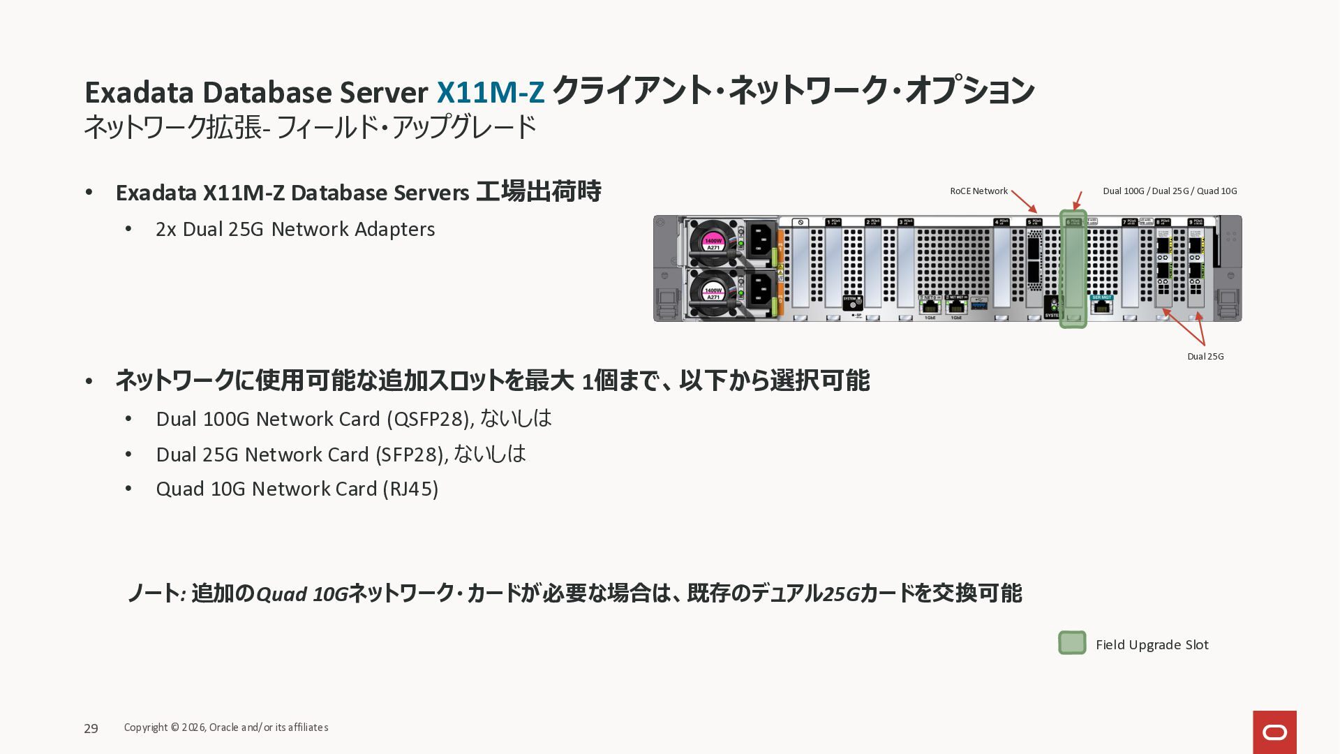 Exadata Exascaleストレージをネイティブにサ ポート • Direct I/OおよびRDMA操作を使用 165 Copyright © 2026, Oracle and/or its affiliates Exadata Storage Exadata Exascale Services と Exadata スマートストレージ機能 Storage Pools, Vault and Volume Management, redundancy and partnering, caching and tiering, file metadata management, snapshots and clones, data integrity, Smart Flash Cache, XRMEM Data Accelerator, Smart Scan, Storage Indexes, Columnar Caching, Bloom filters, 等 Oracle Grid Infrastructure Oracle AI Database 26ai Exadata Compute すべてのExadata Smart Storage機能 が利用可能