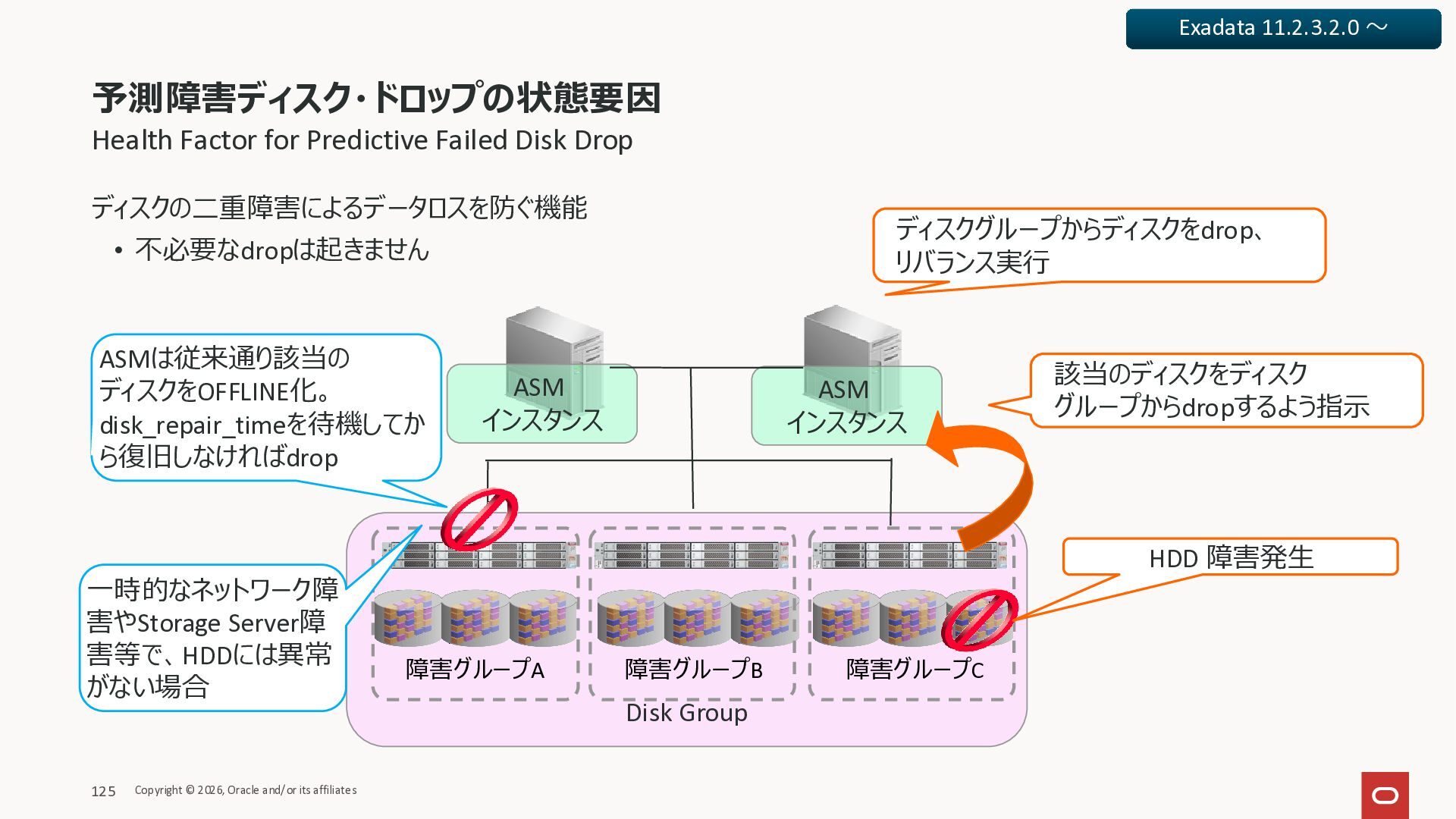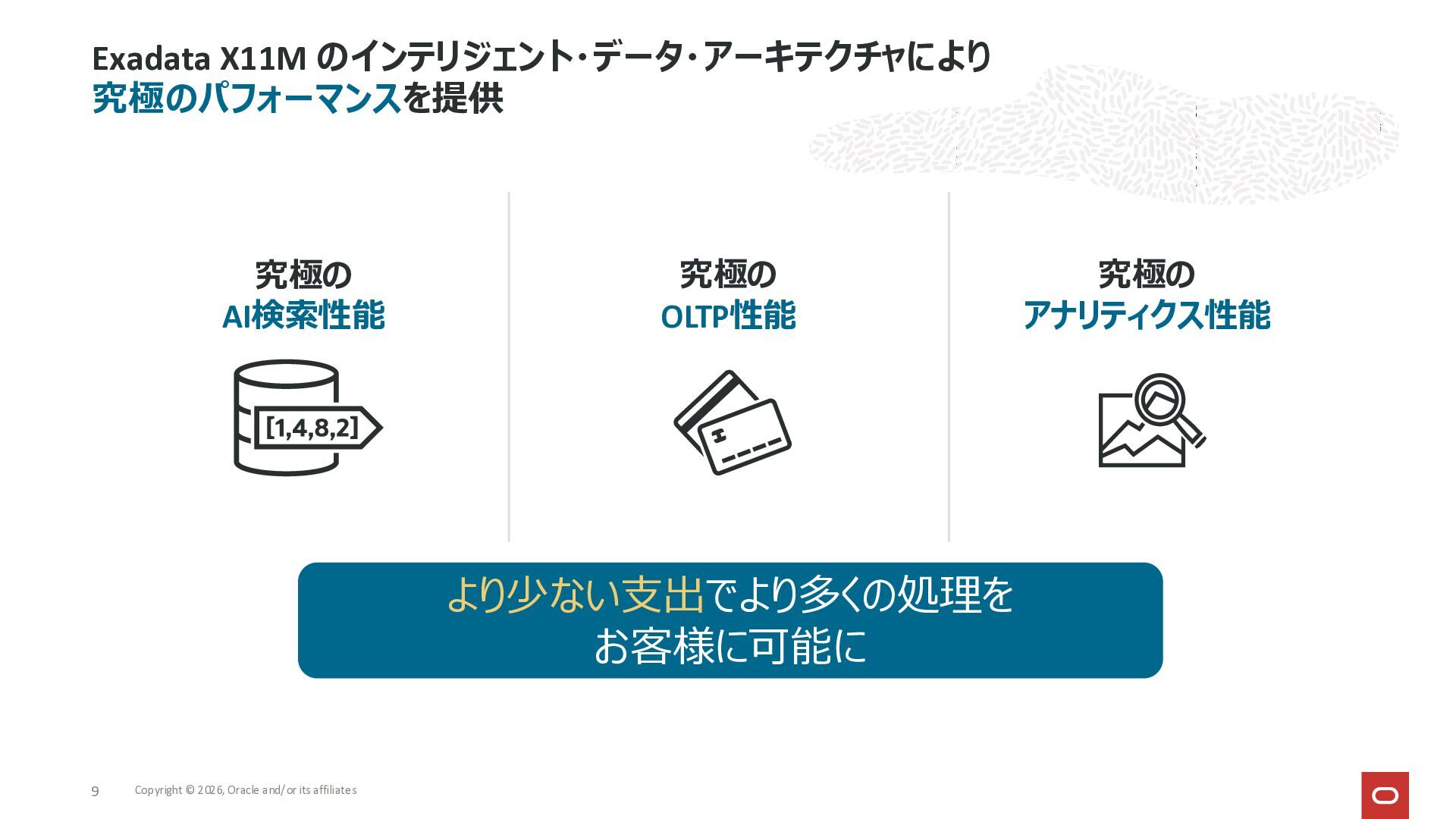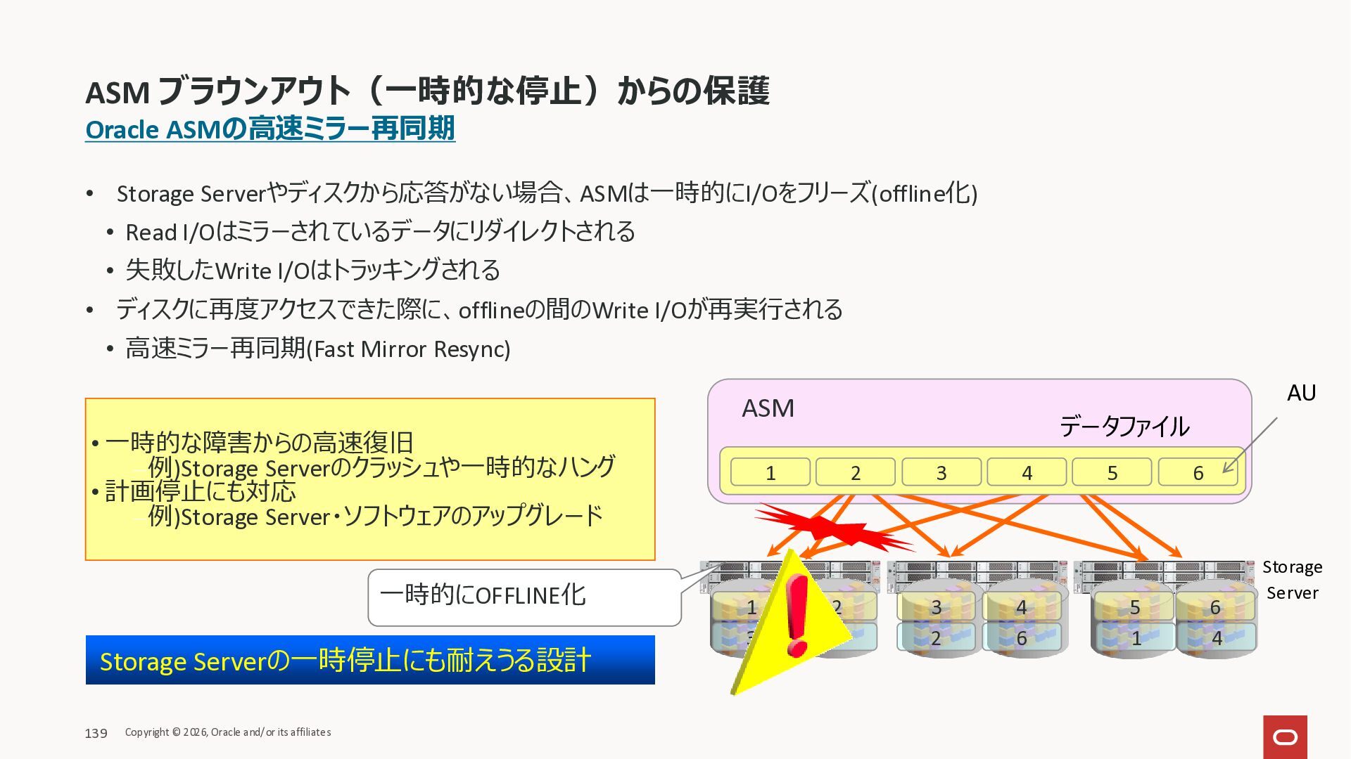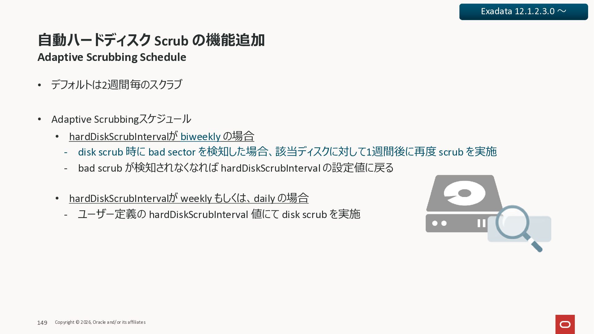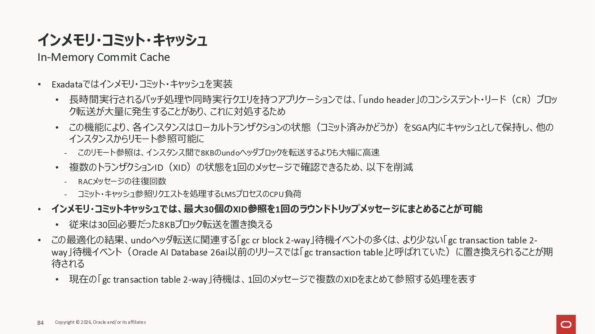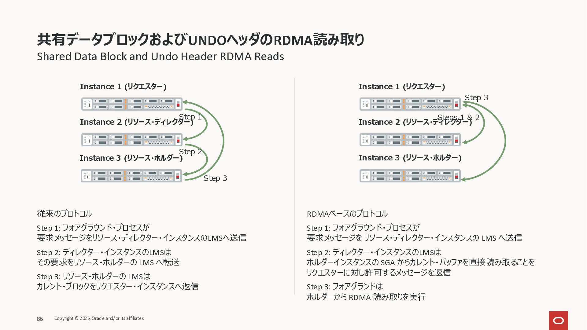 Exadata Exascaleストレージをネイティブにサ ポート • Direct I/OおよびRDMA操作を使用 165 Copyright © 2026, Oracle and/or its affiliates Exadata Storage Exadata Exascale Services と Exadata スマートストレージ機能 Storage Pools, Vault and Volume Management, redundancy and partnering, caching and tiering, file metadata management, snapshots and clones, data integrity, Smart Flash Cache, XRMEM Data Accelerator, Smart Scan, Storage Indexes, Columnar Caching, Bloom filters, 等 Oracle Grid Infrastructure Oracle AI Database 26ai Exadata Compute すべてのExadata Smart Storage機能 が利用可能