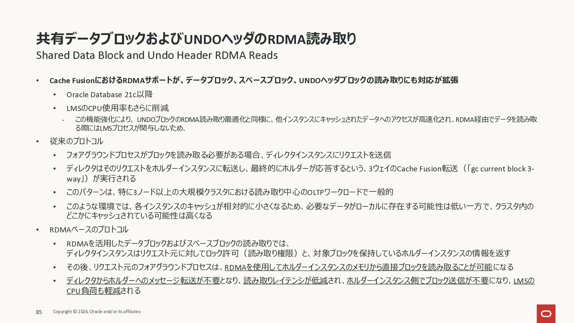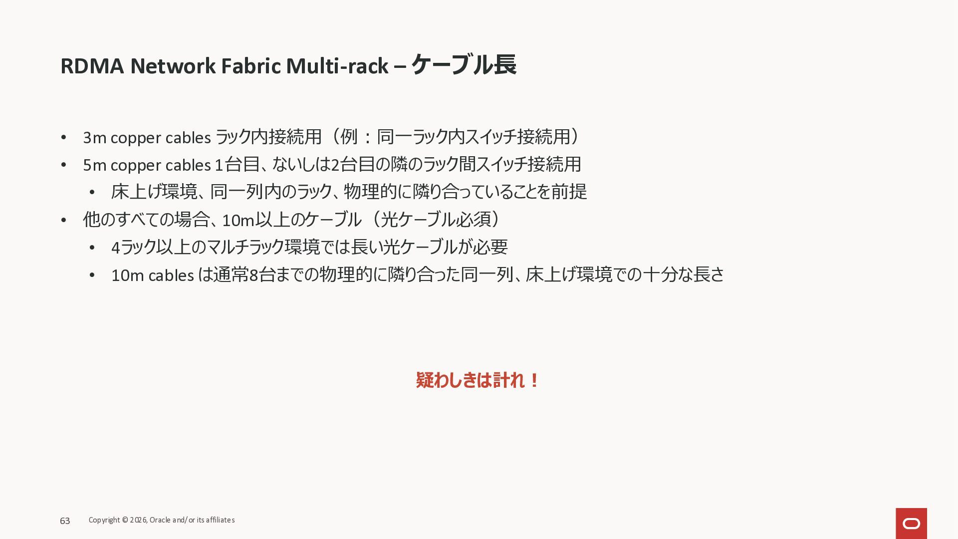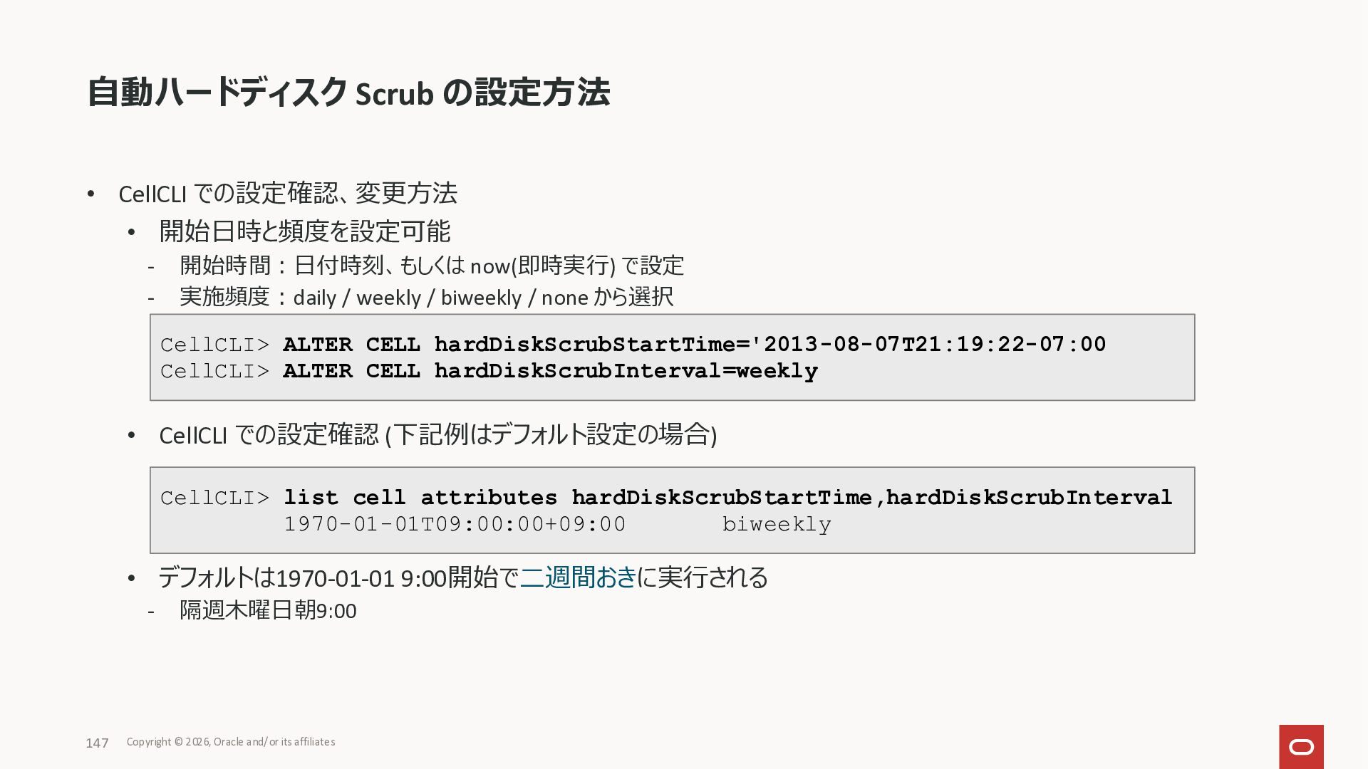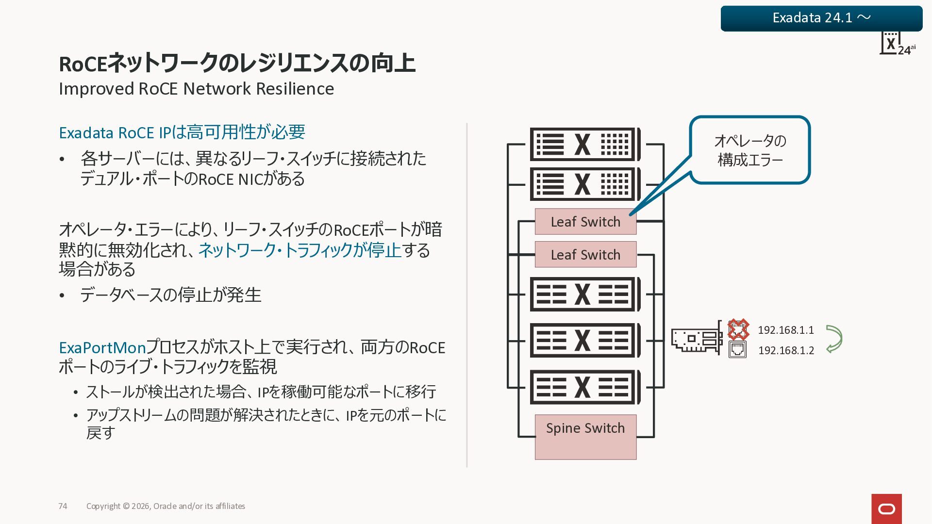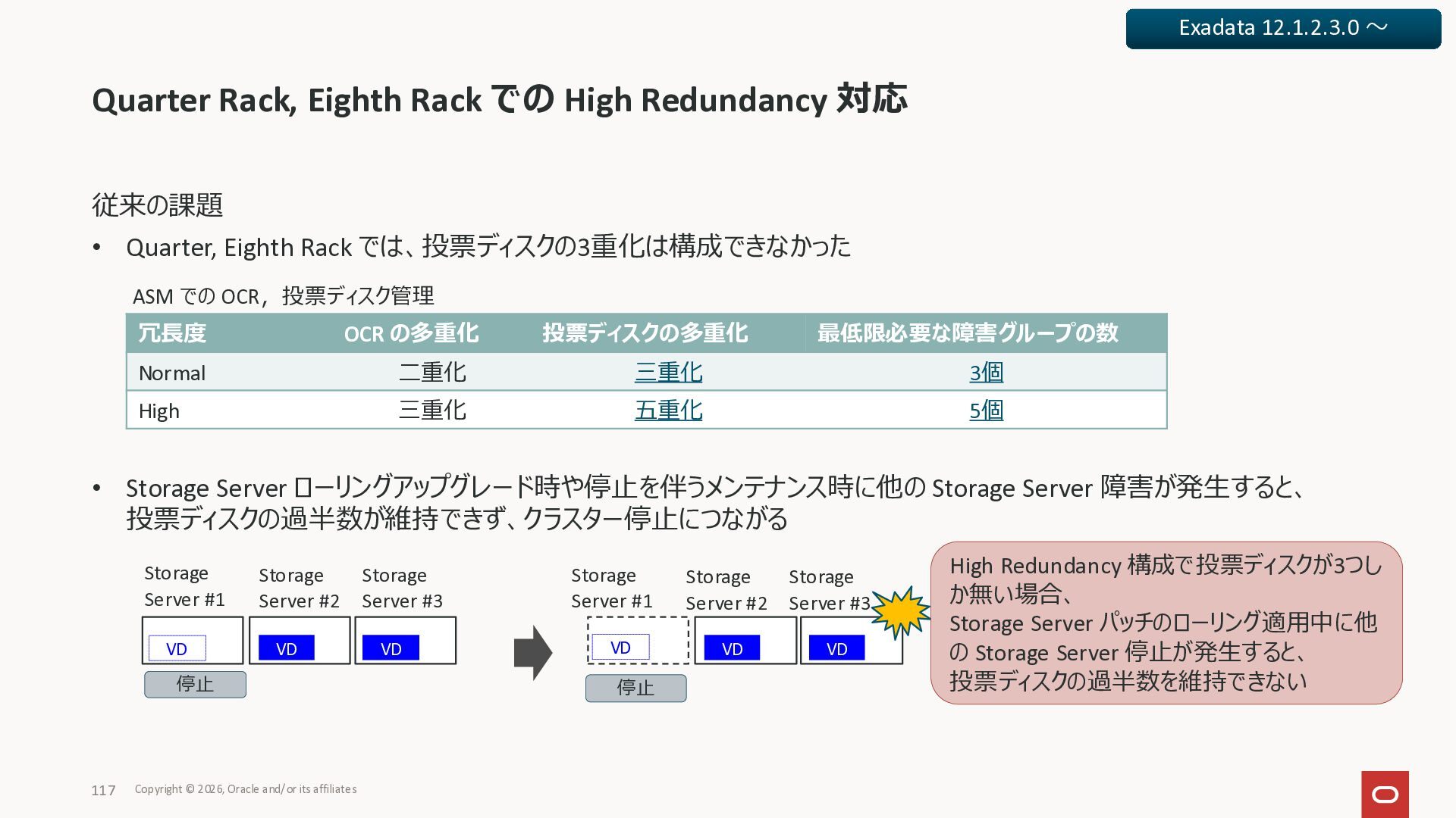 Exadata Exascaleストレージをネイティブにサ ポート • Direct I/OおよびRDMA操作を使用 165 Copyright © 2026, Oracle and/or its affiliates Exadata Storage Exadata Exascale Services と Exadata スマートストレージ機能 Storage Pools, Vault and Volume Management, redundancy and partnering, caching and tiering, file metadata management, snapshots and clones, data integrity, Smart Flash Cache, XRMEM Data Accelerator, Smart Scan, Storage Indexes, Columnar Caching, Bloom filters, 等 Oracle Grid Infrastructure Oracle AI Database 26ai Exadata Compute すべてのExadata Smart Storage機能 が利用可能