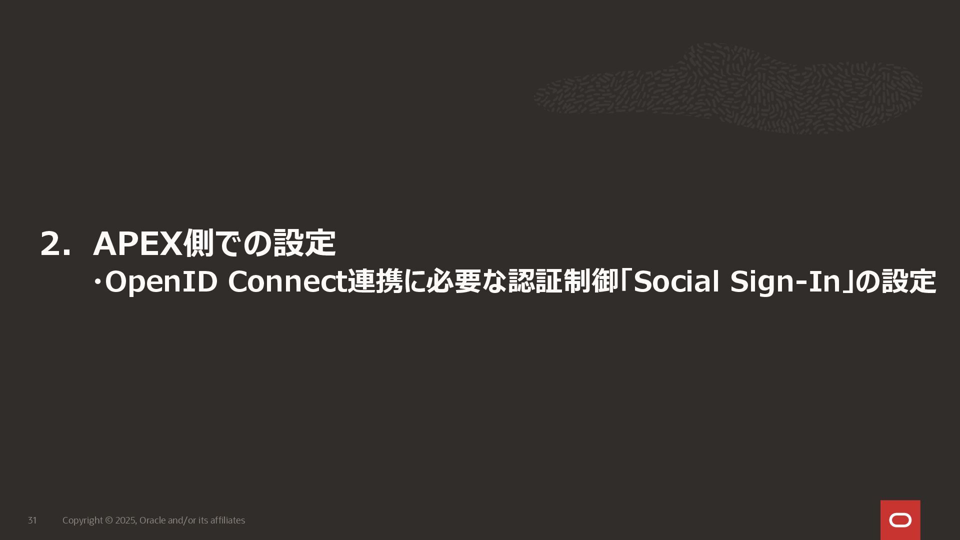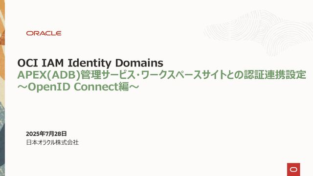 37 4)認証スキームの編集画面にて下記項目を指定し、「変更の適用」を選択します。 ・クライアントID:上記1章で作成した機密アプリケーションのクライアントID ・クライアント・シークレット:上記1章で作成した機密アプリケーションのクライアント・シークレット ・クライアント・シークレットの確認:上記1章で作成した機密アプリケーションのクライアント・シークレット ・Authentication Provider:OpenID Connect Provider ・Discovery URL:上記1章で控えた対象Identity DomainsのURLに「.well-known/openid-configuration」を追加したURL 例) https://idcs-d0e・・・・d9.identity.oraclecloud.com:443/.well-known/openid-configuration ・Scope:profile ・Username Attribute:preferred_username ・Verify Username:いいえ 画面イメージは次ページ参照 本手順では、Username Attributeに「preferred _username」を指定しており、 Identity DomainsユーザーとAPEXユーザーのマッピングは以下のようになります。 ============================== Identity DomainsユーザーのユーザーID = APEXユーザーのユーザーID ==============================