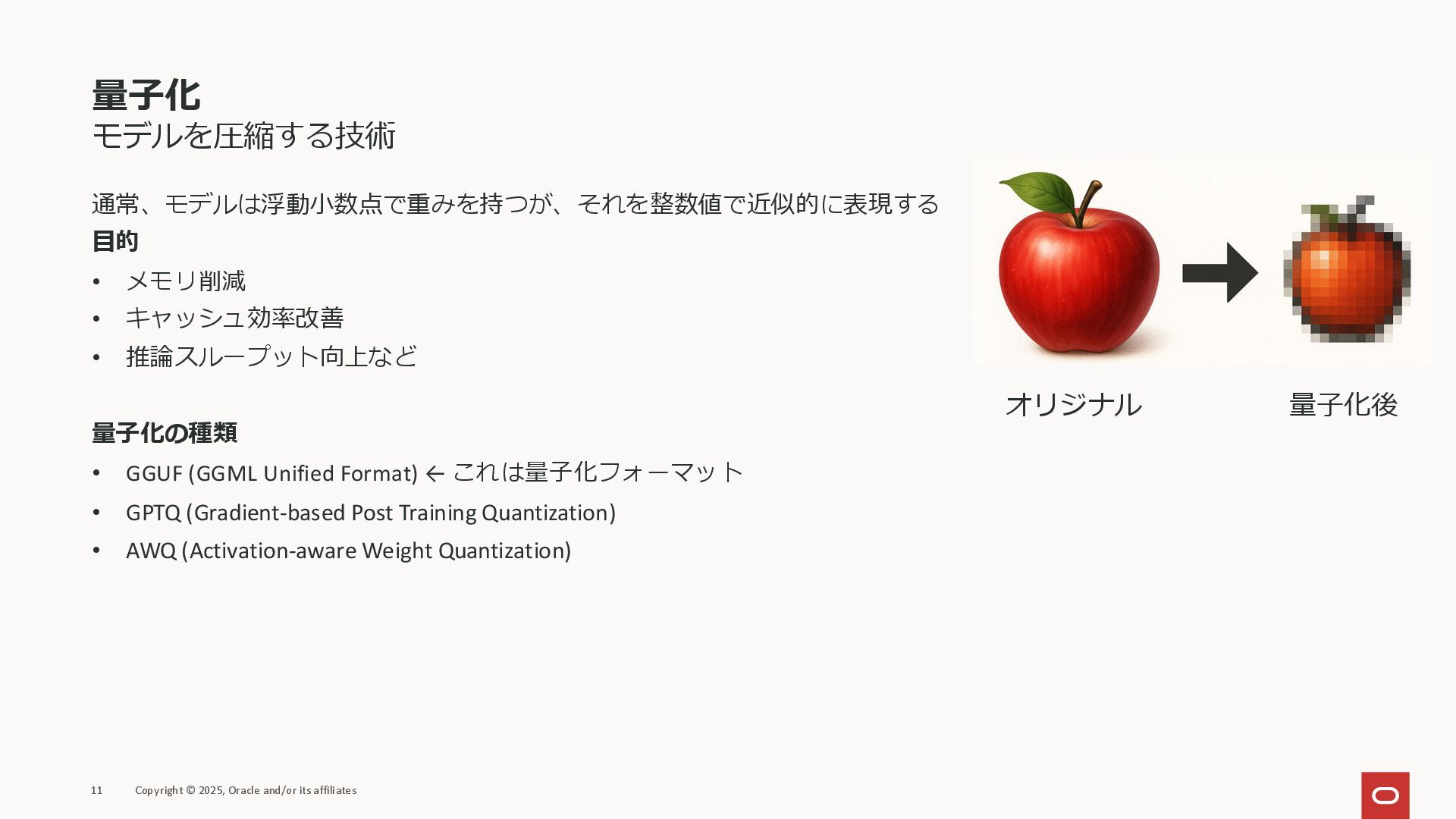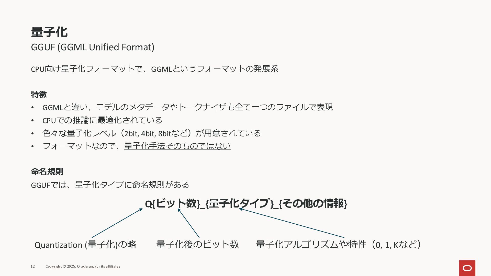 量子化の種類 • GGUF (GGML Unified Format) ← これは量子化フォーマット • GPTQ (Gradient-based Post Training Quantization) • AWQ (Activation-aware Weight Quantization) 11 Copyright © 2025, Oracle and/or its affiliates オリジナル 量子化後