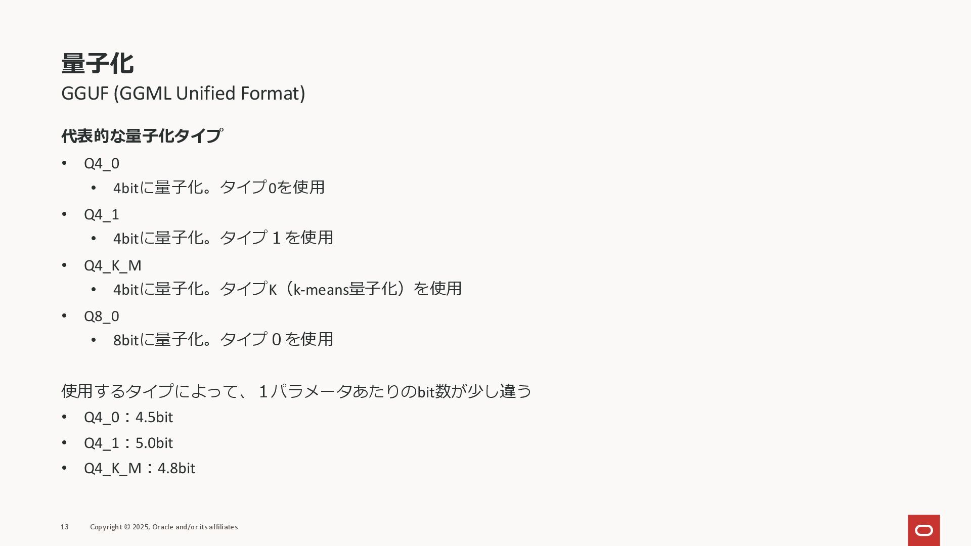CPUでの推論に最適化されている • 色々な量子化レベル(2bit, 4bit, 8bitなど)が用意されている • フォーマットなので、量子化手法そのものではない 命名規則 GGUFでは、量子化タイプに命名規則がある 12 Copyright © 2025, Oracle and/or its affiliates Q{ビット数}_{量子化タイプ}_{その他の情報} Quantization (量子化)の略 量子化後のビット数 量子化アルゴリズムや特性(0, 1, Kなど)