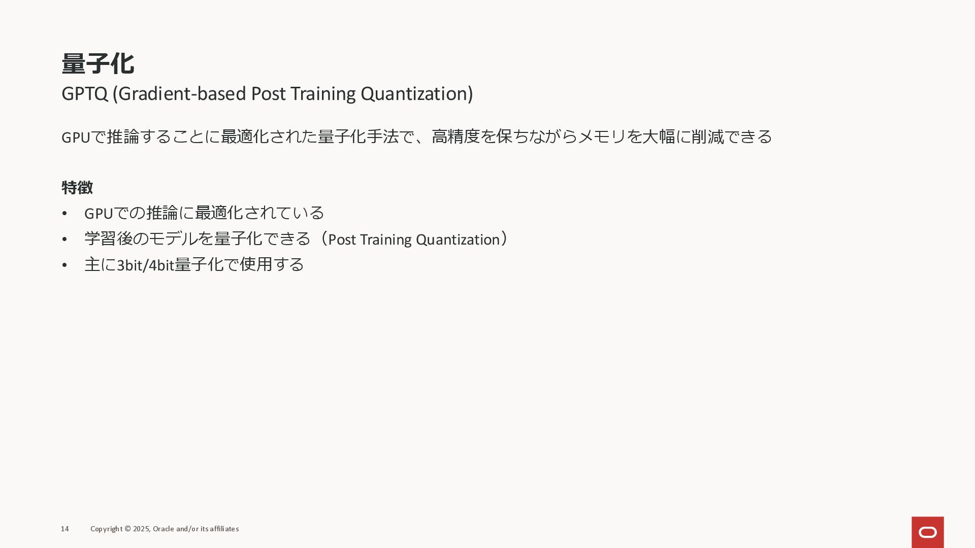 • Q4_1 • 4bitに量子化。タイプ1を使用 • Q4_K_M • 4bitに量子化。タイプK(k-means量子化)を使用 • Q8_0 • 8bitに量子化。タイプ0を使用 使用するタイプによって、1パラメータあたりのbit数が少し違う • Q4_0:4.5bit • Q4_1:5.0bit • Q4_K_M:4.8bit 13 Copyright © 2025, Oracle and/or its affiliates
