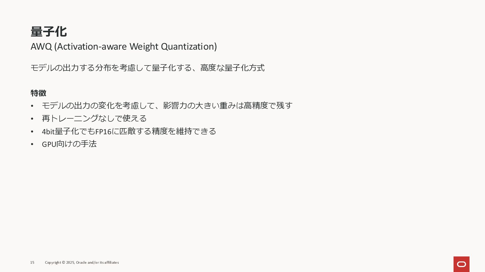 再トレーニングなしで使える • 4bit量子化でもFP16に匹敵する精度を維持できる • GPU向けの手法 15 Copyright © 2025, Oracle and/or its affiliates