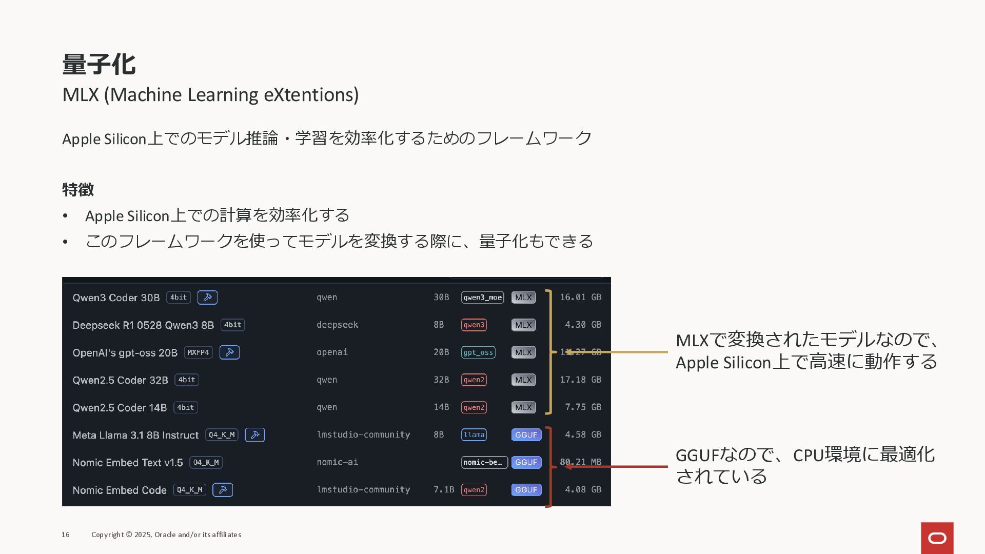 Silicon上での計算を効率化する • このフレームワークを使ってモデルを変換する際に、量子化もできる 16 Copyright © 2025, Oracle and/or its affiliates MLXで変換されたモデルなので、 Apple Silicon上で高速に動作する GGUFなので、CPU環境に最適化 されている