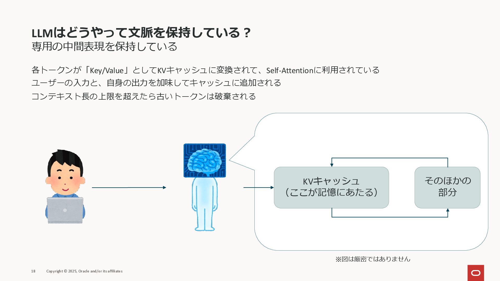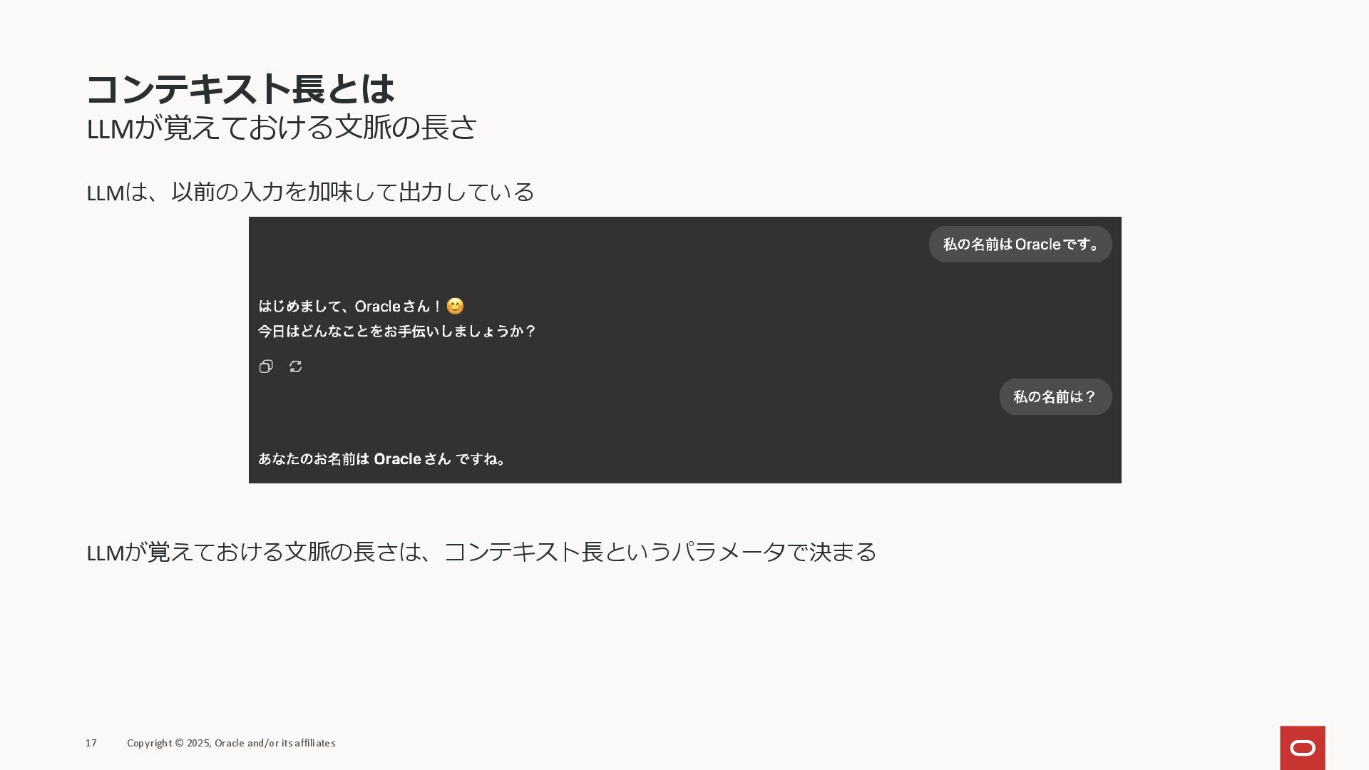 コンテキスト長とは LLMが覚えておける文脈の長さ LLMは、以前の入力を加味して出力している LLMが覚えておける文脈の長さは、コンテキスト長というパラメータで決まる 17 Copyright © 2025, Oracle and/or