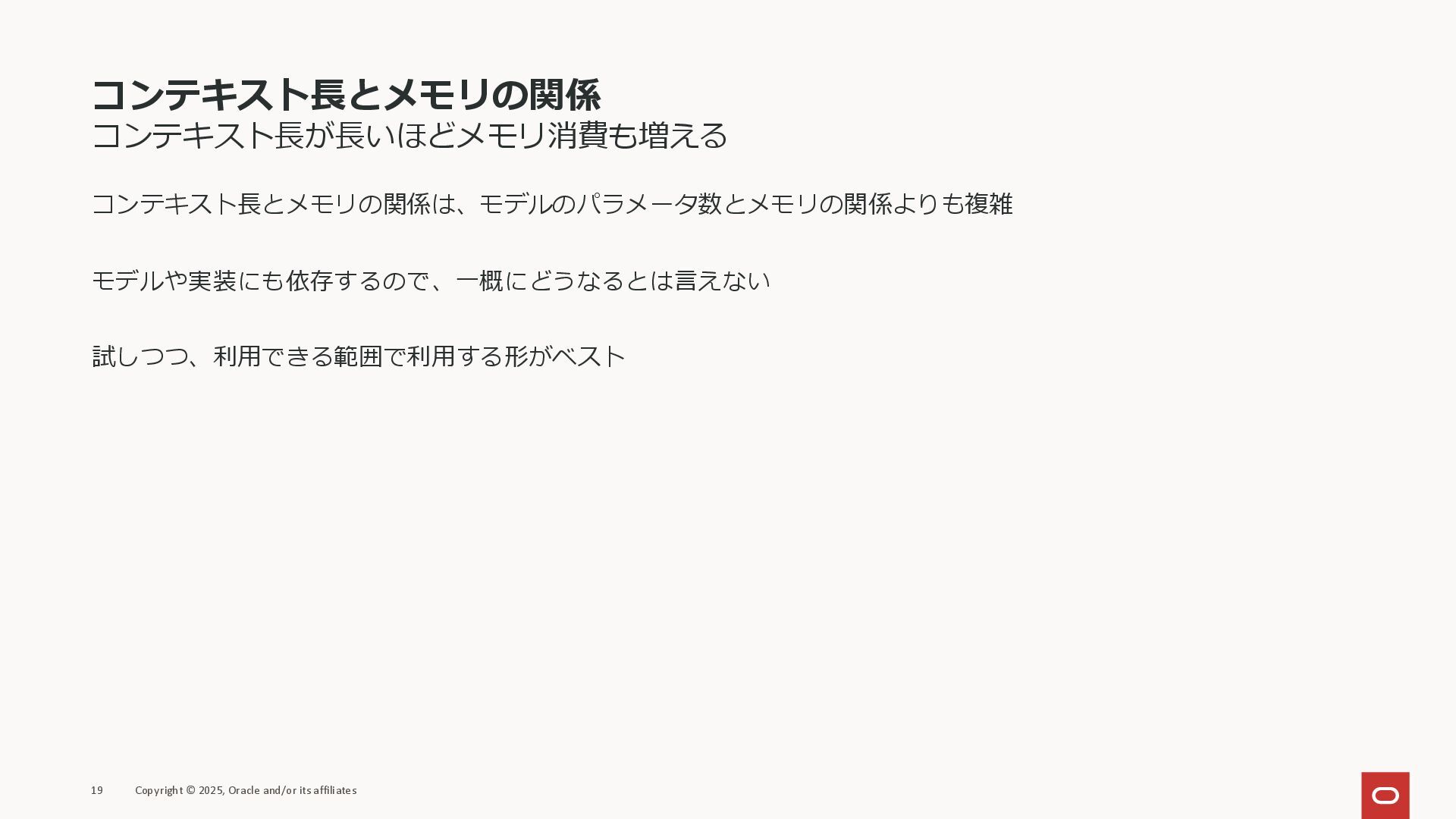 コンテキスト長とメモリの関係 コンテキスト長が長いほどメモリ消費も増える コンテキスト長とメモリの関係は、モデルのパラメータ数とメモリの関係よりも複雑 モデルや実装にも依存するので、一概にどうなるとは言えない 試しつつ、利用できる範囲で利用する形がベスト 19 Copyright © 2025, Oracle