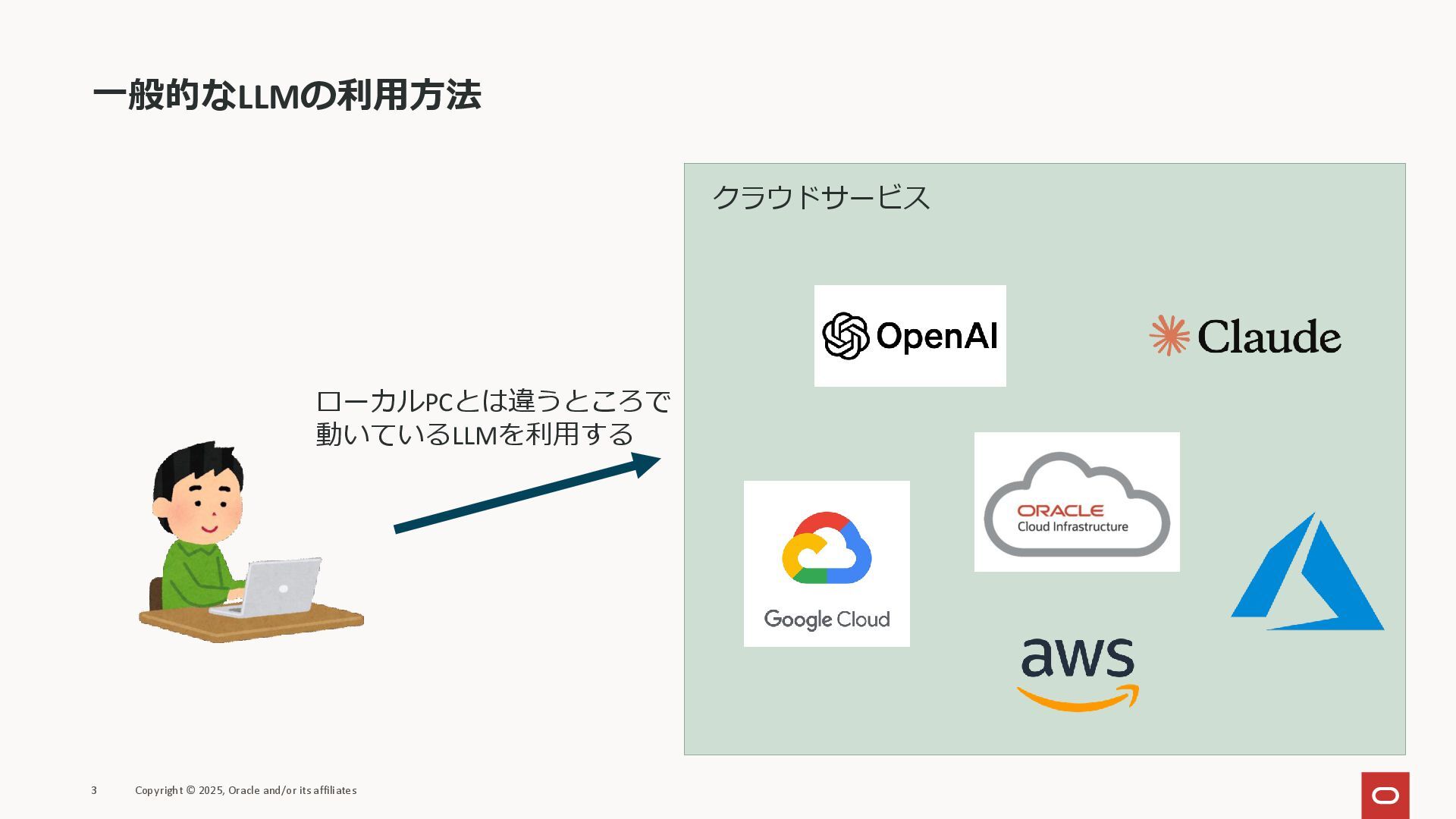 一般的なLLMの利用方法 3 Copyright © 2025, Oracle and/or its affiliates クラウドサービス
