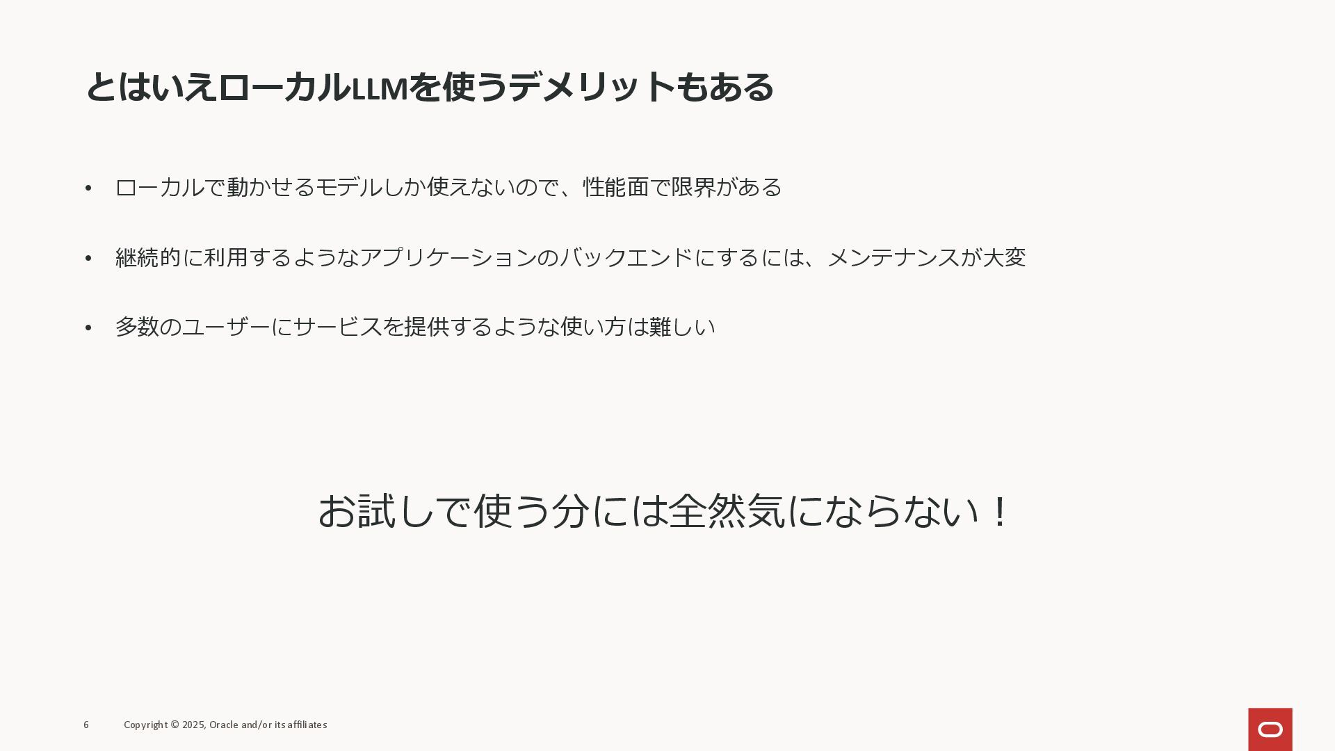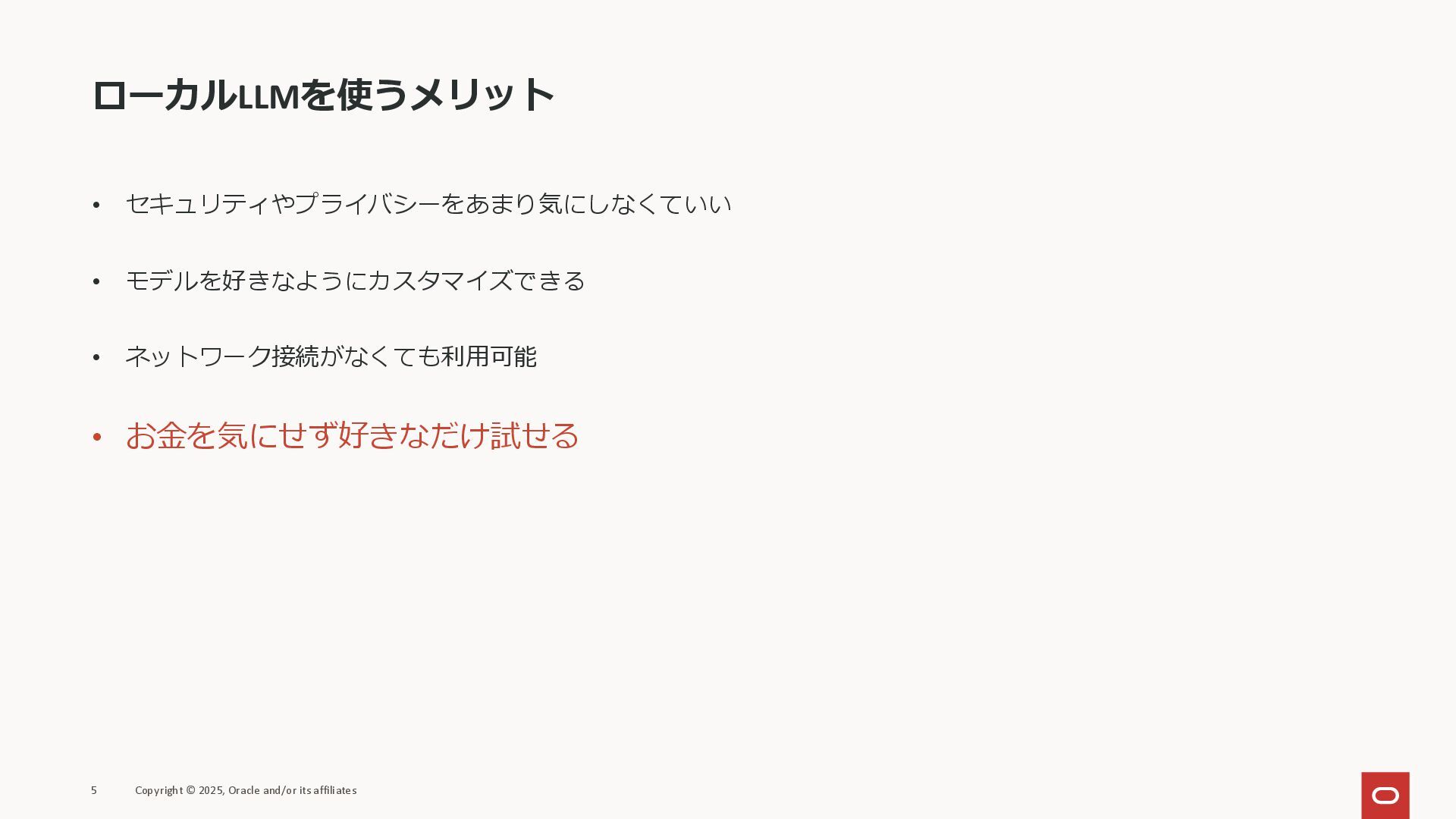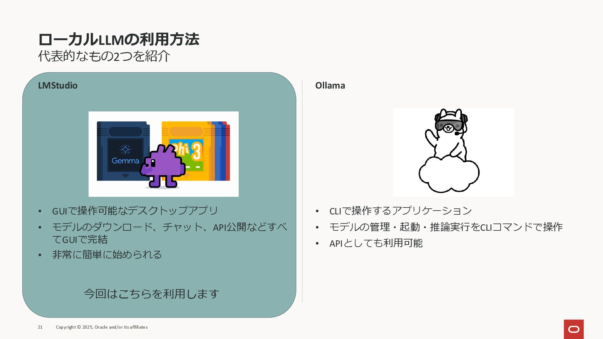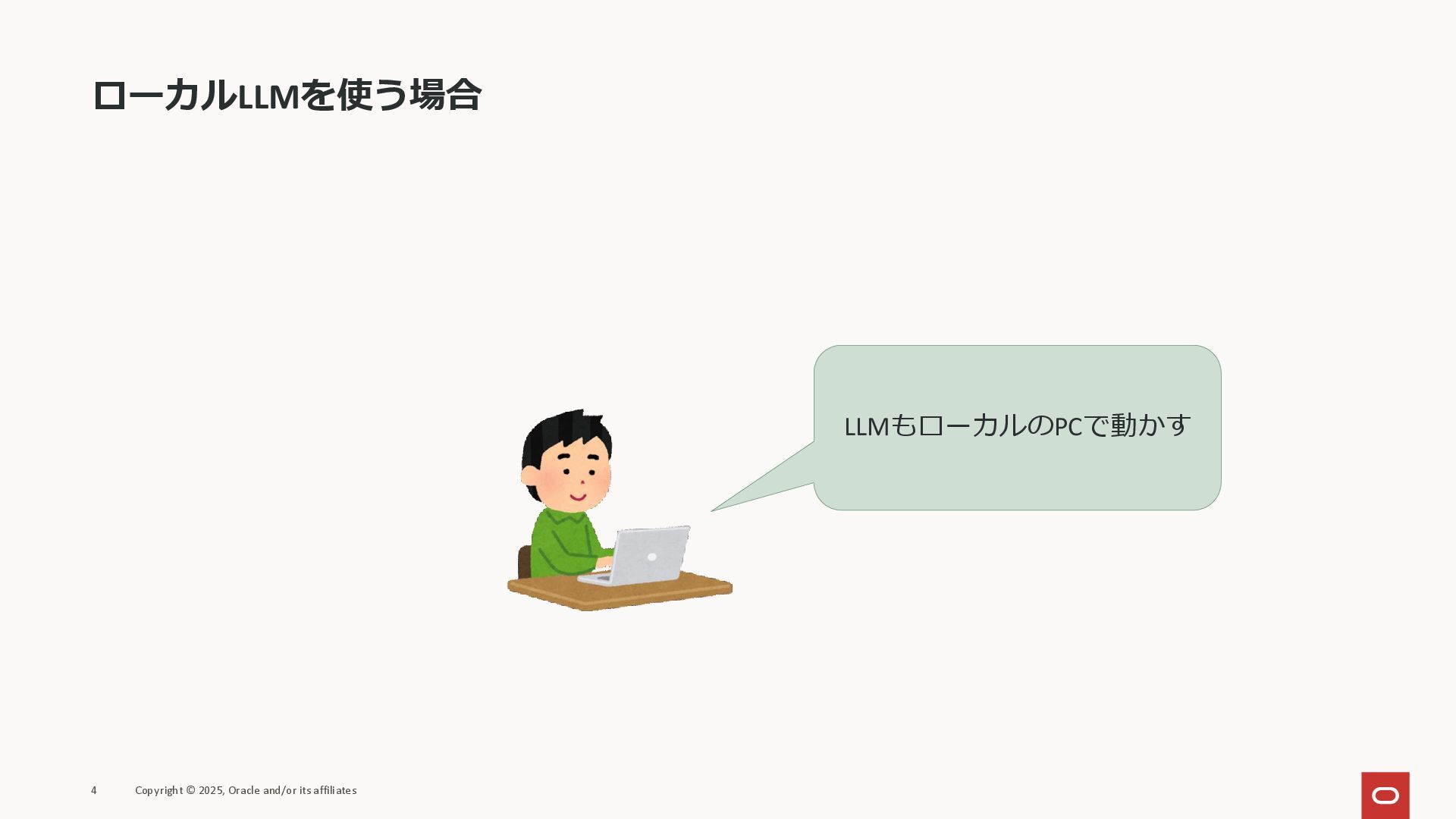 ローカルLLMを使う場合 4 LLMもローカルのPCで動かす Copyright © 2025, Oracle and/or its affiliates
