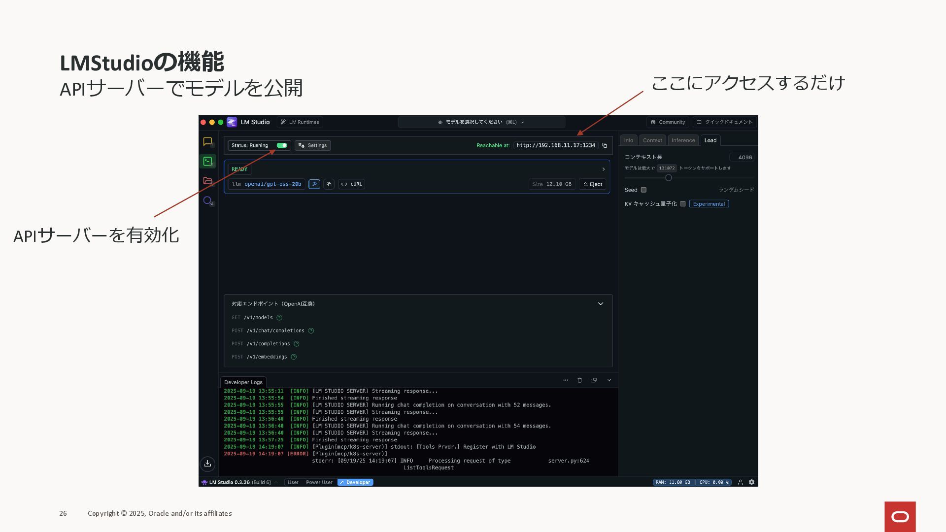 LMStudioの機能 APIサーバーでモデルを公開 26 Copyright © 2025, Oracle and/or its affiliates