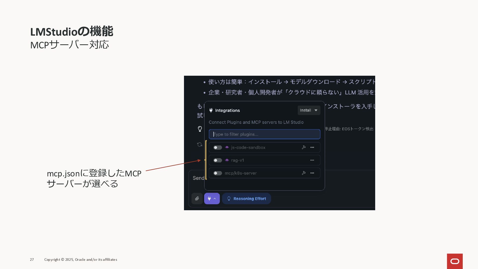 LMStudioの機能 MCPサーバー対応 27 Copyright © 2025, Oracle and/or its affiliates